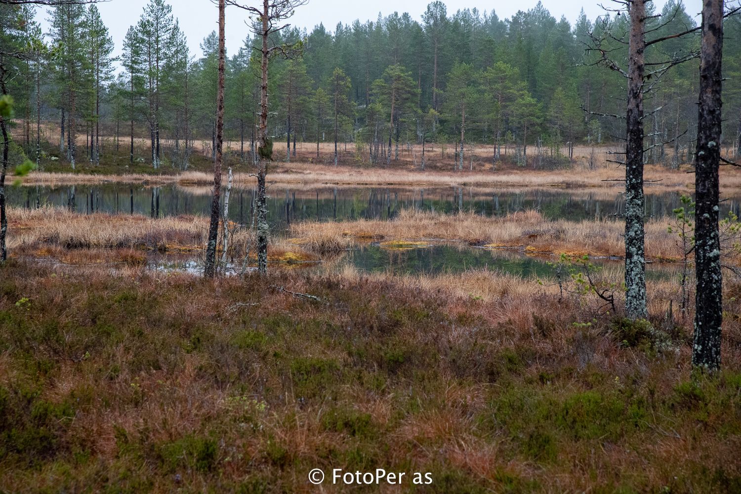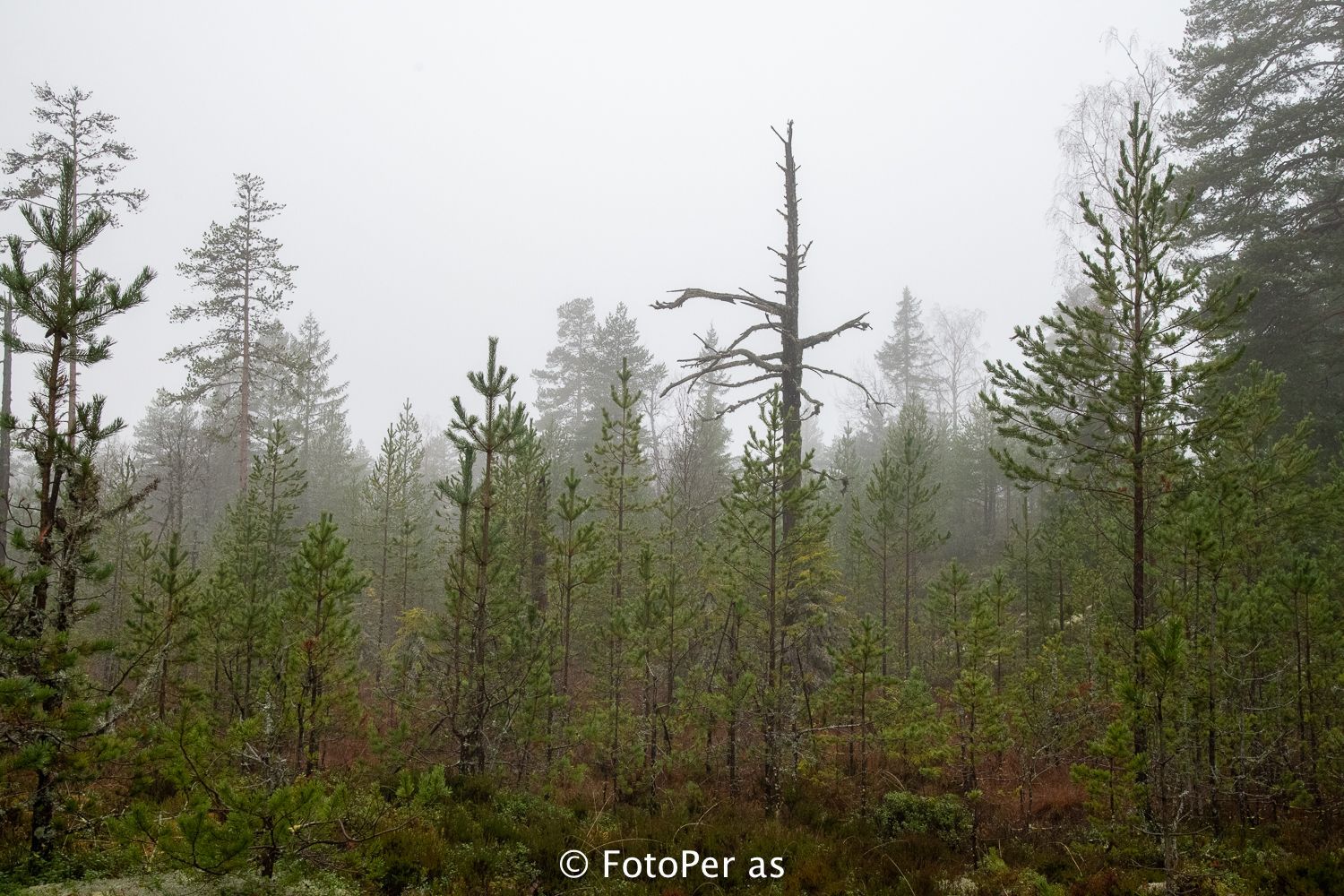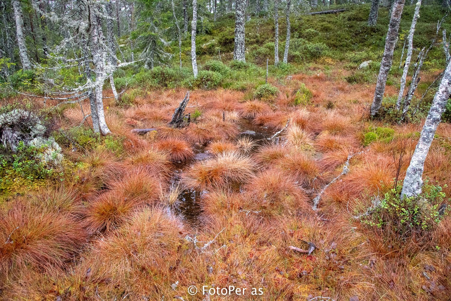 Fine høstfarger i tåka, men tungt å gå i det våte terrenget.