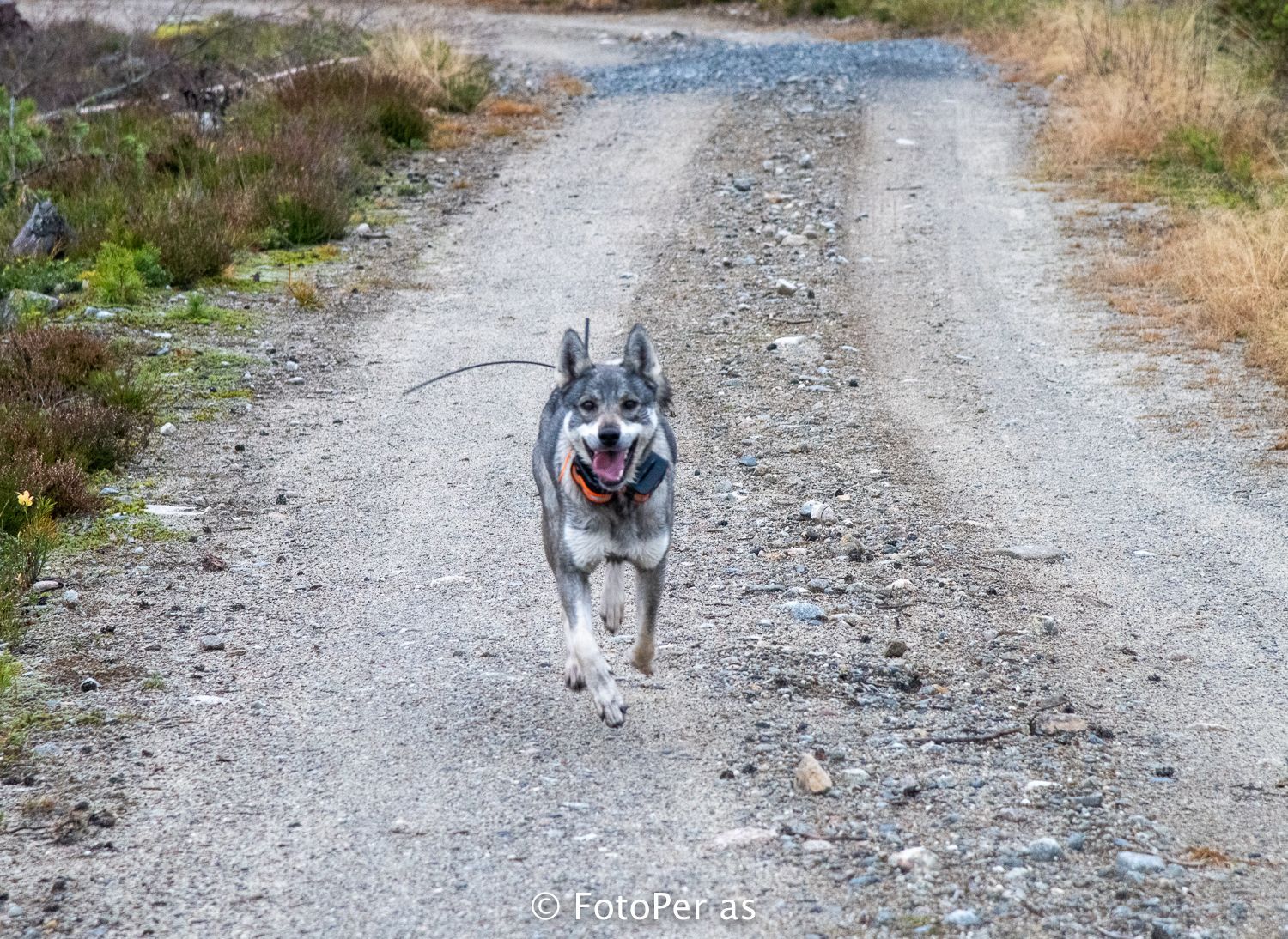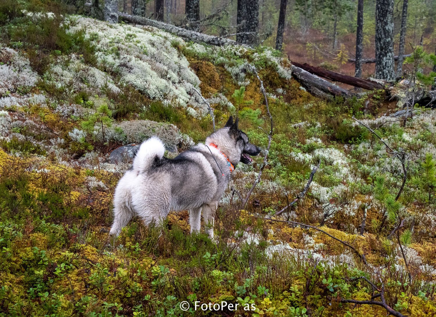 Hero fyker rundt, men kommer innom oss med jevne mellomrom. -Finn elgen, kommanderer OA. Hero står og ser og lytter før han raser videre. Vi pakker sammen og rusler videre.