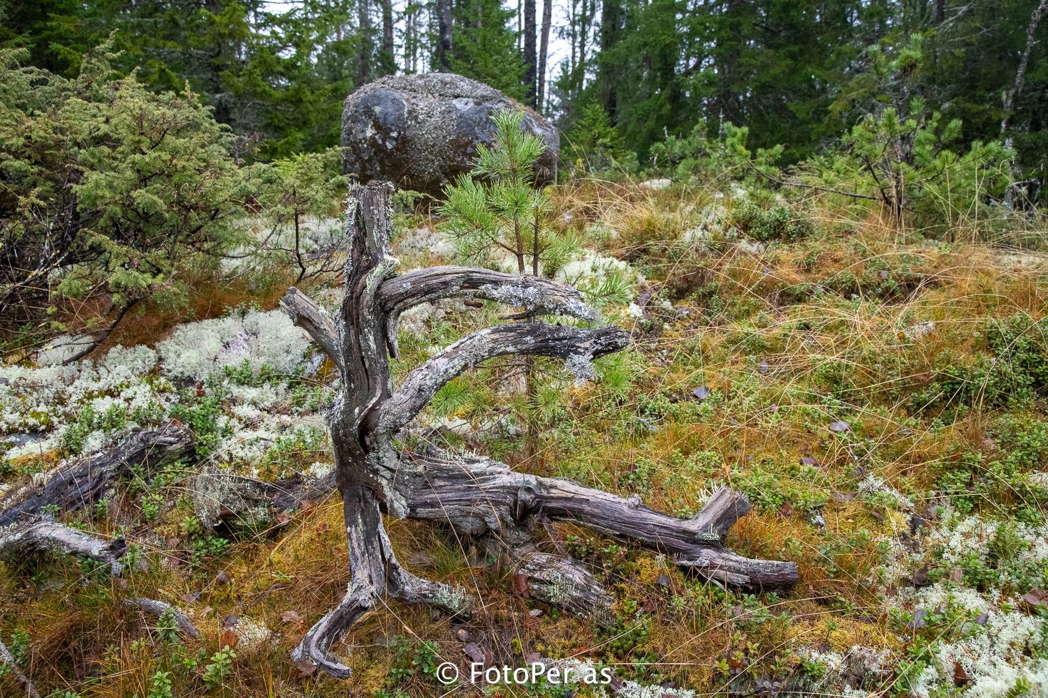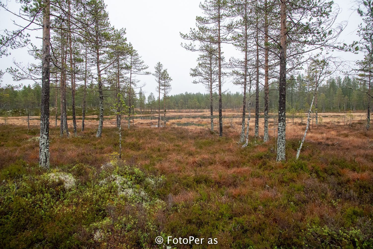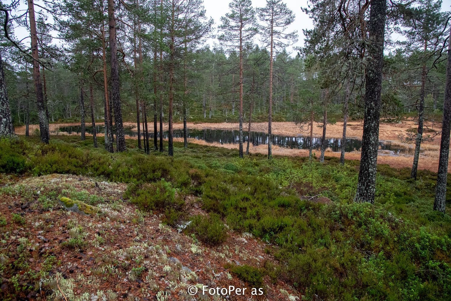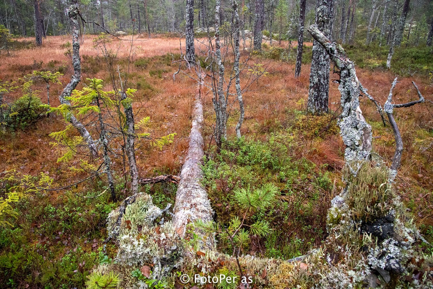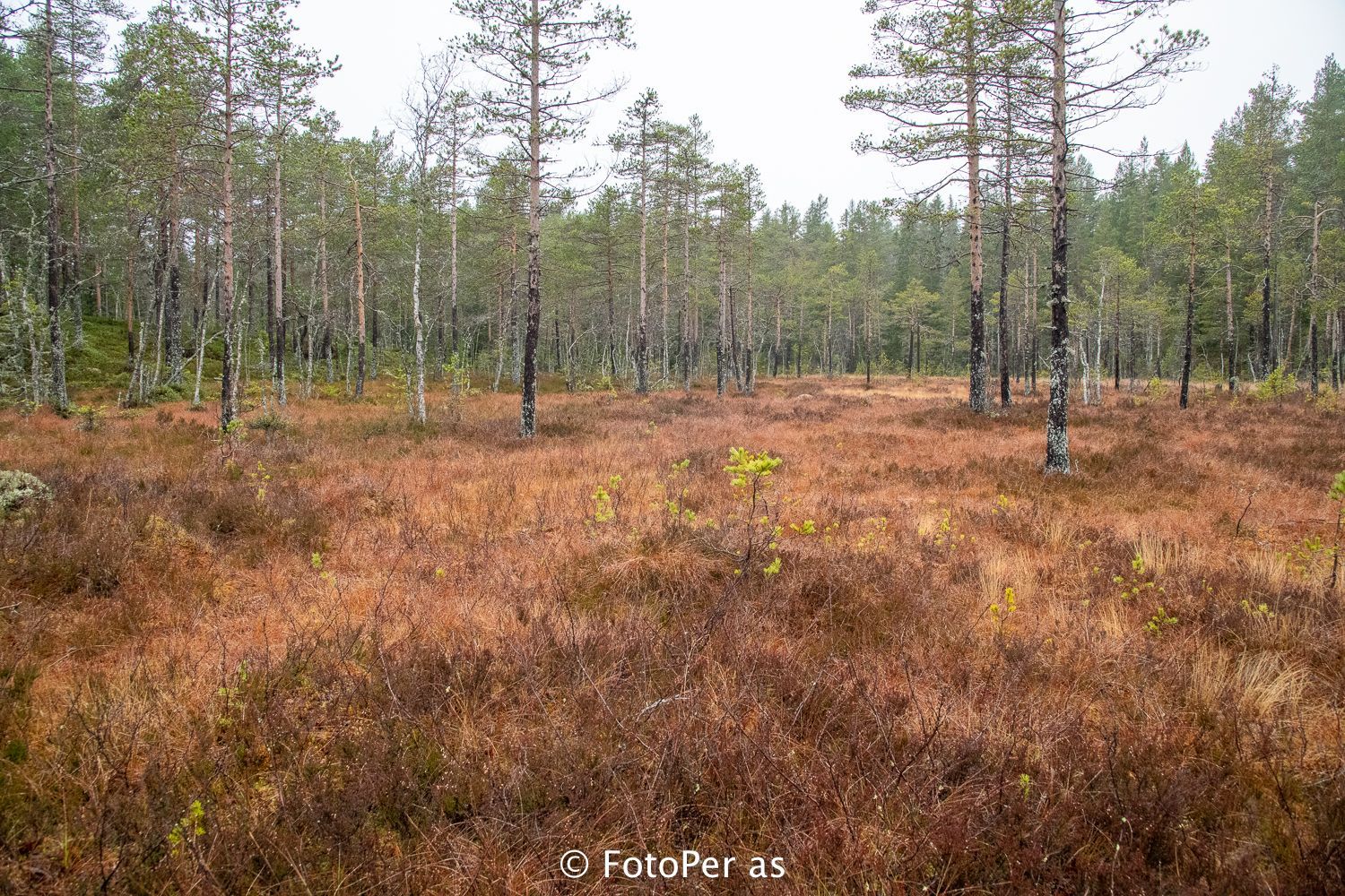 Skogen endrer seg fra luftig furuskog til tettere skog med mer gran, men også noen steder med store løvtrær.