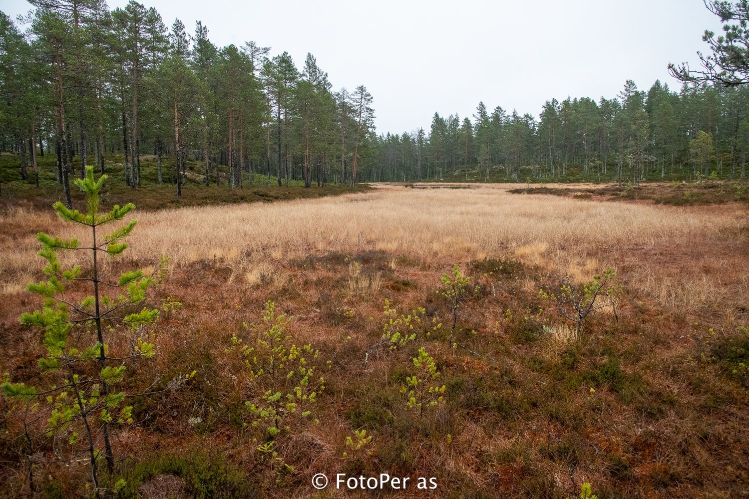 Starten på turen er bratt og ulendt, rett gjennom et hogstsfelt med trær og kvister alle veier. Hero hopper elegant over og er snart oppe. Terrenget her er ganske åpent med lyng, furuskog, myrer og små tjern. Det er kliss vått å gå, det surkler når vi går.