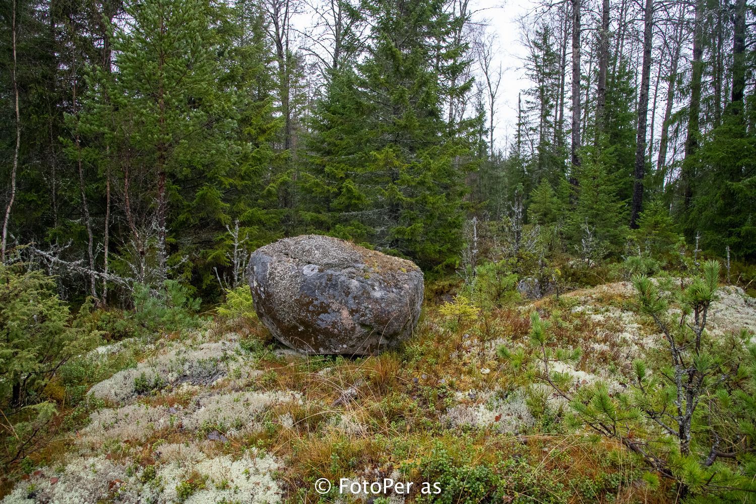 En stein ligger her alene midt inne i skogen, ser noe feilplassert ut. Vi står på en liten høyde og ser ned i tett skog. Hero gjør jobben sin og søker gjennom den, uten å finne noen luktespor.