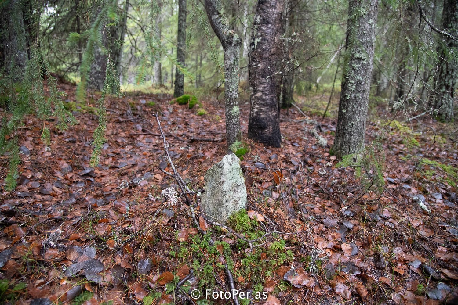 Inne i skauen står det en liten stein alene. En grensestein? OE sjekker på kartet, og bekrefter at det er det.