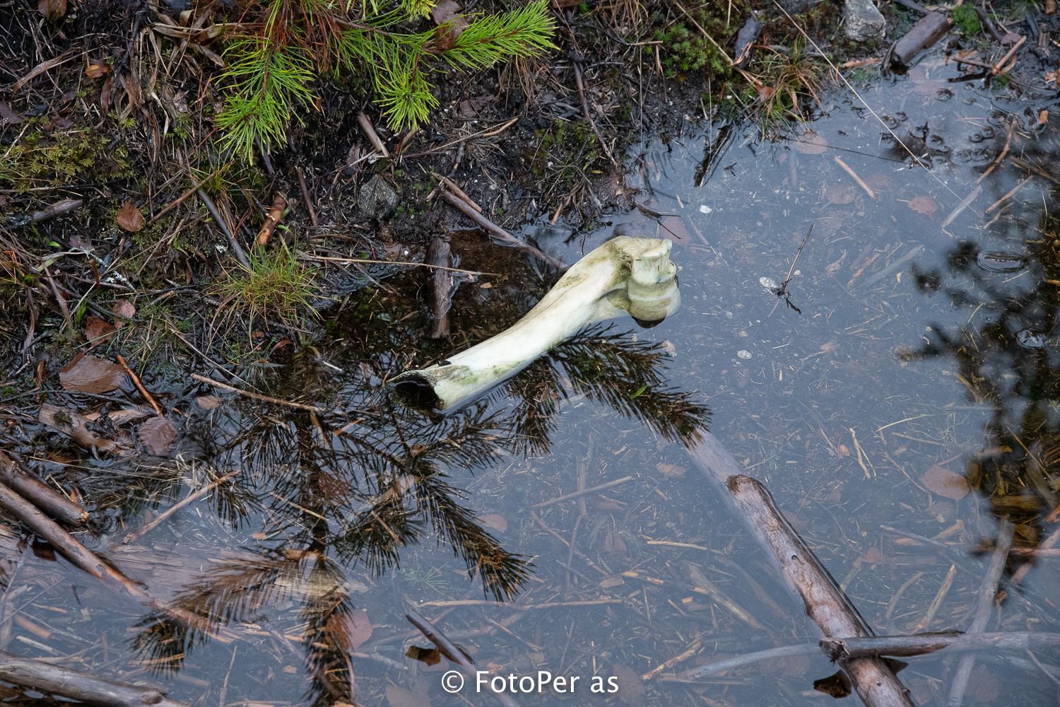 Vi ser tydelige spor etter elg i en vanndam, deler av et bein ligger i vannet.