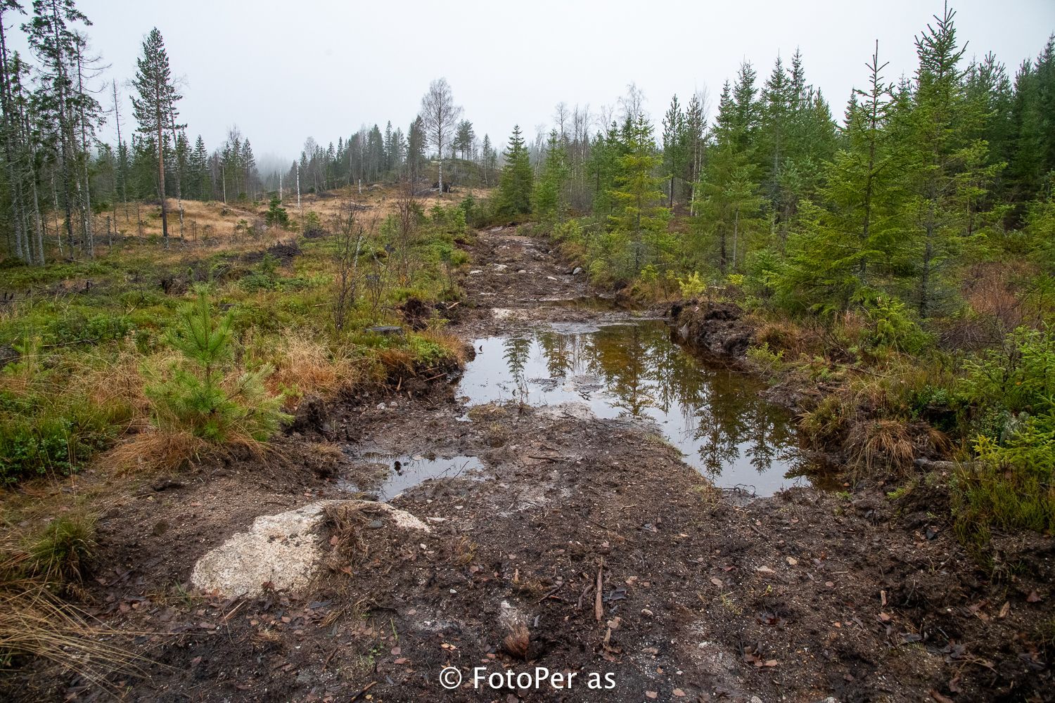 Nå har vi kommet inn i et område i nærheten av Rognlihøgda. Her går det en vei som er anlagt i forbindelse med skogsdrift, og vi går på den. Plutselig forsvinner det ene beinet til OE ned i bakken til over kneet. Veien ser fin ut, men etter alt regnet er det bare gjørme under, og vi kommer oss raskt utenfor veien. OE finner et myrhull og får vasket av seg jorda.