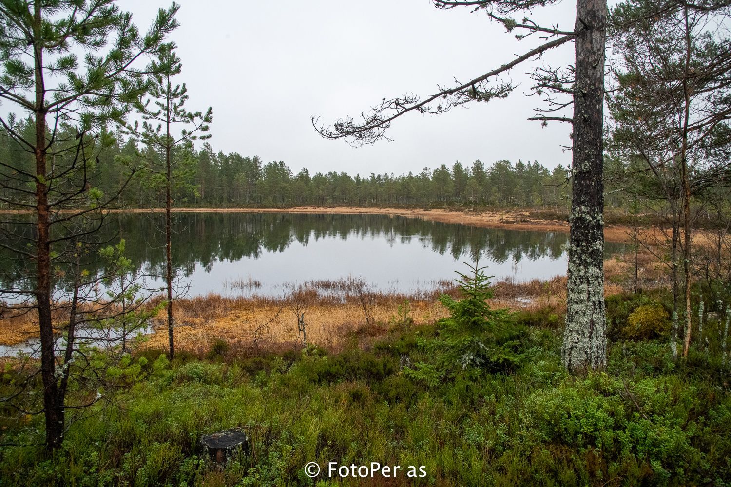 Et nytt tjern kommer til syne, Tjernbråtatjern. Det er blikkstille på vannet.
