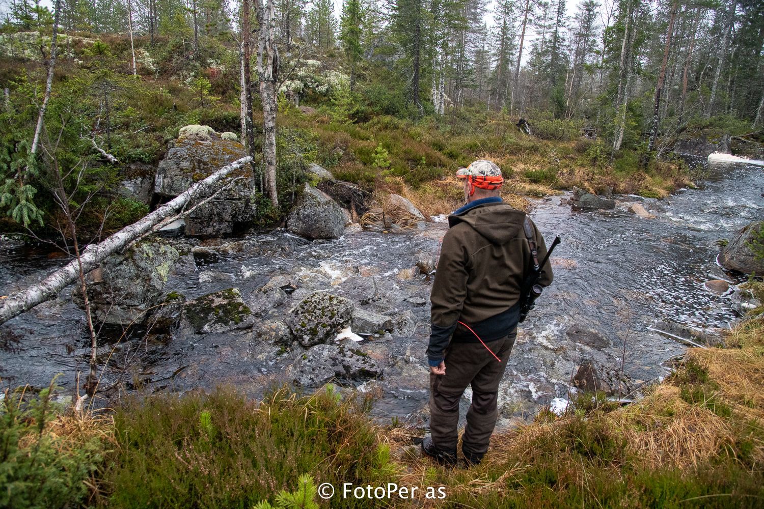 Kai er også med til Andersbu. Elling, jemthunden Gunhild og jeg skal sydover mot enden av Øvre Kollsjø. Kai skal sitte på post i bakkant, i tilfelle elgen snur og går bak oss. De andre er postert lenger nedover på ruta. Først må vi over ei lita elv. Det vil si, nå er den ikke så liten. Vi finner et sted som har ganske greit med steiner spredt og som vi kan hoppe over på. Jeg tar kamera rundt halsen og begynner å gå. Elling står midt ute i elva og holder fram ei hand til hjelp. Plutselig kommer Gunhild hoppende, hun skal jo også over. Det blir litt hastverk og jeg plumper uti med det ene beinet, men er så raskt oppe igjen at jeg rekker ikke å bli våt nede i støvelen.