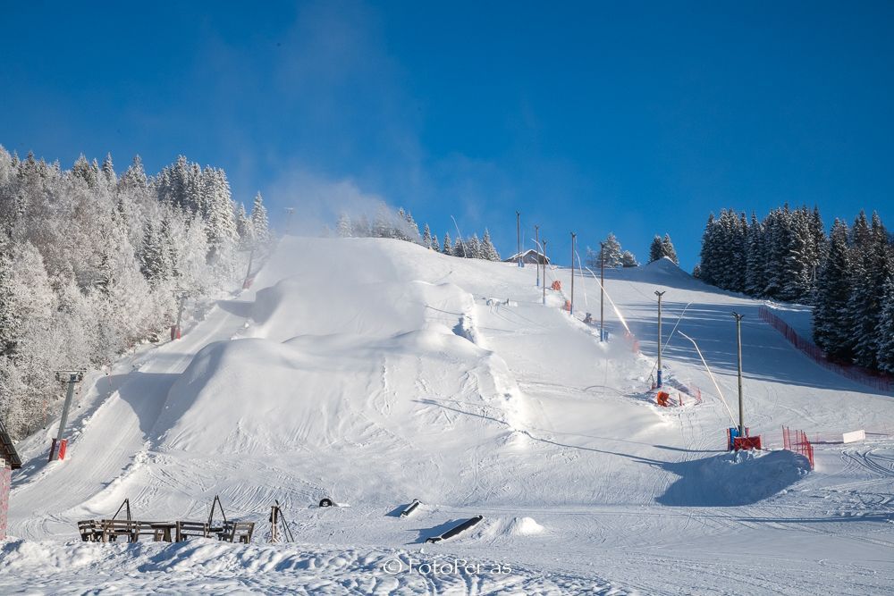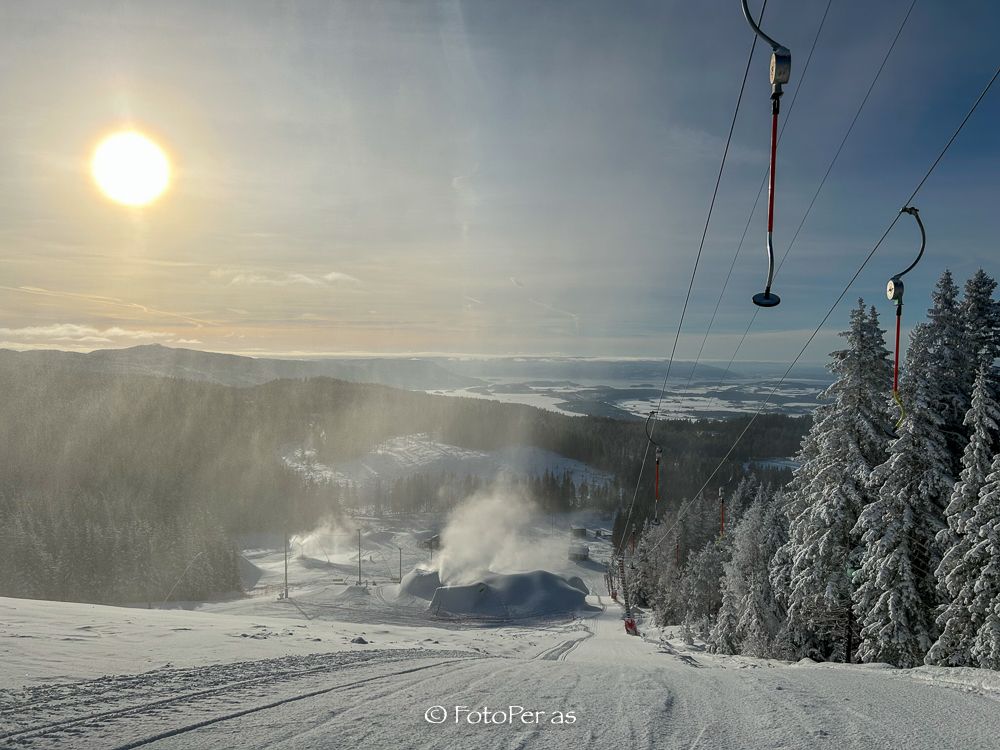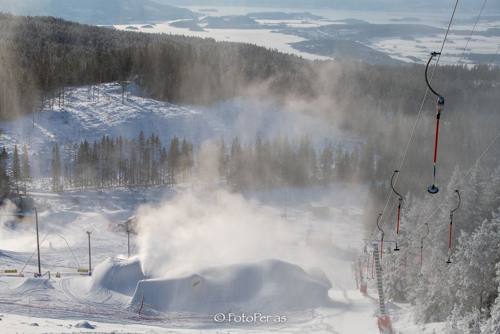 På vei tilbake må jeg bortom utsikten ved Ringkollstua og alpinbakken igjen. Snøen spruter ut av snøkanonene fortsatt, og mange kan snart glede seg til en flott bakke å kjøre i.