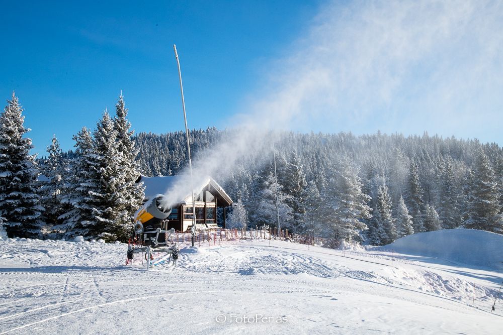 Når jeg kommer til alpinbakken er de i full gang med snøproduksjon.