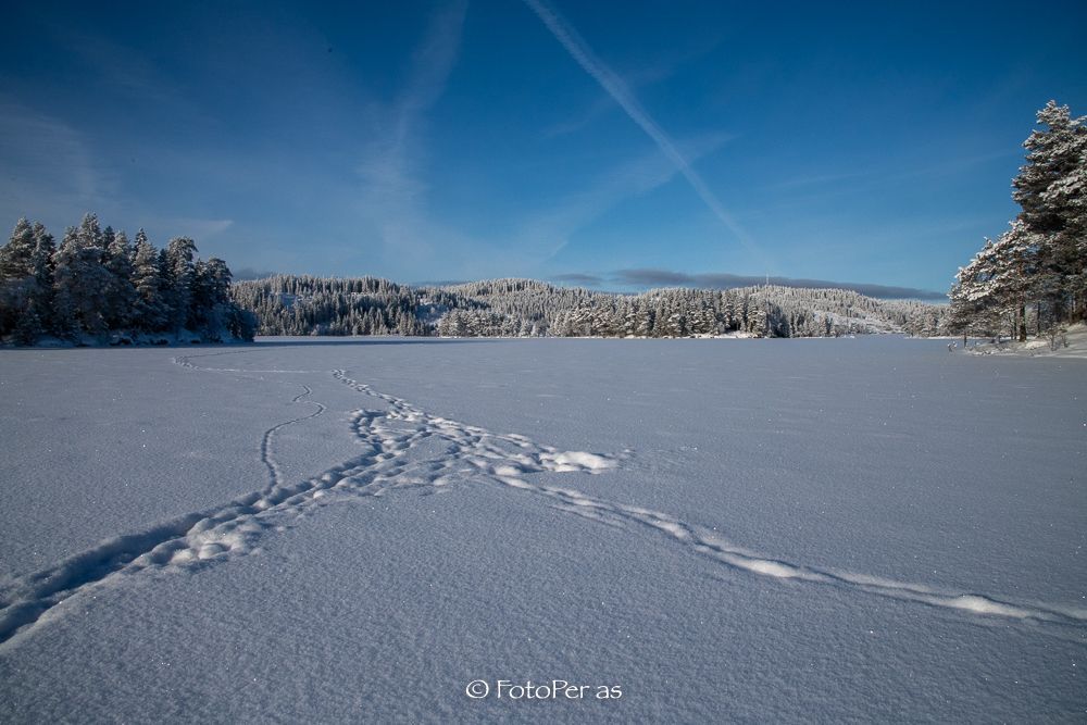 Jeg går på beina uten ski, men følger skisporet ut på isen. Neida, jeg går ikke i skisporet.... Går mot øyene utenfor Jonsetangen, et sted jeg aldri har vært før. Minus 15 kalde når jeg parkerer, men her ute varmer sola litt. Det kommer stadig jetfly på himmelen og legger igjen spor etter seg.