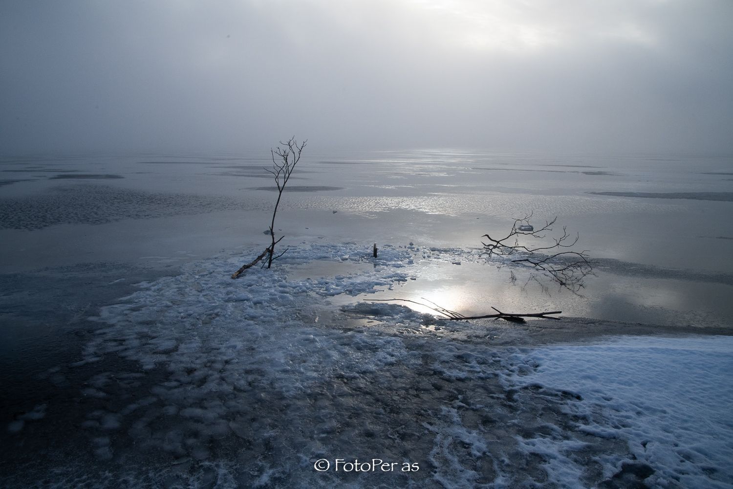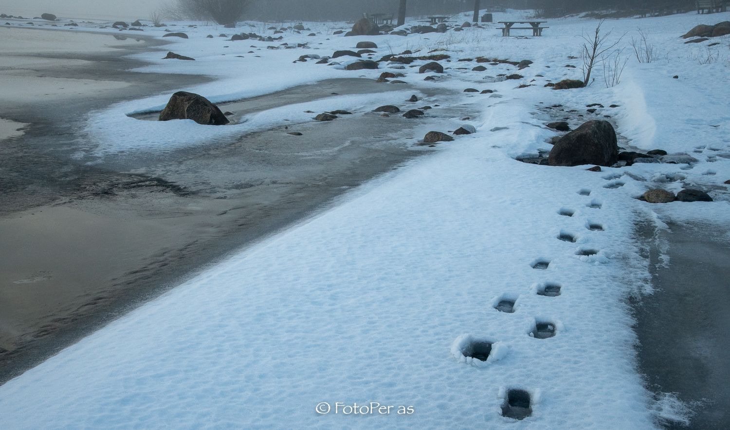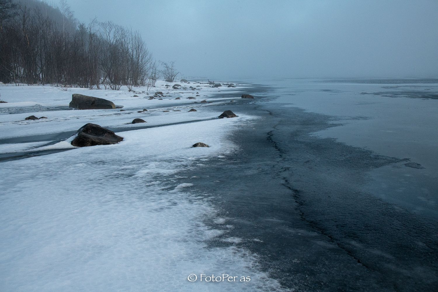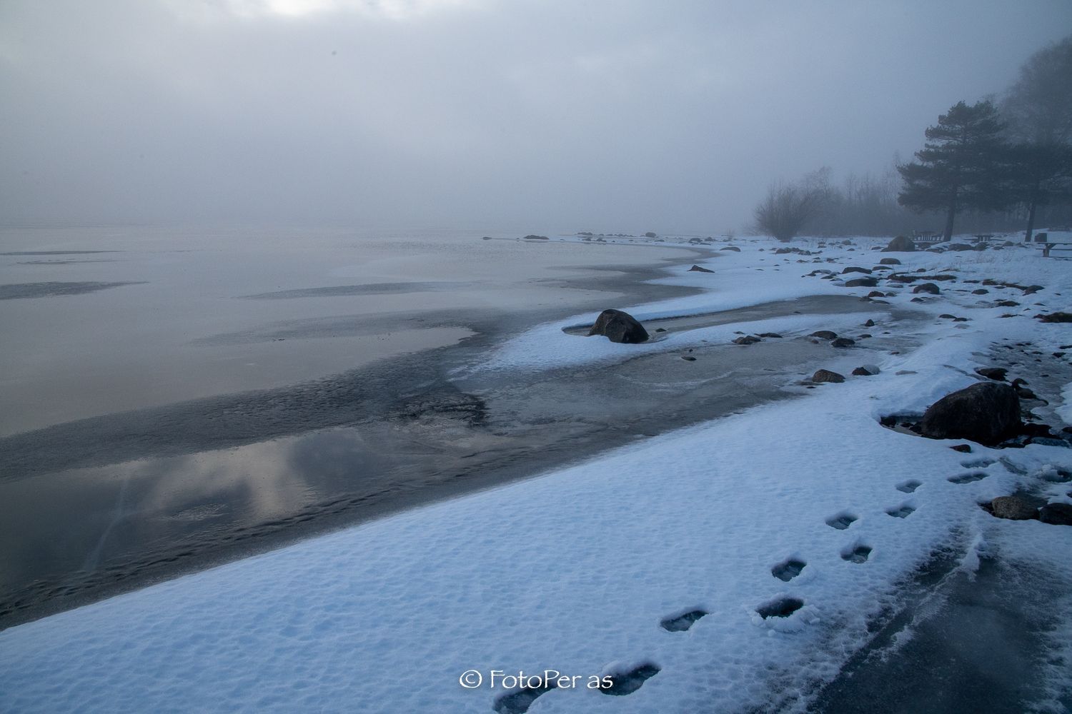 Det er sol rundt på Røyse, men ved Bønsnestangen er det tåke. Motivene blir nesten sort/hvitt uten at jeg gjør noe fiksfakseri når jeg etterbehandler bildene.