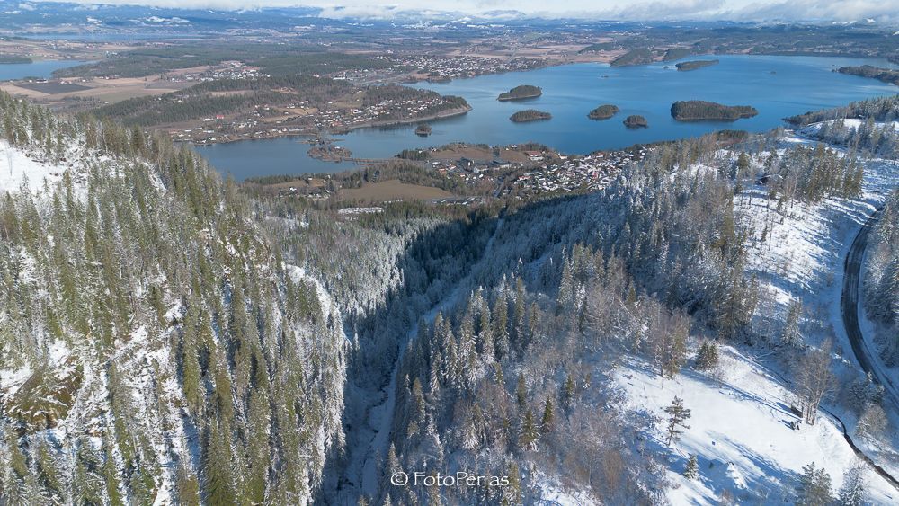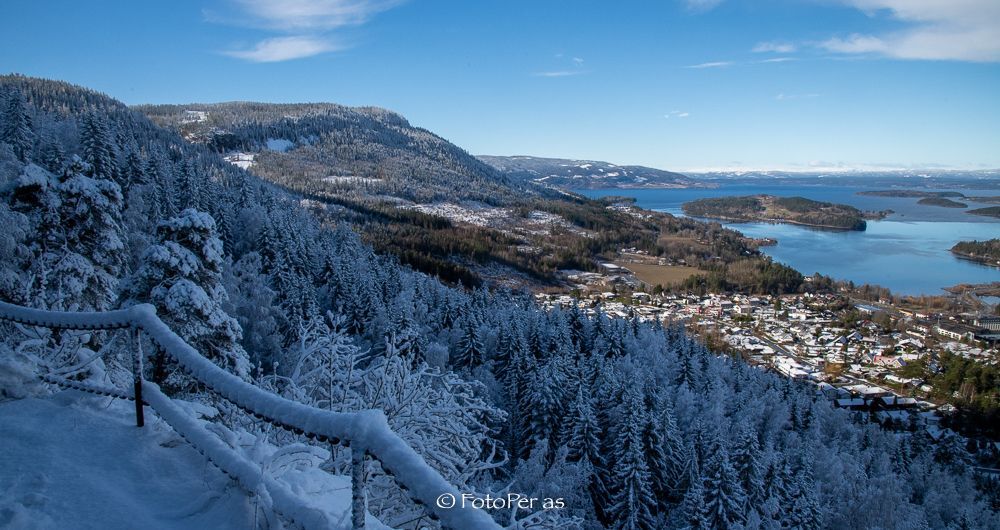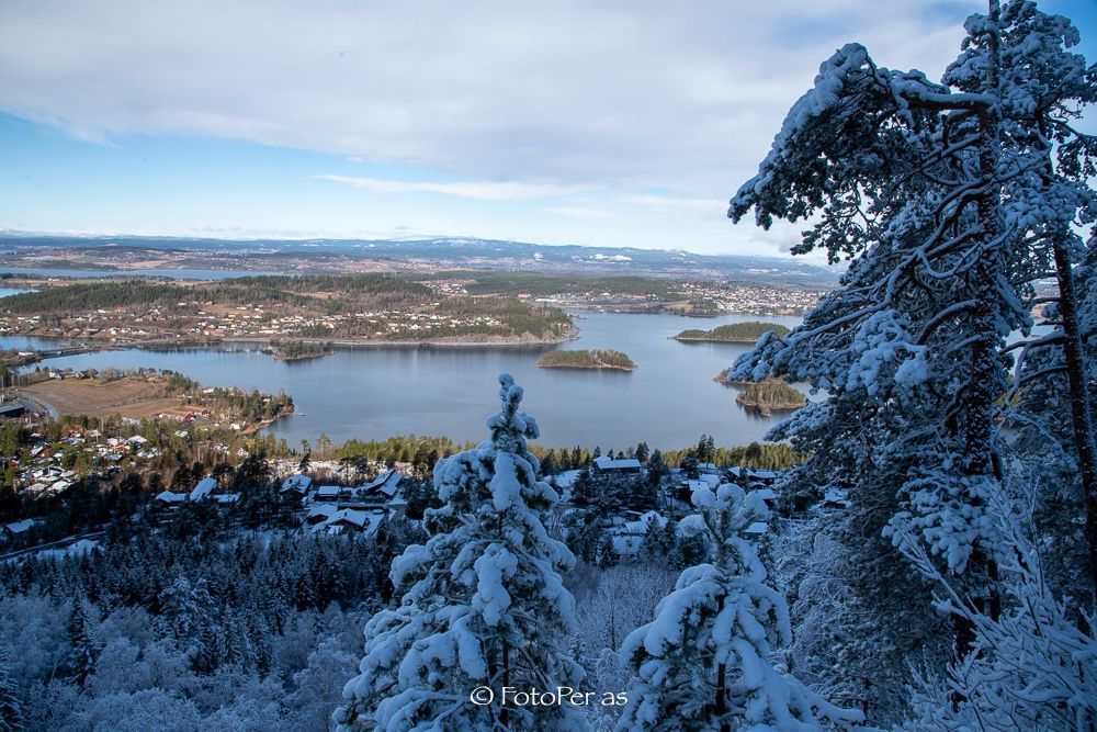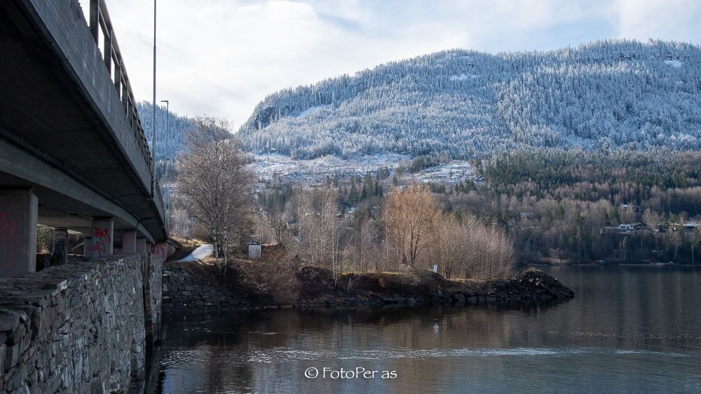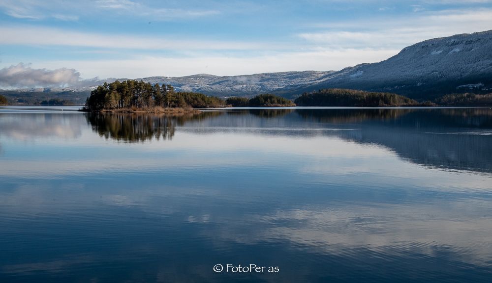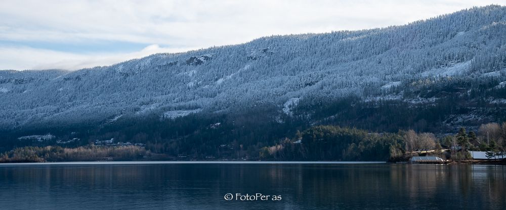 MIn morgentur fortsetter mot Sundvollen. Ved Sundøya må jeg stoppe for å få noen bilder av den blikkstille fjorden med snøskauen bak.