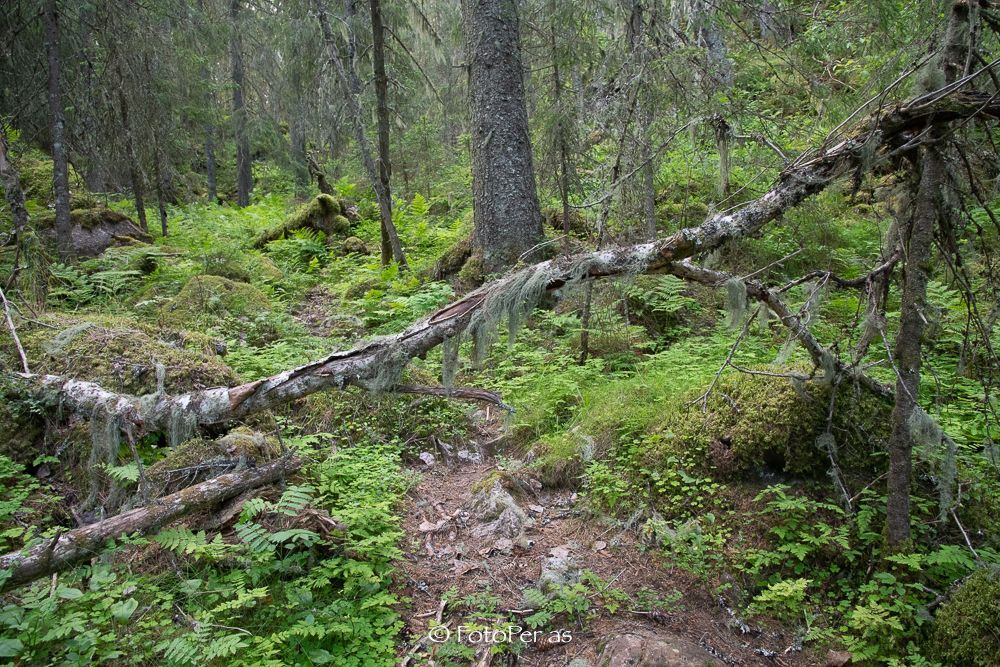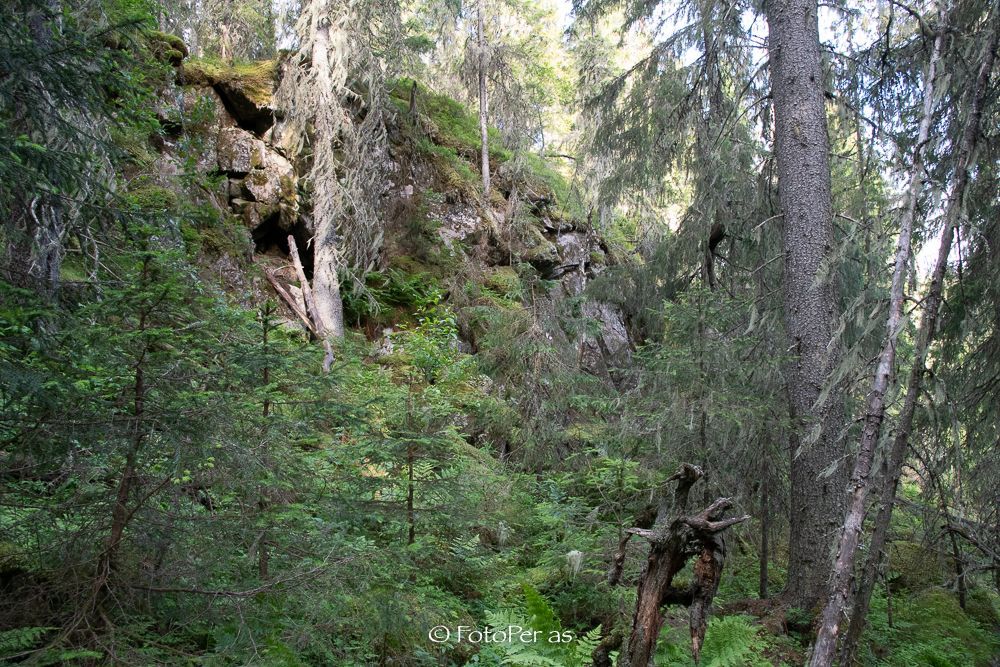 Du går mot Geitstigen, og må klatre over og under trær som har veltet her i gammelskogen. I berget oppover her ser du for deg at gaupa holder til. Du har sett spor i snøen før.