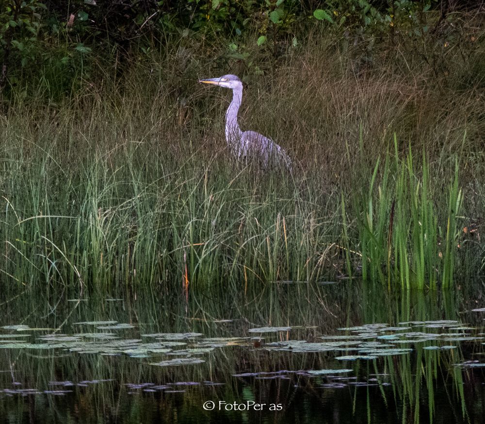Plutselig ser du noe som rører seg i vannkanten av tjernet, det er en gråhegre. Så stille som mulig tar du opp kamera og får tatt noen bilder.