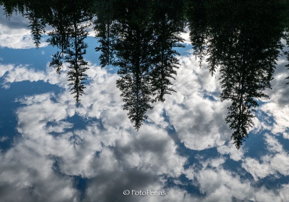 Det har klarnet opp og skyene og trærne speiler seg i vannet.