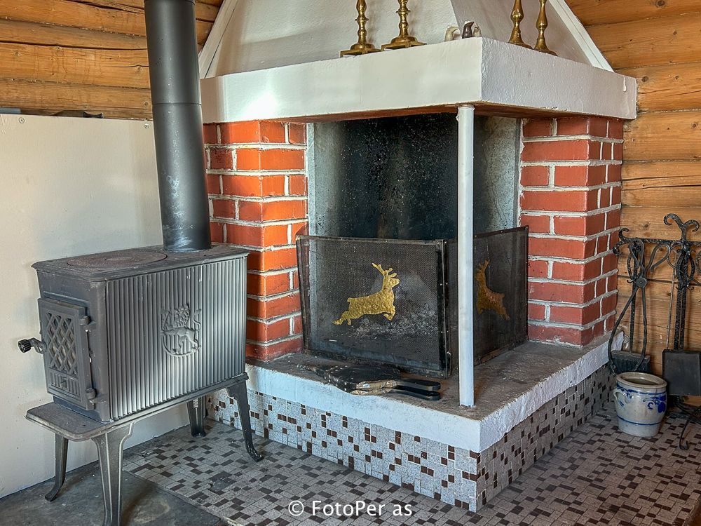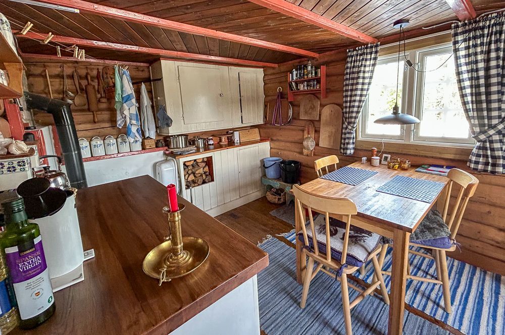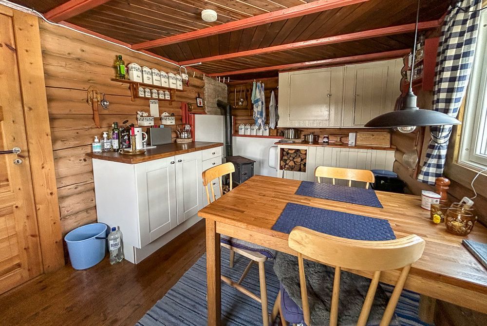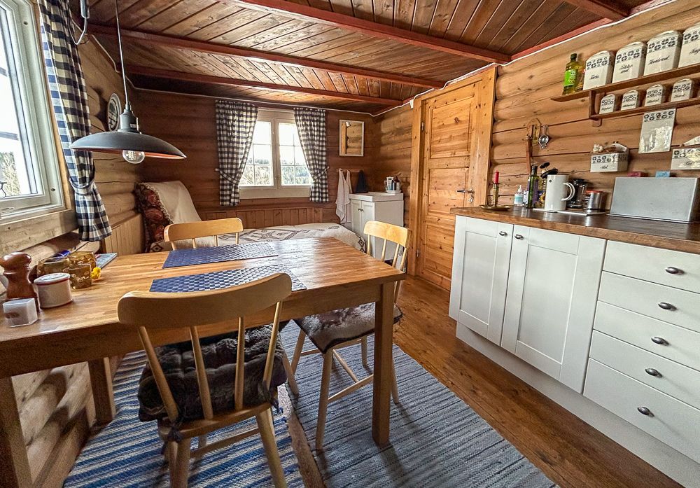 Koselig kjøkken med en koieovn som varmer godt.