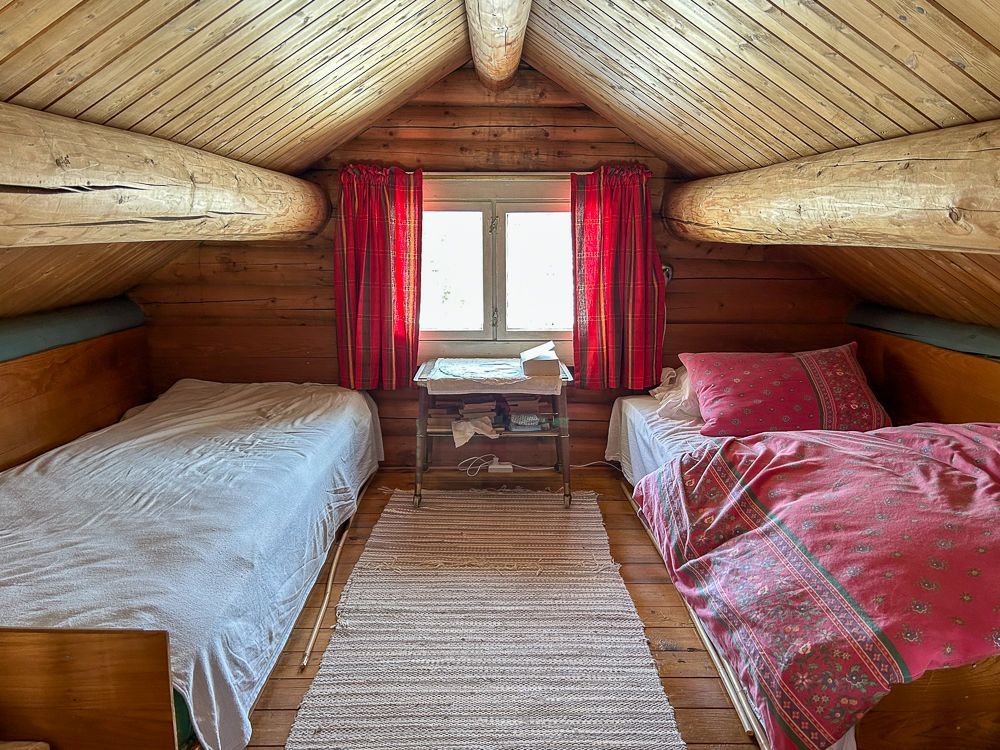 Etter en god tur ute i frisk luft, god mat og kanskje noe godt å drikke, kan det fort bli tid for soving. Enten kan du krabbe til køys på hemsen, ellers bruke senga som står på kjøkkenet. Neste morgen er det bare å fyre i koieovnen, lukke døra til stua, og snart er det godt og varmt.