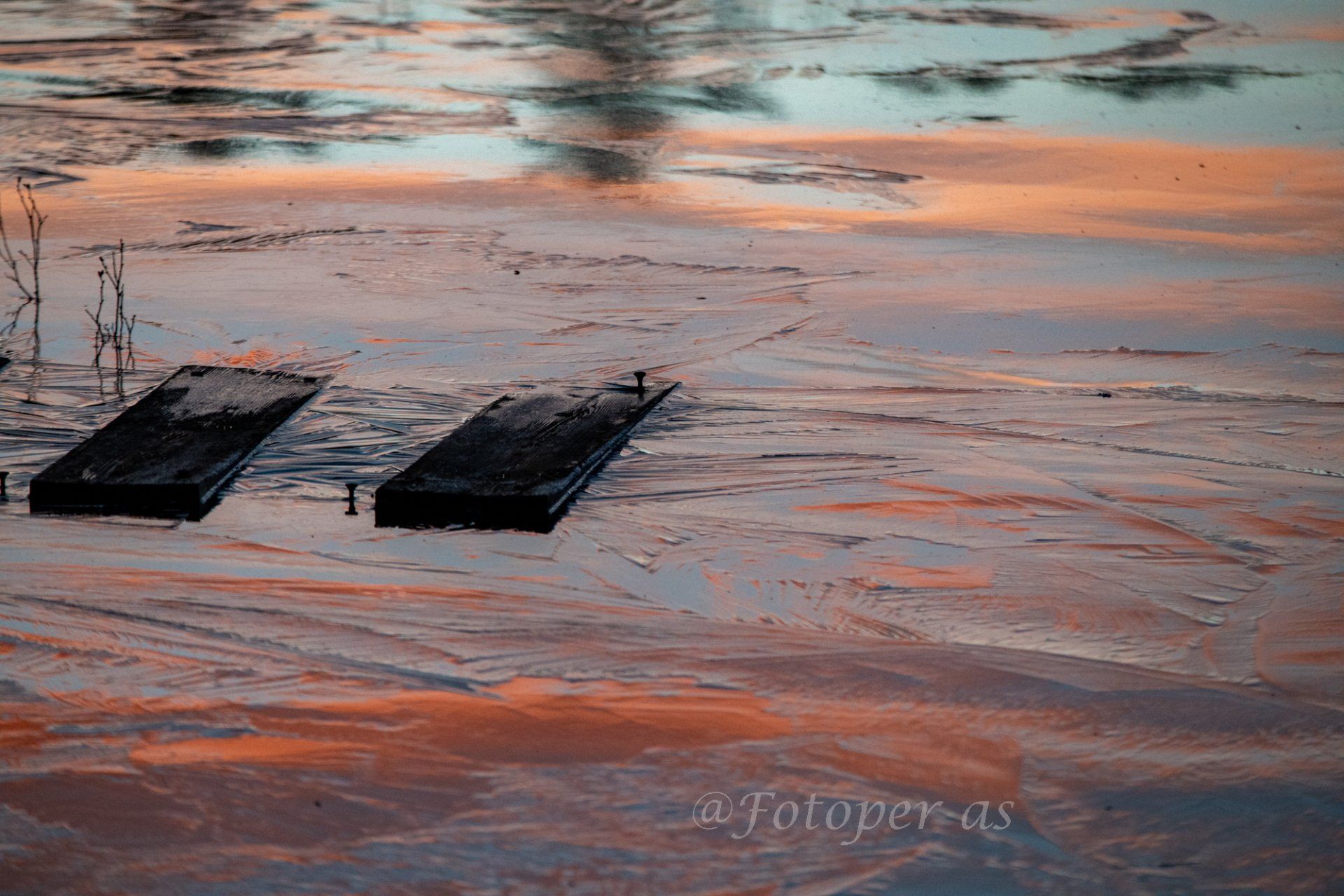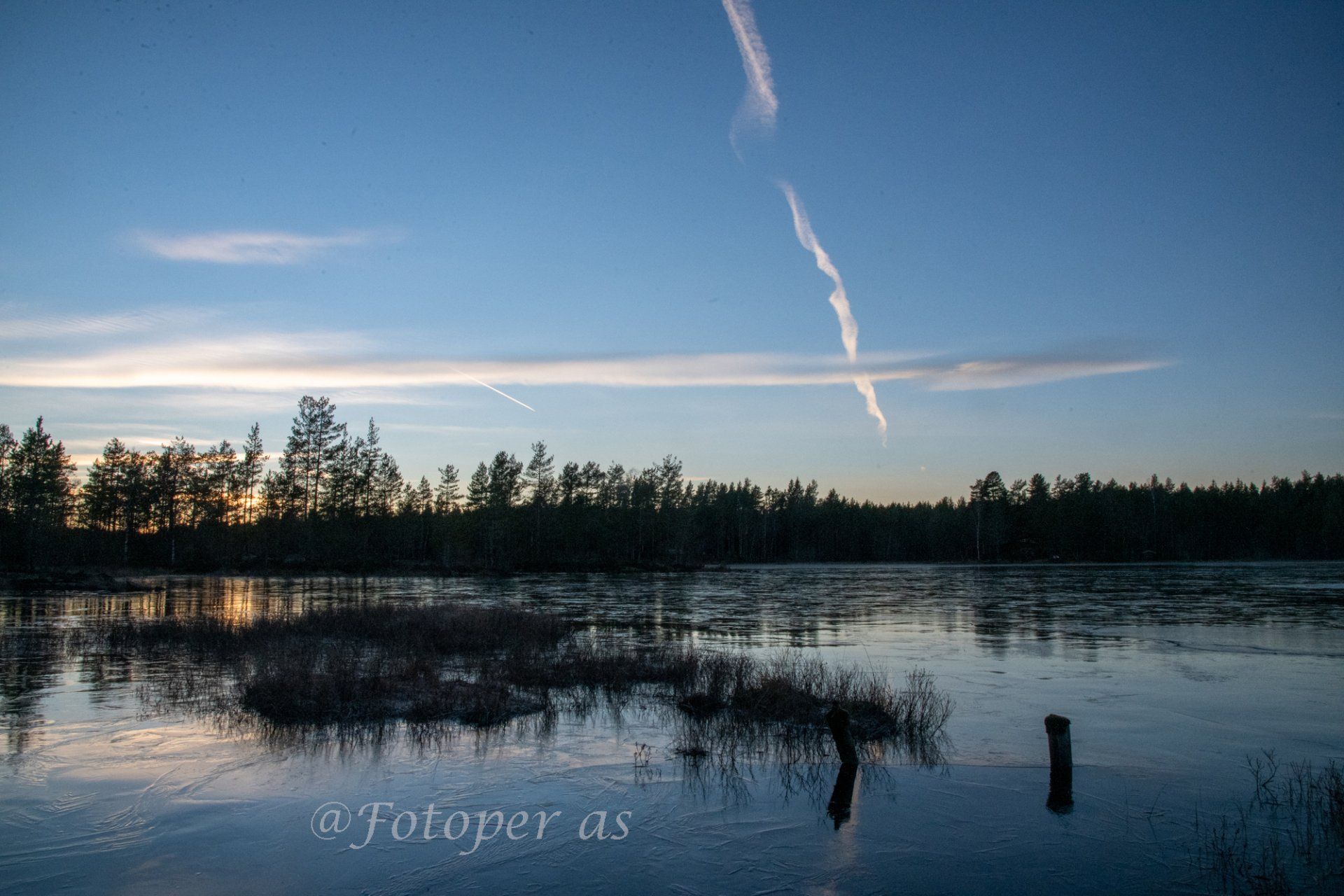 Sola krabber lenger nedover. Jeg ser striper på himmelen etter jetfly, de speiler seg i isen også. Det begynner å bli ganske mørkt nå, det er på tide å komme seg til bilen mens jeg enda ser hvor jeg skal gå.