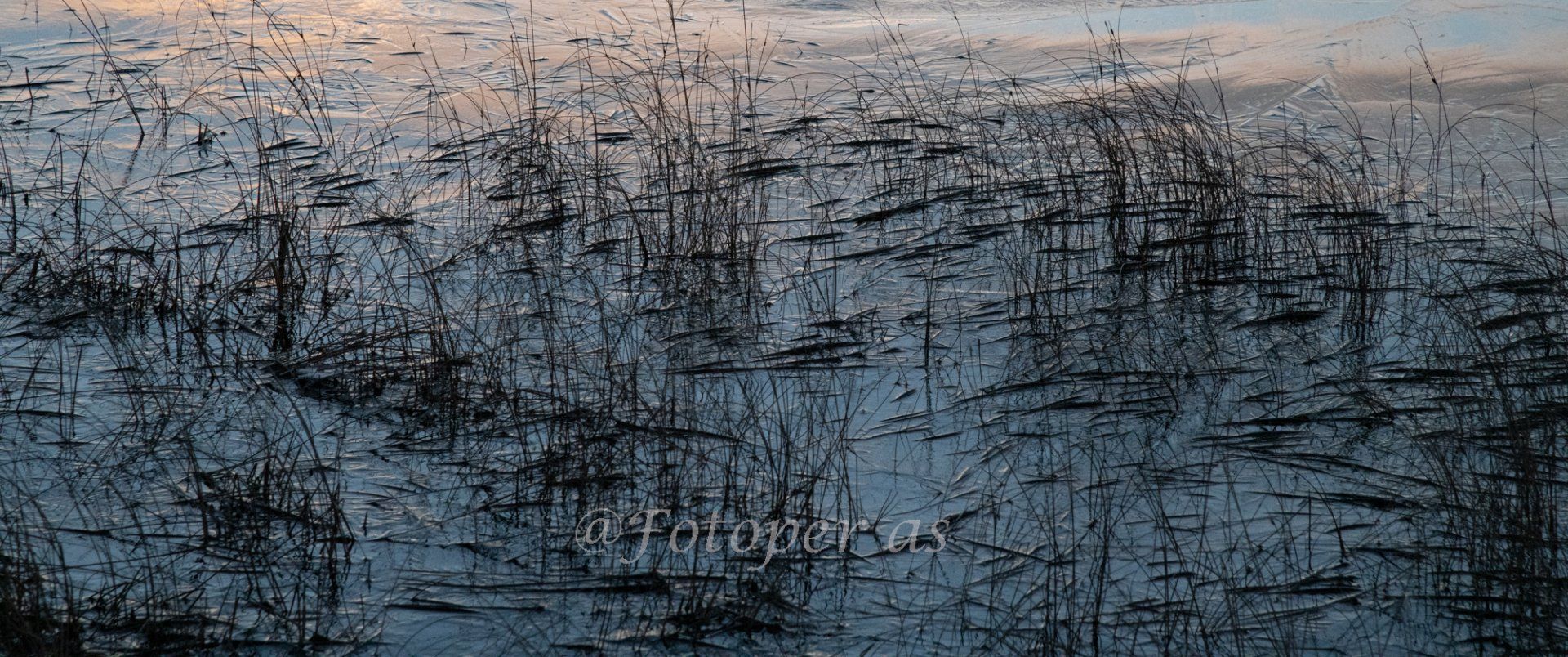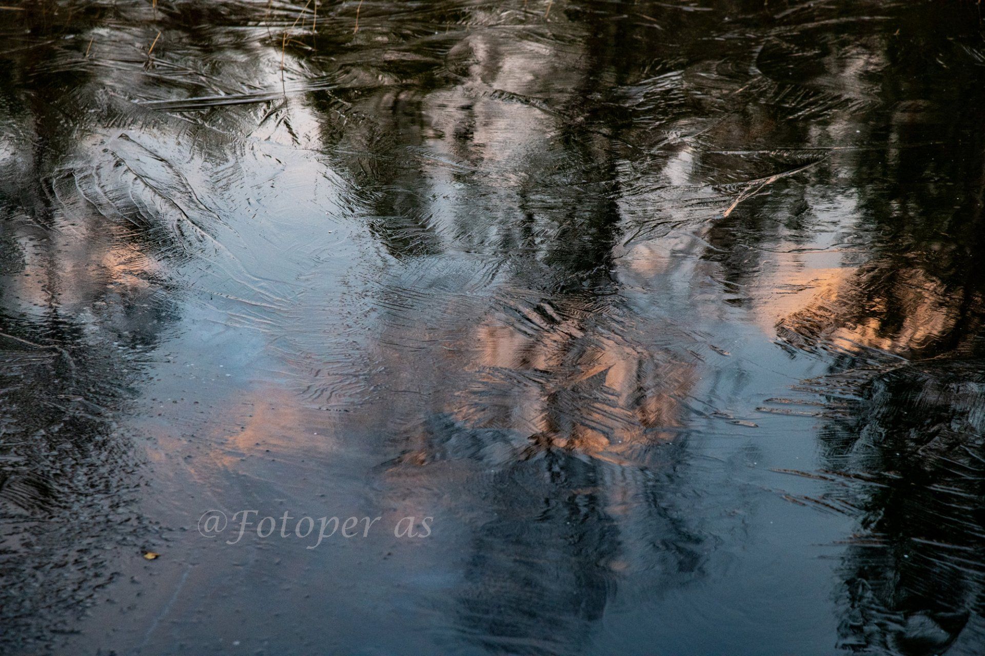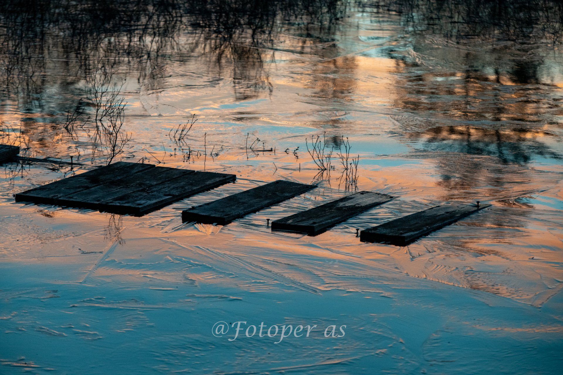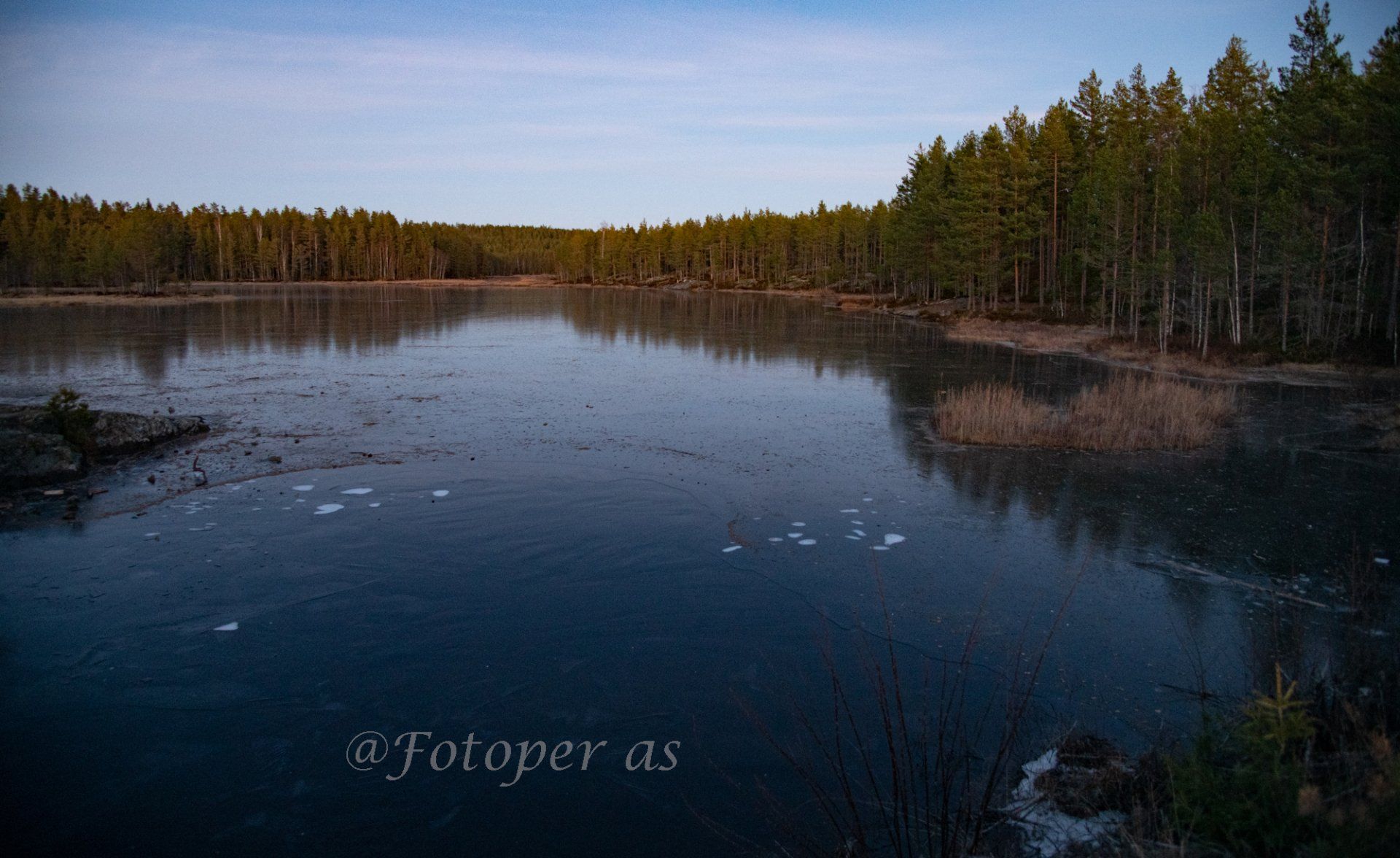 Ja, hvor jeg skal dra? Har ikke tid til å tenke for lenge, sola går fort ned. Turen går til Aklangen på Holleia. Kvier meg litt for jeg har nyvasket bil og det støver på denne veien, det har jeg erfart før. Men jeg kjører pent, det legger seg støv på bakruta bare. Parkerer ved Aklangen og går sørover langs land. Her er det nok av motiver. Har tatt med meg glasskula, lenge siden jeg har brukt den. Isen ser fristende ut, men når jeg tråkker litt hardt ned med hælen, sprekker isen. Jeg legger kula på isen, selv må jeg holde meg på land.