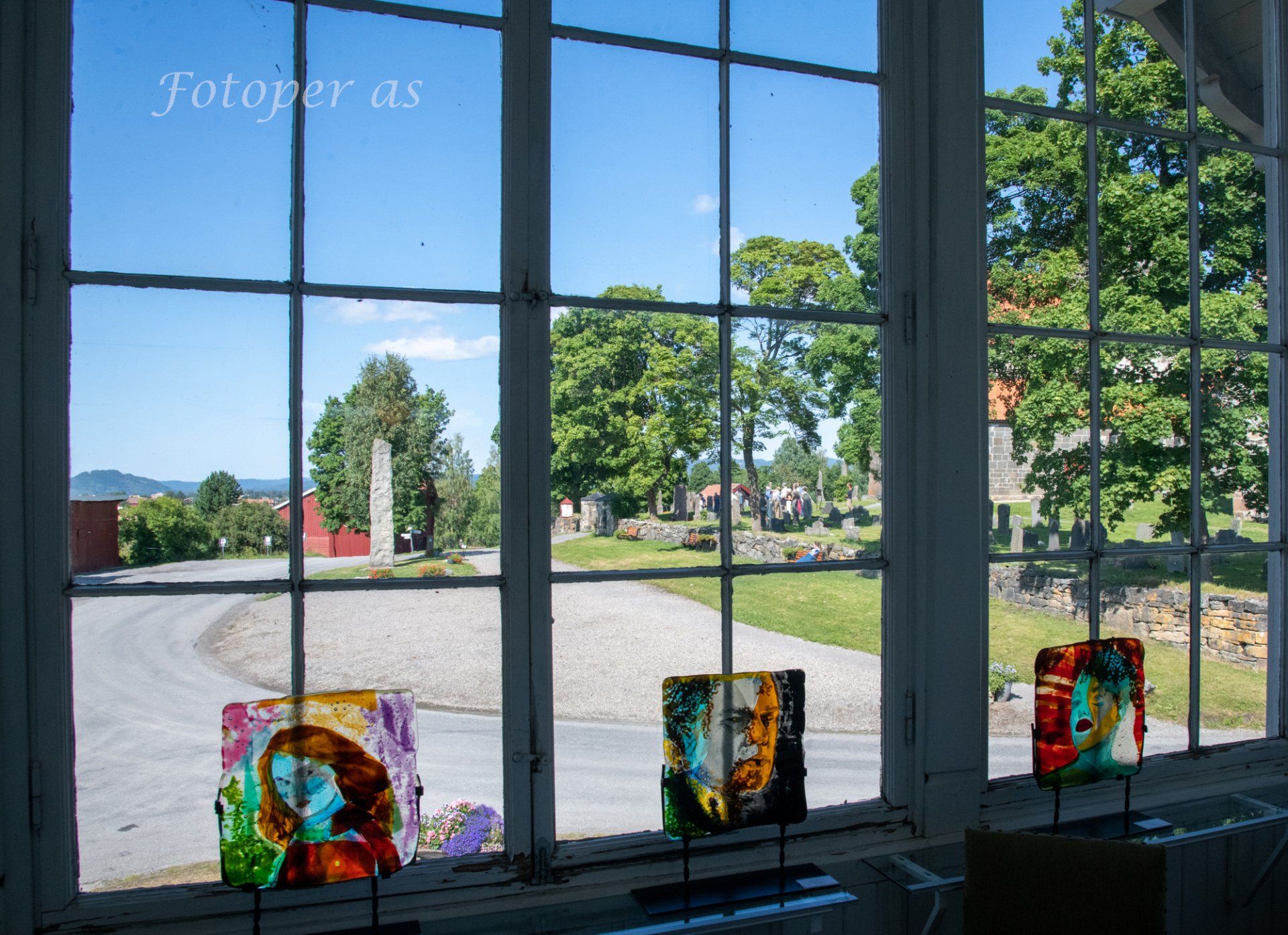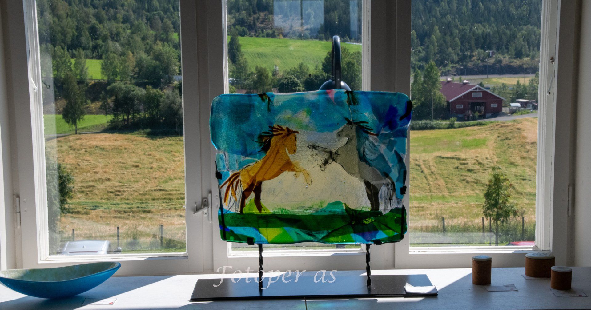 Oppe ved kommunehuset blir vi ønsket velkommen av ei hyggelig dame og får ei brosjyre med info om bygningene på stedet. Vi starter med Glasslåven Kunstsenter, et drivhus for kunstnerisk kvalitet og profesjonalitet (gratis inngang). Låven er en vernet, klassisk rød låve fra 1880-tallet. Her er det ingen dyr på stallen, låven er ombygd og det er ei glasshytte der. Her har glasskunstner Ulla-Mari Brentenberg sitt daglige arbeidssted. Nå har hun en utstilling av sin glasskunst, med priser fra 1900 kroner til 150 000 kroner, avhengig av om du ønsker lysestaker eller en enorm installasjon hengende fra taket. Prisen på den er høy, men du må også ha det høyt under taket for å få plass til den. Det ble ingen installasjon på oss, hadde ikke plass i bilen...