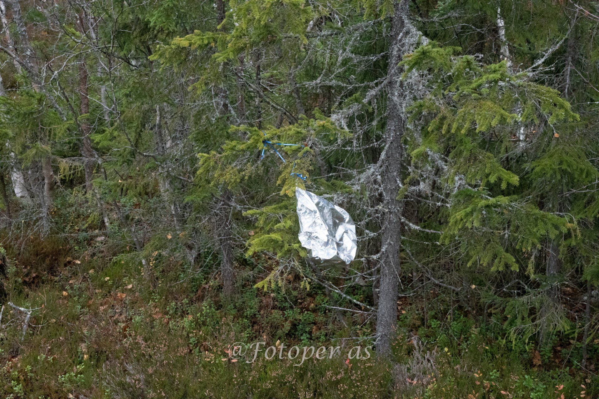 På neste økt blir jeg med Steinar opp mot Urdevassknappen, der Jonas fikk en kalv sist jeg var med. Den kalven ligger forøvrig oppdelt i fryseren hos meg nå. I et tre ser jeg noe blankt. Da vi kommer nærmere ser jeg at det er en ballong som har landet her. og forurenser naturen. Vi skal krysse Urdevasselva, den er roligere nå enn etter det kraftige regnværet for to uker siden. Men Varg liker ikke å krysse elver, han nekter å gå over. Så da må Steinar bære han over og binde han der mens han går tilbake og henter rifla. Terrenget vi kommer inn i er ulendt og vilt. Svære steiner ligger rundt og vi må klatre over noen for å komme videre. Det er store, tette trær og mange har veltet. Vi prøver hele tiden å gå så stille som mulig. Varg går litt rundt og snur, han får ikke den rette lukta i nesa. Men så plutselig setter han av sted, nå lukter det elg. Vi ser på peileren og følger etter så godt vi kan. Er oppe mot fjellkanten, men kommer oss nedover. På den andre siden kan vi se Høgfjell. Jeg kan se hvordan elgen skader trærne ved å spise greiner og skudd.