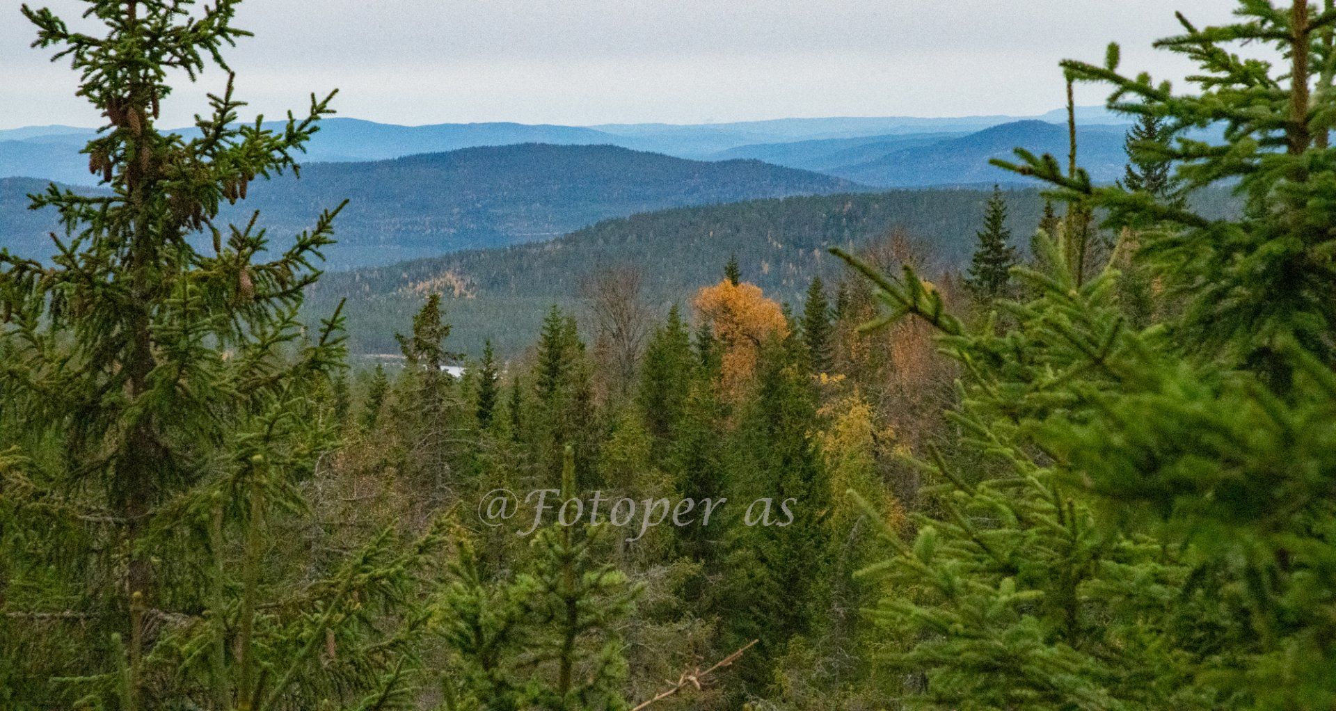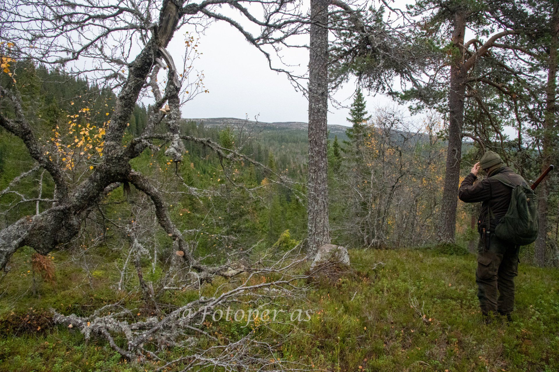 Vi går videre oppover og snart får vi god utsikt utover. Ser Norefjell og langt av sted. Det blir en fargemiks av grønt, gult og blått. Og det er vel ikke lenge før det er snø på Norefjell. Her oppe er det ei flate hvor Steinar mener det hadde vært fint å ha ei hytte. Han følger med på peileren og ser at Varg, og det han antar er elger, nærmer seg Tormod. Vi venter i spenning på om de kommer på skyteavstand for Tormod. Men så plutselig vinkler de i en annen retning, nå mot der Ståle sitter. Vi venter på å høre skudd fra han, men det er helt stille. Han ser ikke noe til elgen, de har passert lenger unna. Jegerne snakker sammen og blir enige om å kjøre ned til Luserud, både bikkje og elger er på vei dit. Når vi går tilbake til bilen ser vi tydelig spor etter to elger som har krysset veien og tatt en retning som gjorde at Ståle ikke så dem.