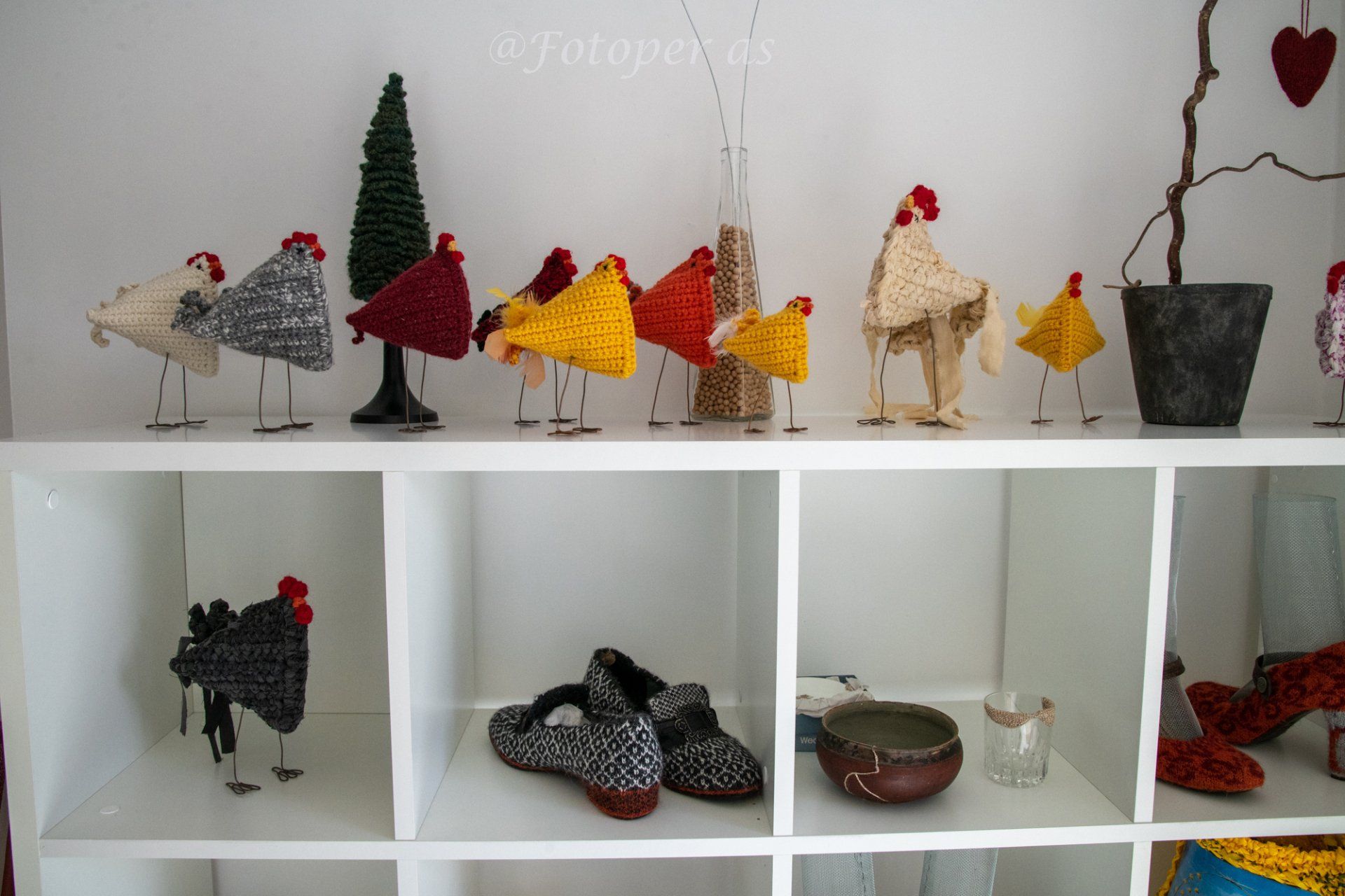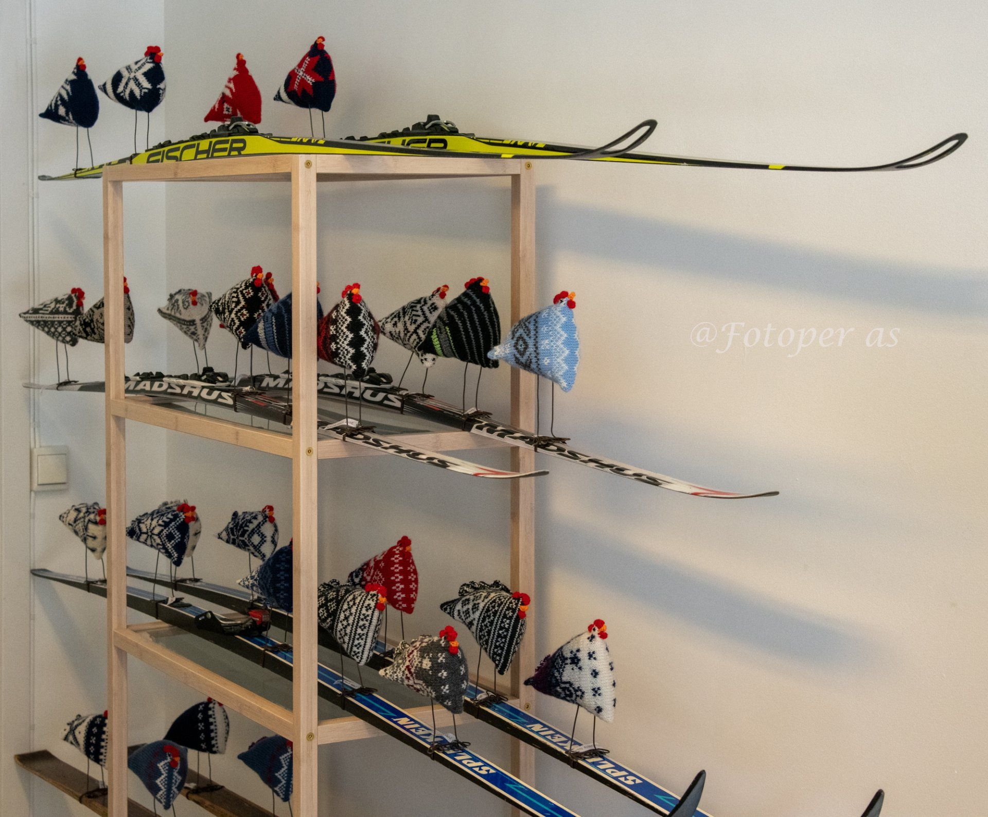 Det er flere som har tilhold på Helgelandsmoen for å selge sin kunst. Blant disse er Jorun Engebretsen Hagen som strikker. Enten det er trekk til kofferter, stoler eller annet. Eller det siste nå, ski dekorert med strikkegjenstander.