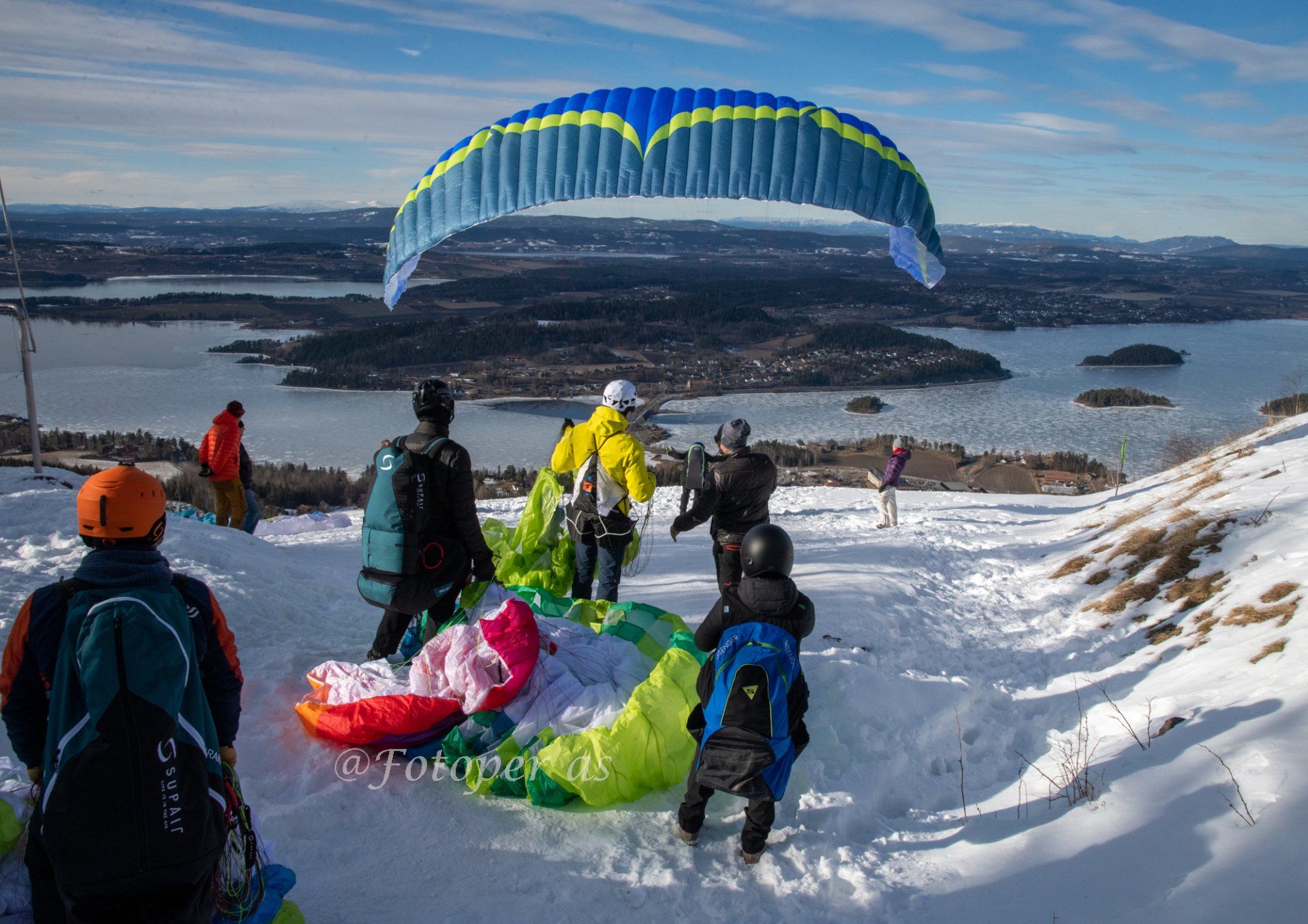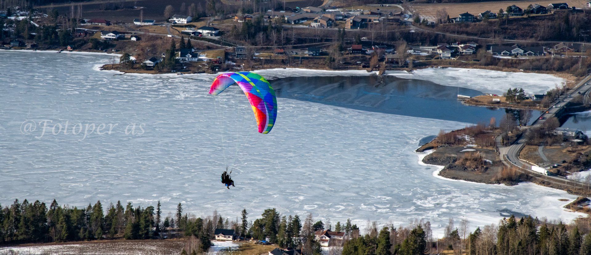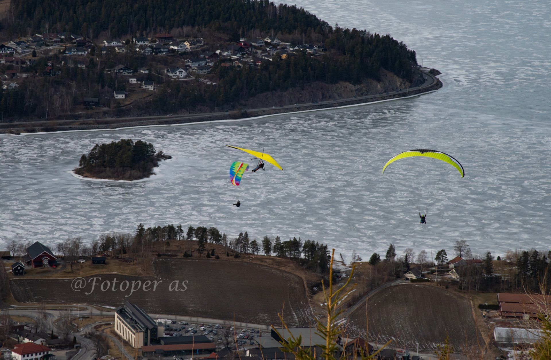 I Dronningveien var det stor aktivitet, mange hoppet med paraglider, noen med hangglider. Ja, var det kø på parkeringsplassen og det var kø for å hoppe. Det var visstnok gode forhold for å øve på avgang og landing. Noen landet på åkeren ved skolen, men mange landet også på isen ved Sundvollstranda.