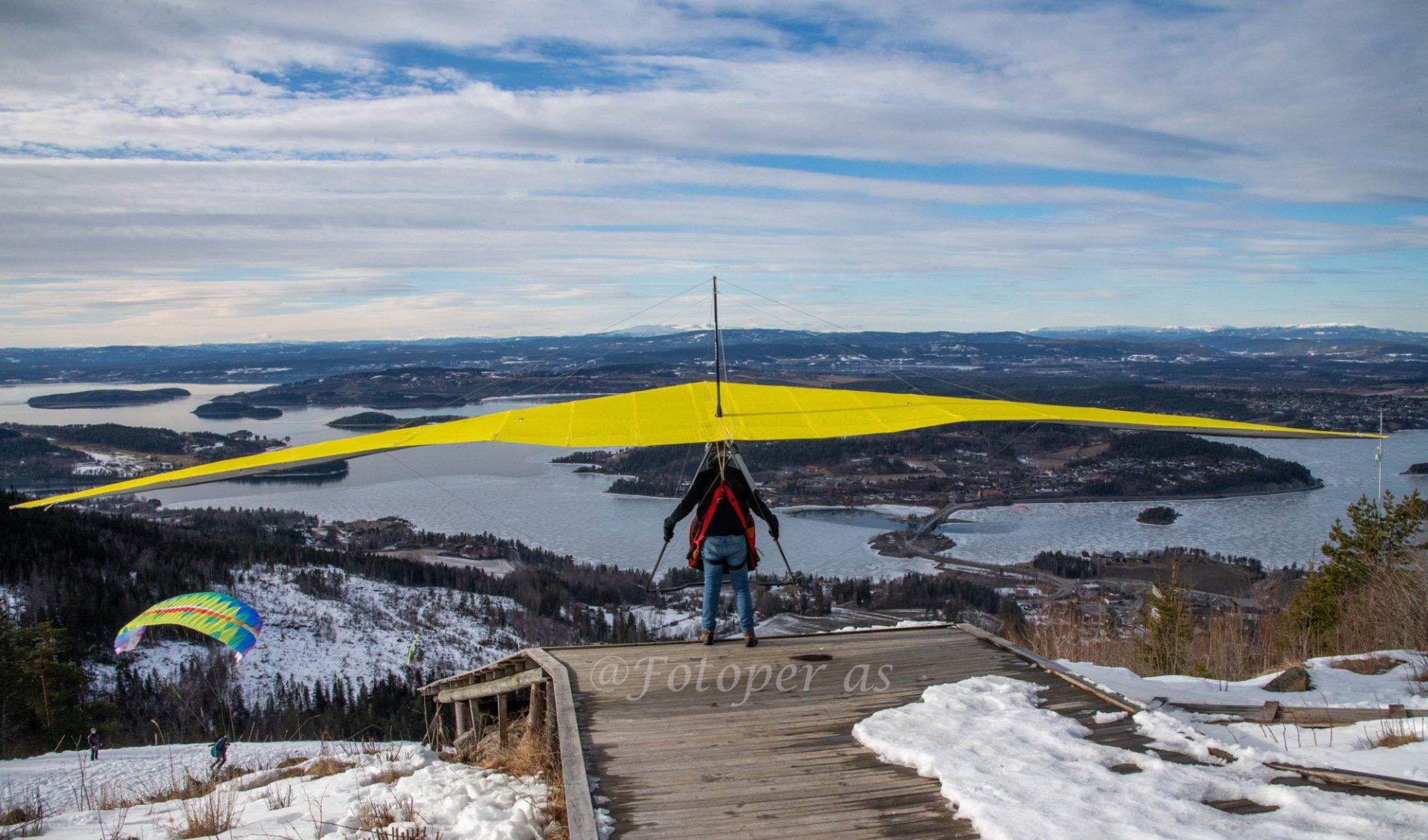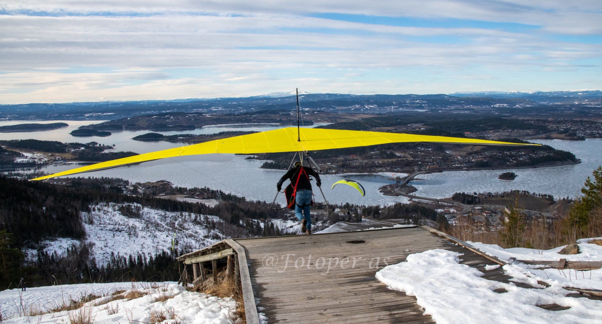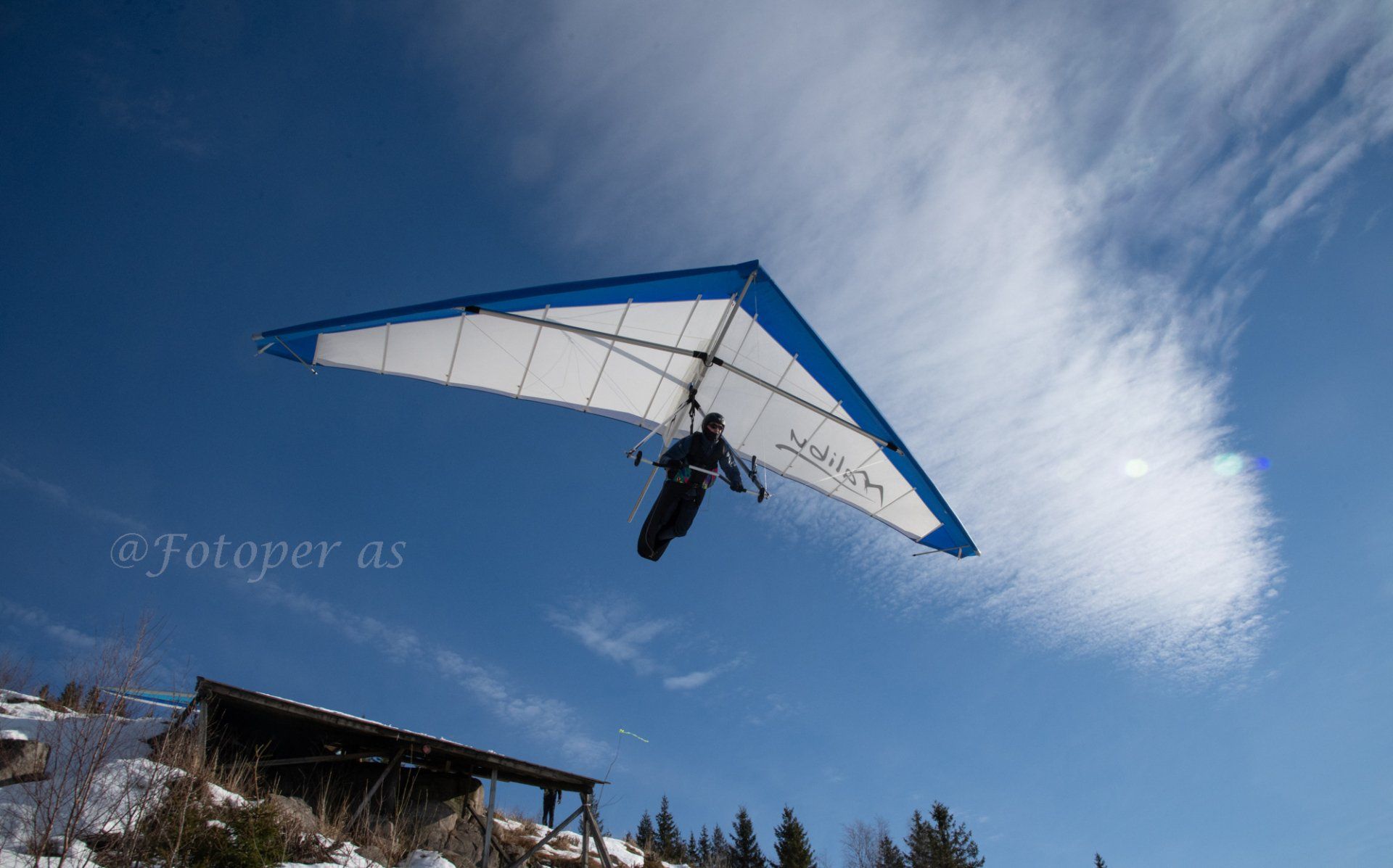 I Dronningveien var det stor aktivitet, mange hoppet med paraglider, noen med hangglider. Ja, var det kø på parkeringsplassen og det var kø for å hoppe. Det var visstnok gode forhold for å øve på avgang og landing. Noen landet på åkeren ved skolen, men mange landet også på isen ved Sundvollstranda.