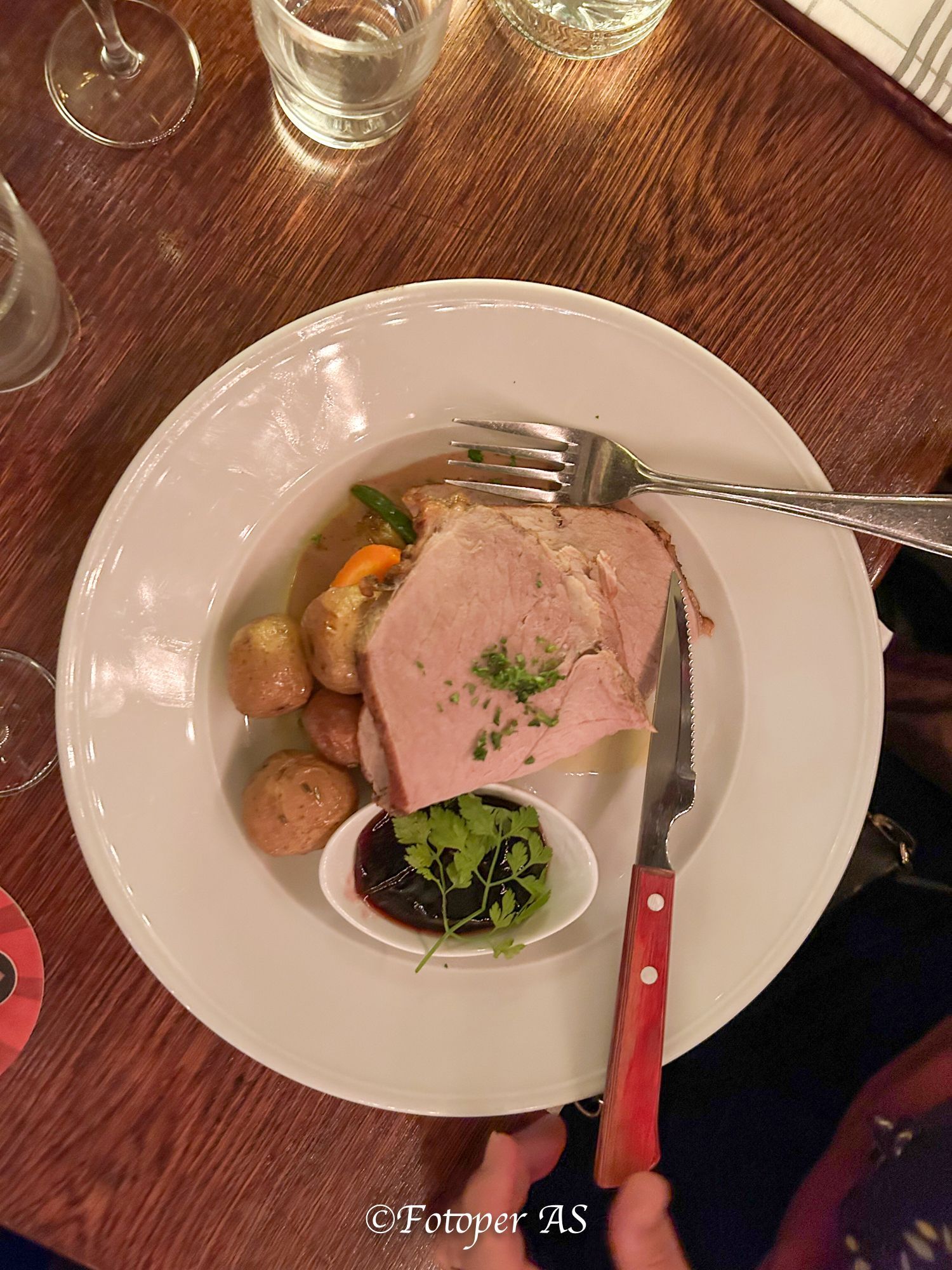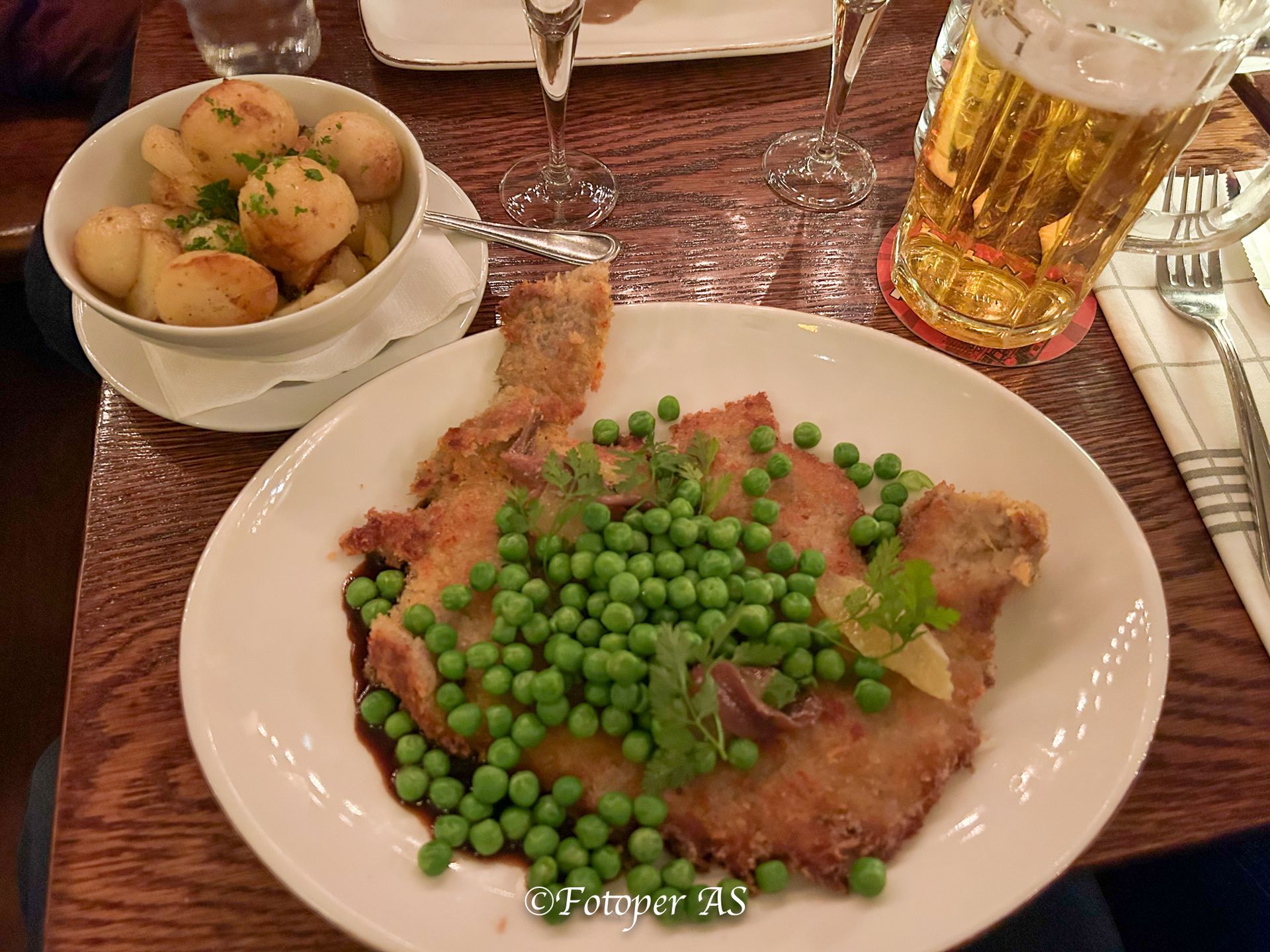 Zum Franziskaner kunne interiørmessig minne litt om Theatercafeen i Oslo, eller andre steder med samme stil. Hovmesteren klarte å rydde plass til oss alle. Mat ble bestilt, god øl og snaps kom på bordet. De fleste valgte seg wienerschnitzel eller kalvesteik, begge retter smakte bra.