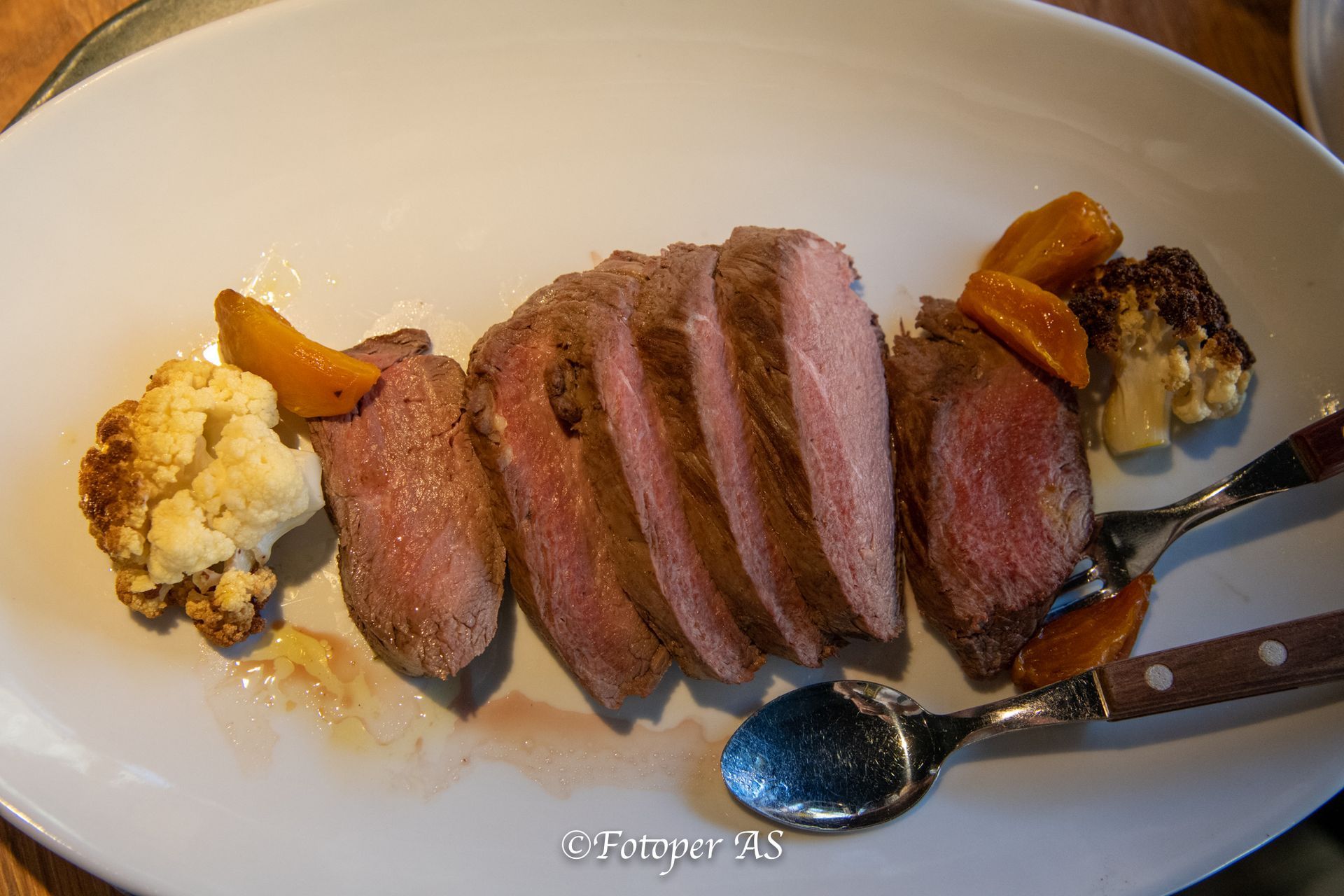 Til hovedrett fikk vi oksefilet, rådyr og lammecarrè sammen med passende sauser og deilige poteter.