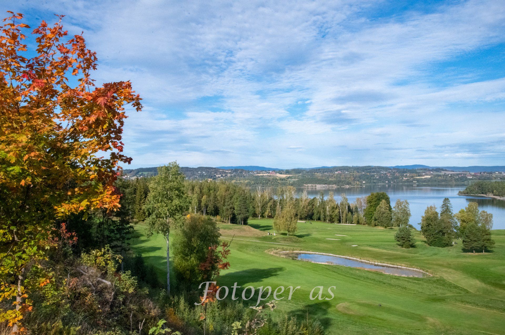 Har lagt inn på telefon at det er siste åpningsdag hos Galleri Klevjer på Helgelandsmoen i dag og kjører i den retningen. Men først må jeg på Storøya og se om det er noen motiver der. Der du kan trene på utslag ser jeg en far som prøver å lære sin unge sønn å slå golf. Han gjør noen tapre forsøk på å slå, men ballen kommer ikke så langt som han skulle ønske. Jeg kjøre videre opp mot gården og parkerer for å ta noen bilder av golfbanen mot Røyselandet. På Vik kjører jeg bortom herredshuset, passer fint å ta noen bilder der også. Ved Svendsrud svinger jeg mot Bønsnes, mange fine farger utover her nå. Blir en stopp ved Bønsnes kirke før jeg fortsetter mot Hunstad og Helgelandsmoen.