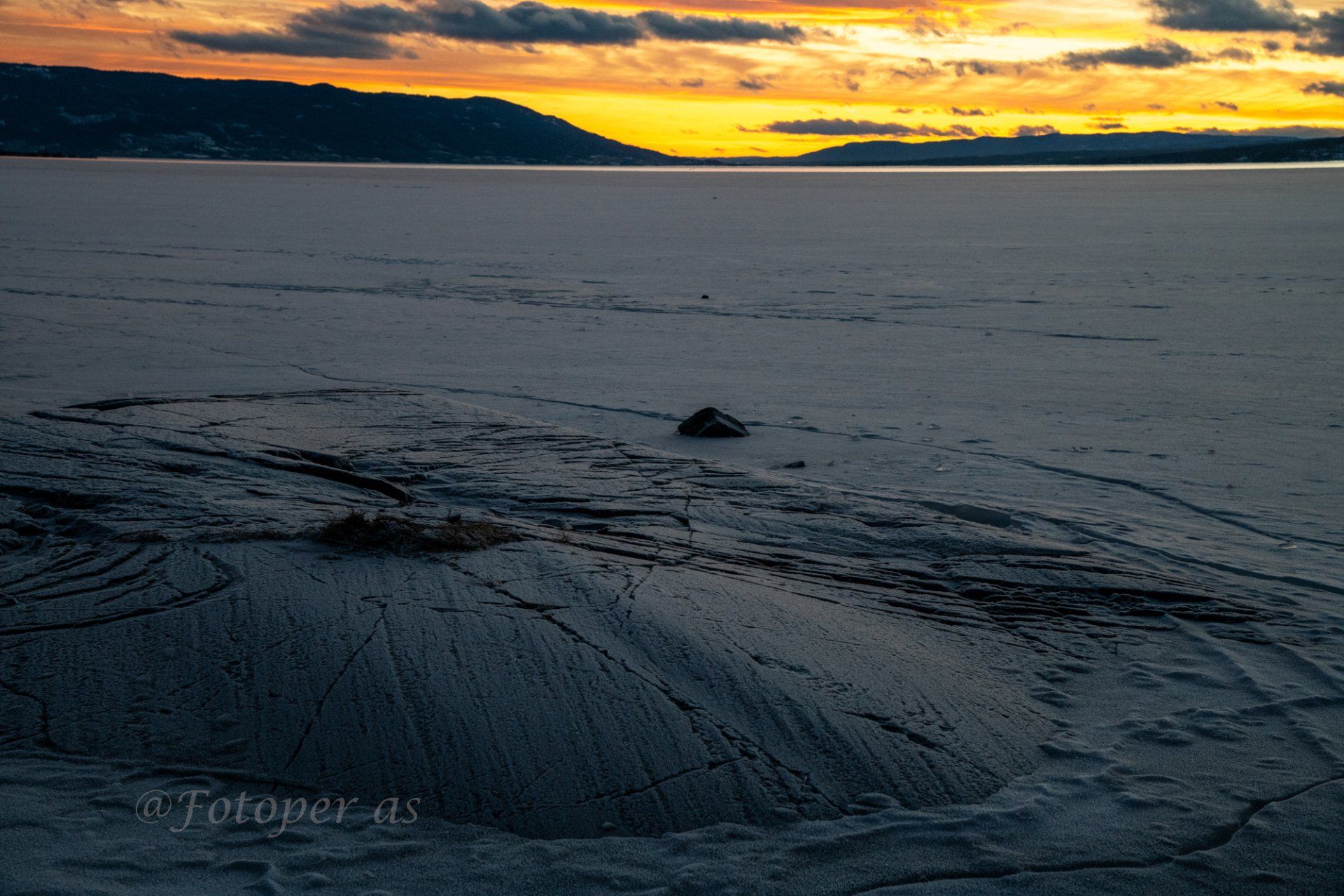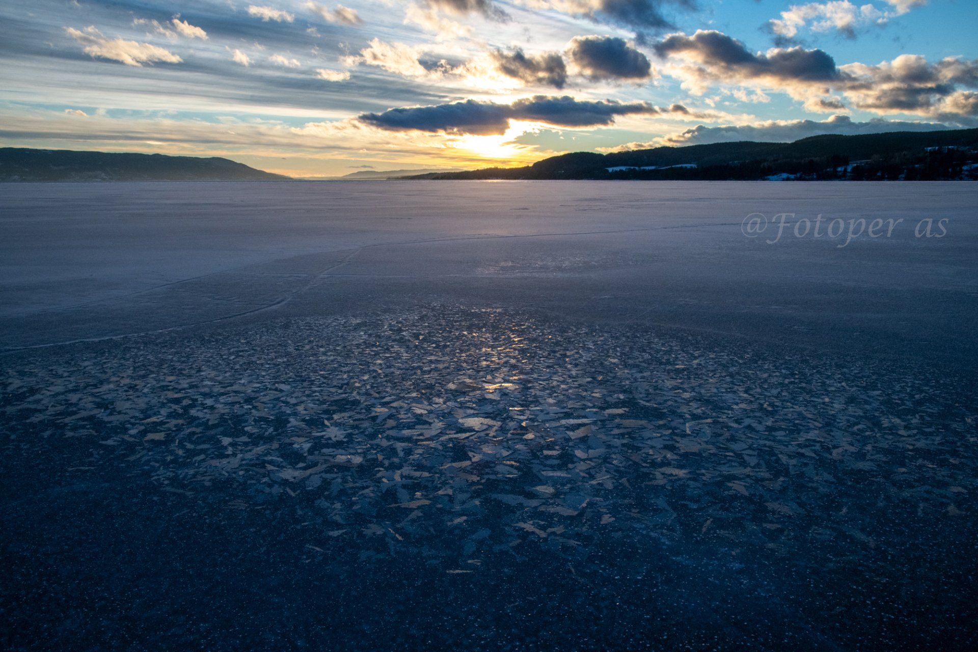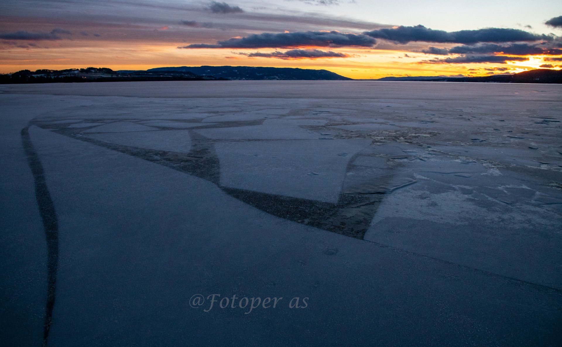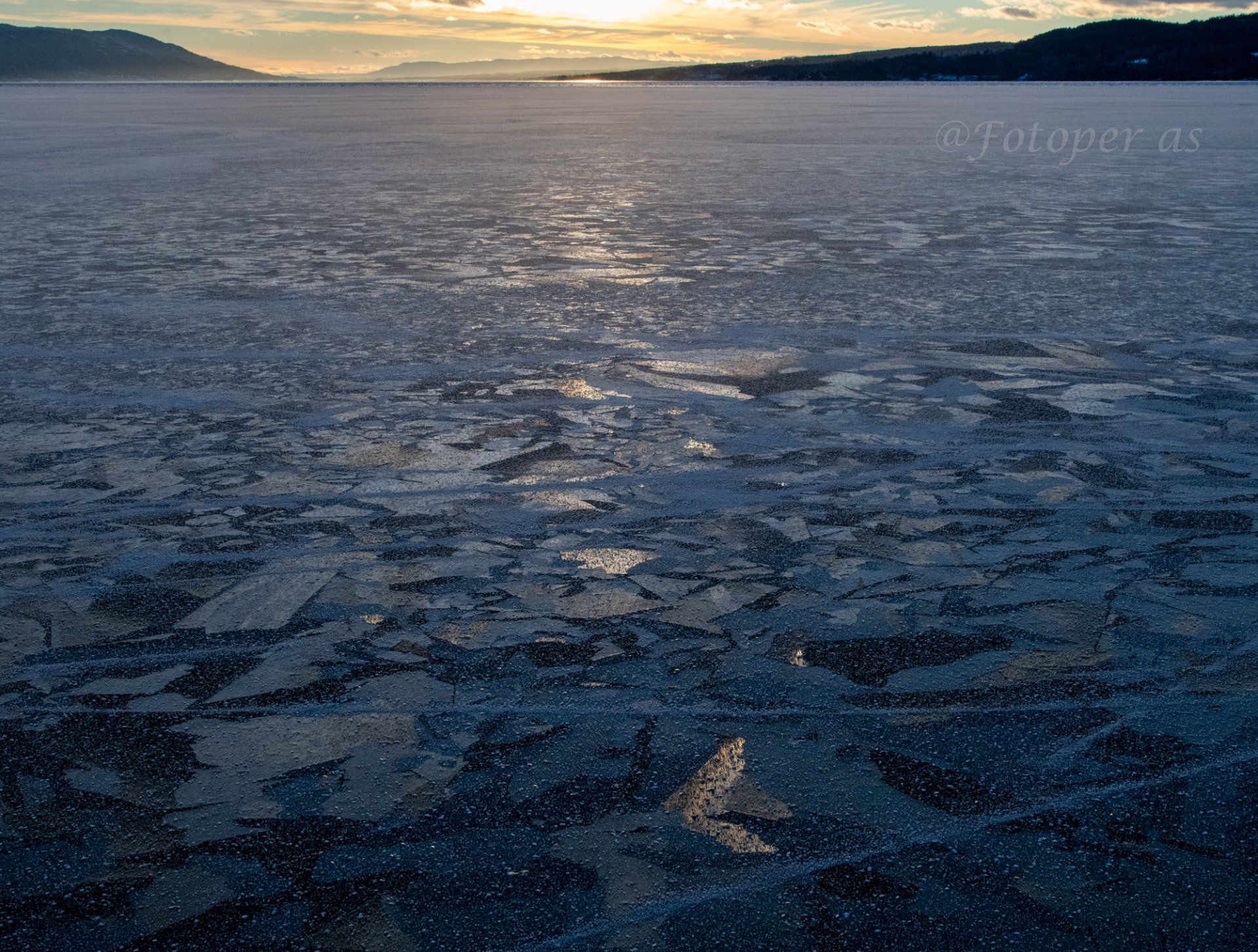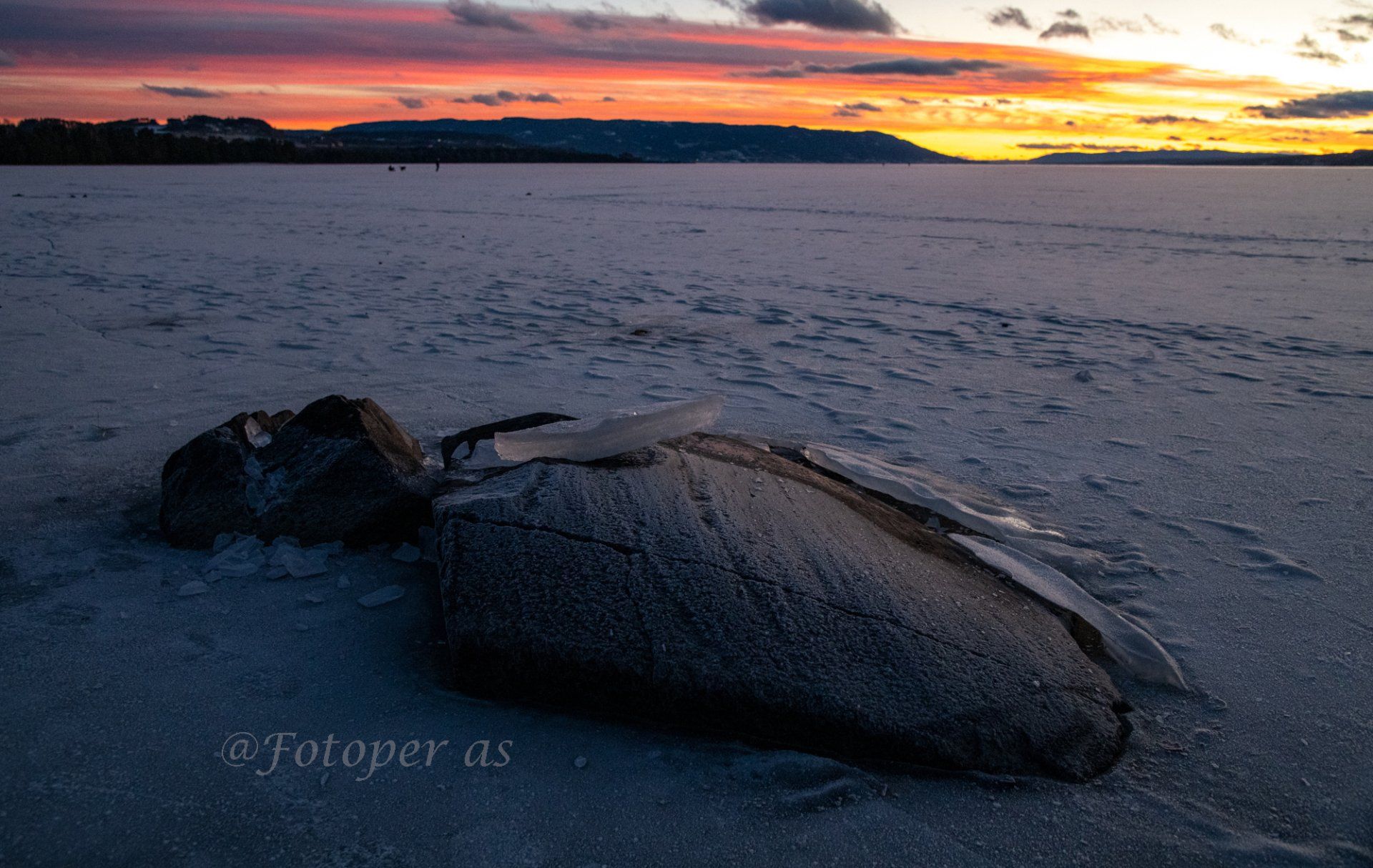Ja, så ble det Røssholmstranda i solnedgangen igjen. Det vil si, jeg var ute i god tid så jeg fikk noen bilder før sola krabba nedover. Dessverre var det et lag med noe hvitt på isen, derfor var det nesten ikke noe klar is.