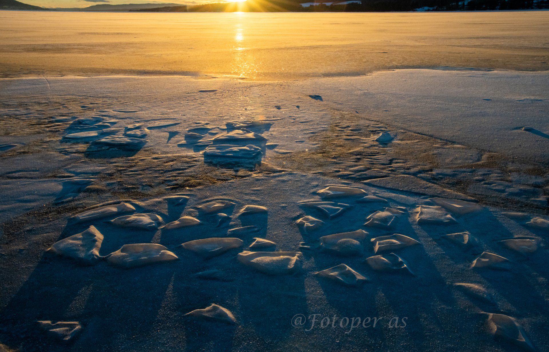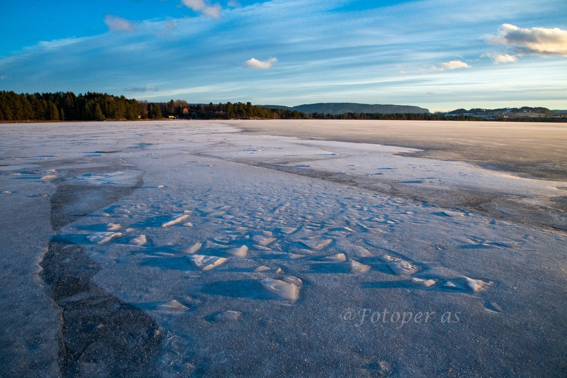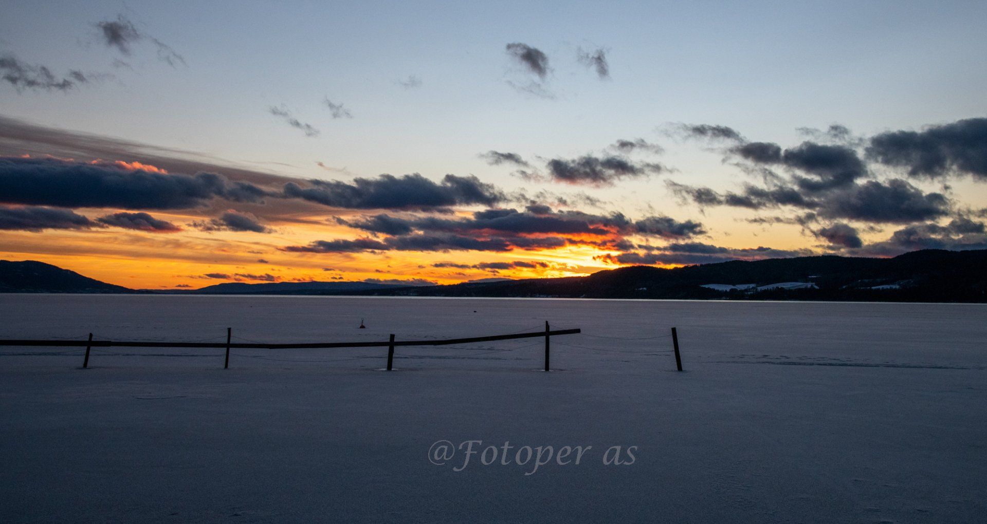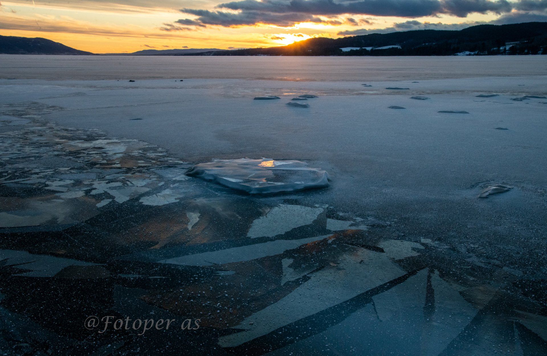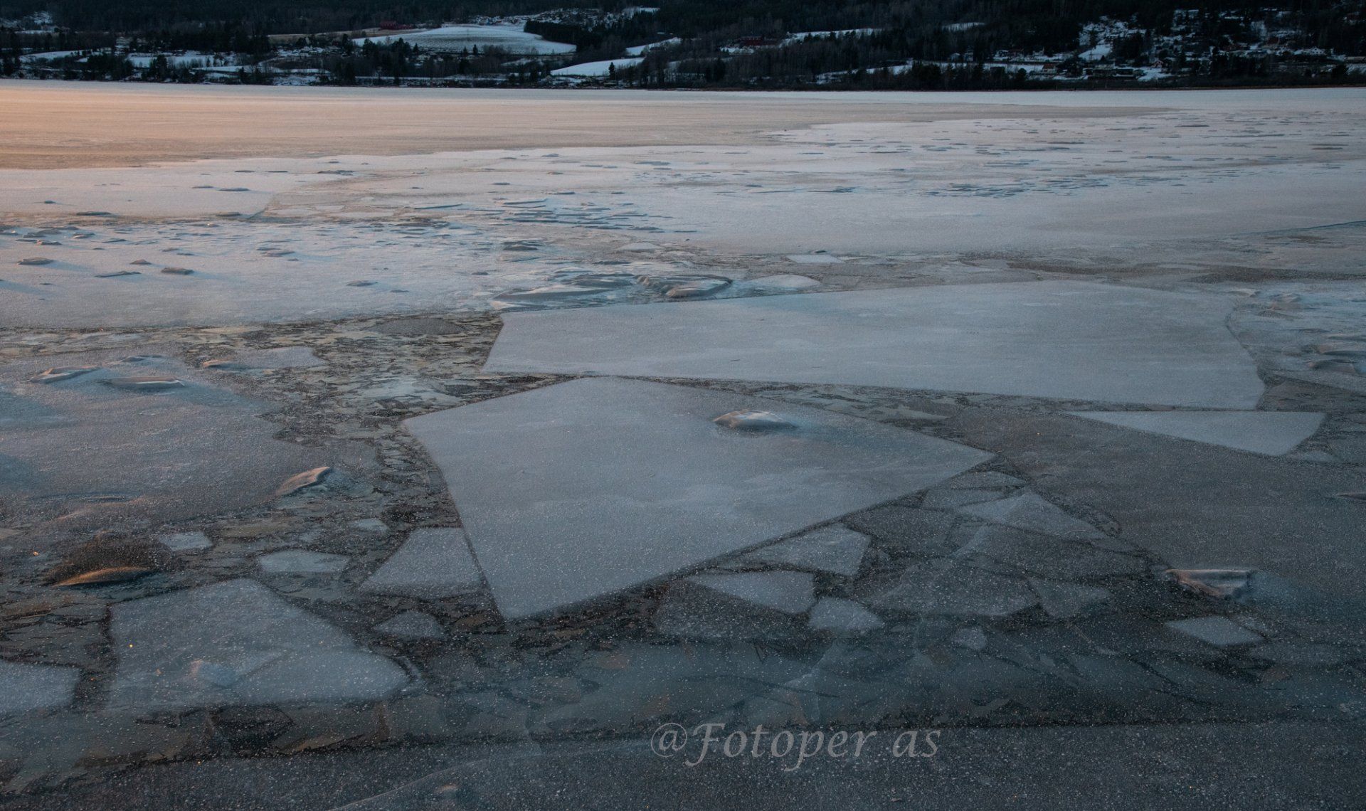 Ja, så ble det Røssholmstranda i solnedgangen igjen. Det vil si, jeg var ute i god tid så jeg fikk noen bilder før sola krabba nedover. Dessverre var det et lag med noe hvitt på isen, derfor var det nesten ikke noe klar is.