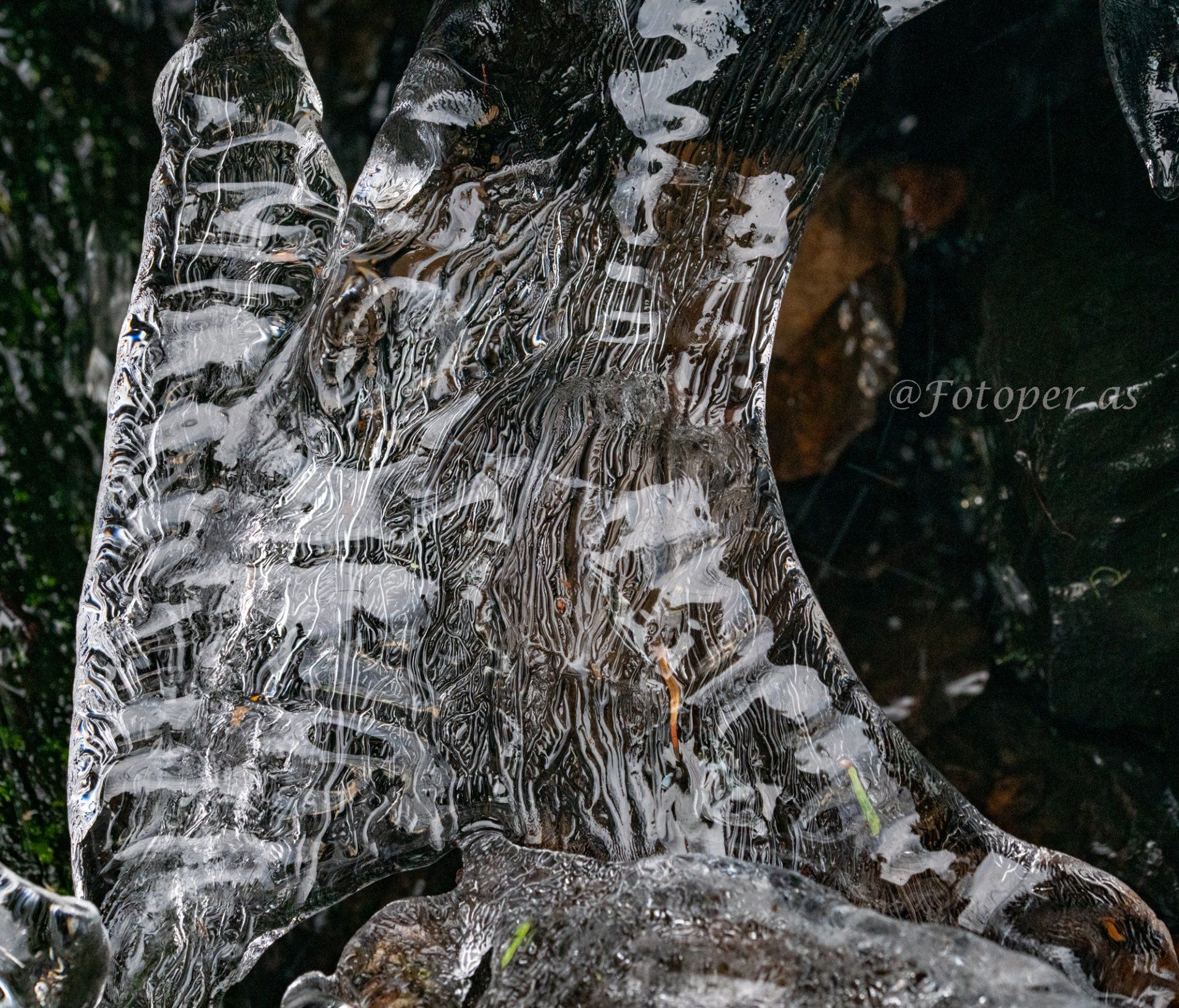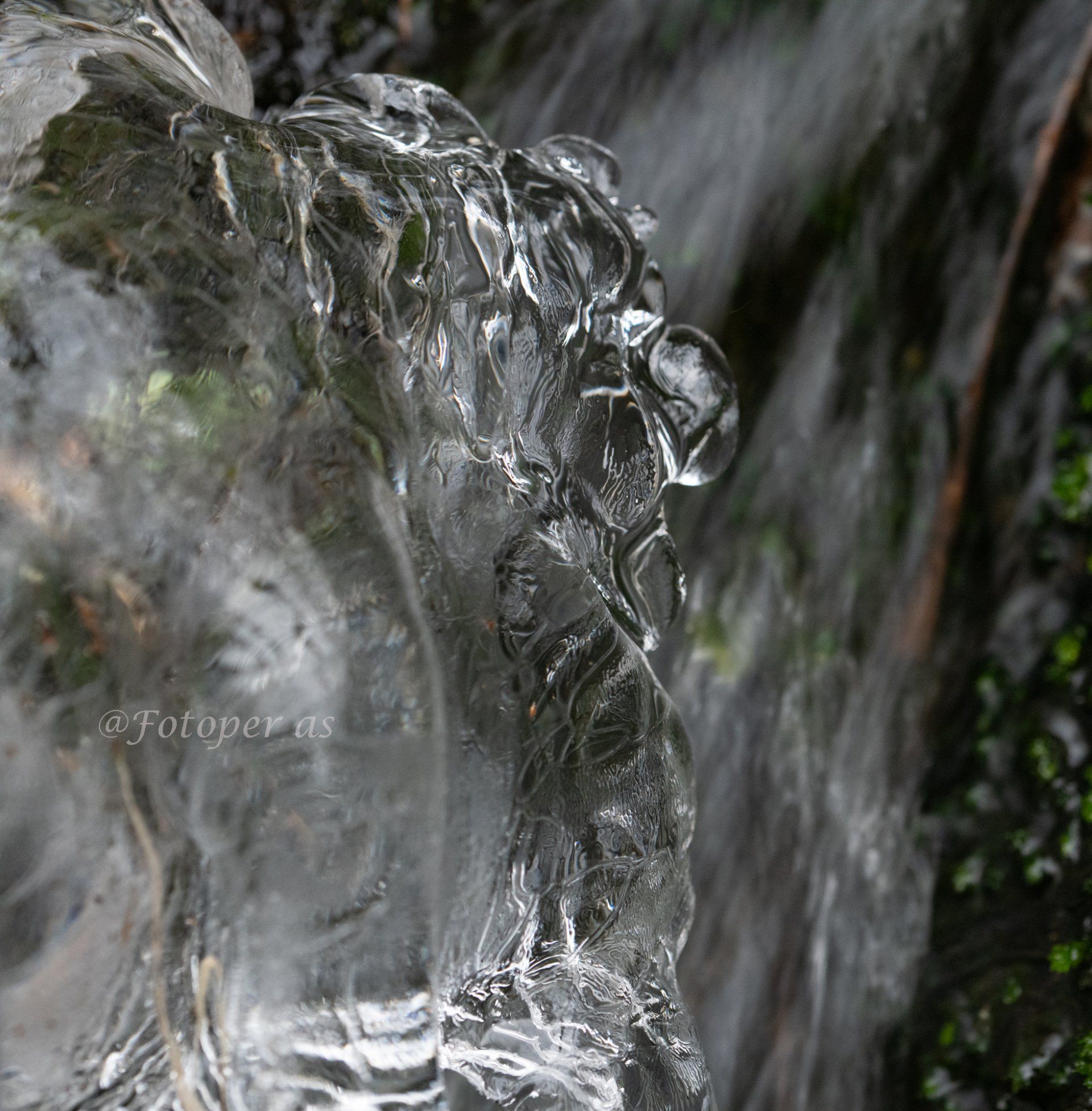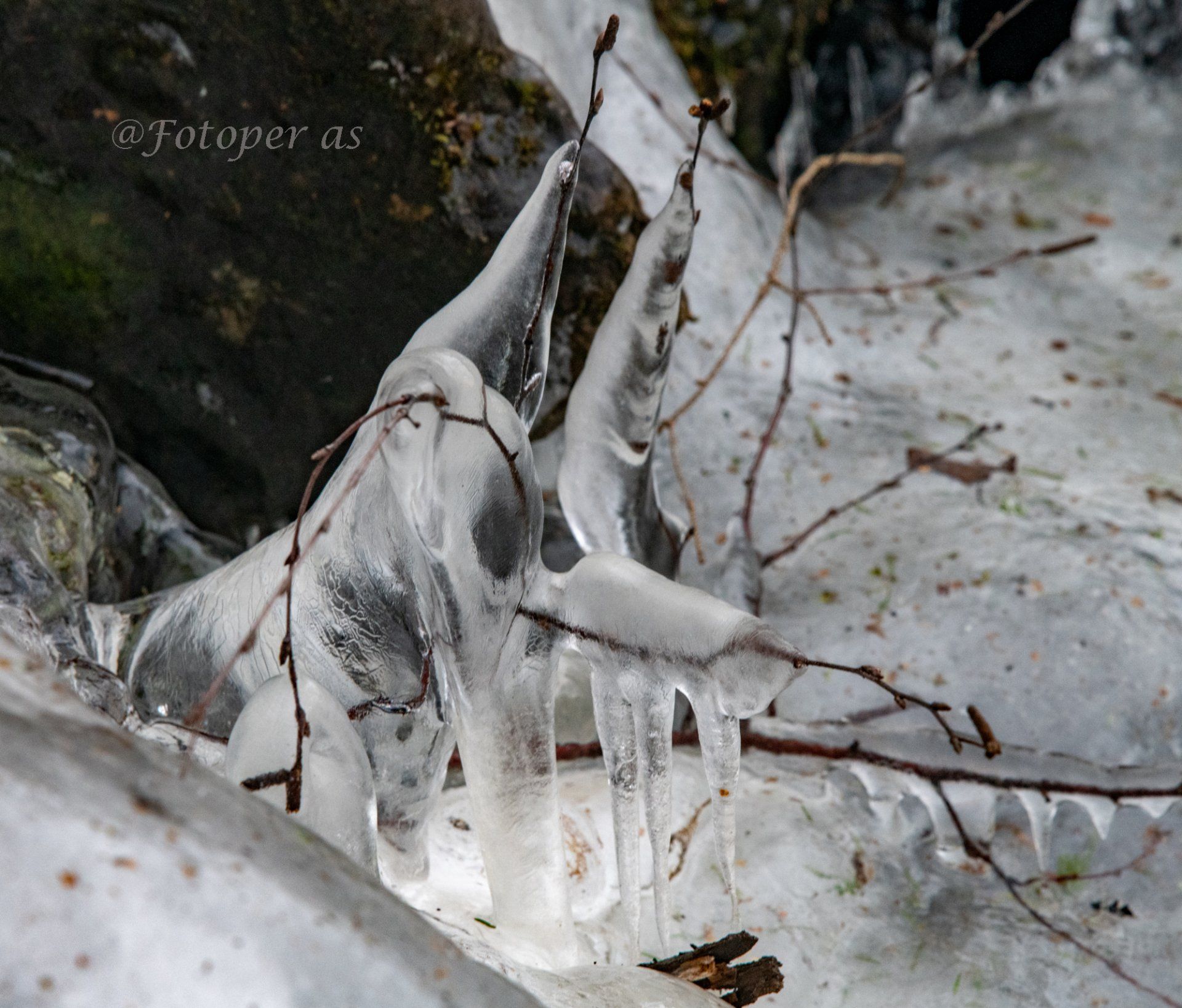 Nede i Dronningveien kommer jeg til bekken som renner der og stopper for noen bilder. ADVARSEL: Ikke gå på isen i bekken, den er veldig glatt. Mister du festet har du ikke sjangs og kommer til å rase utfor og kommer til å "slå deg i hjel". Jeg holdt meg på barbakke ved siden av bekken, det var tryggest. Mange spennende motiver i is, bare å slippe fantasien løs. Er det nøkken som ligger her og venter?