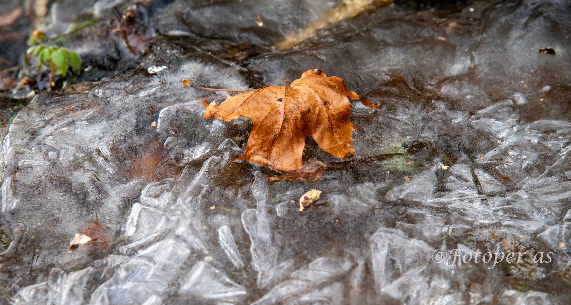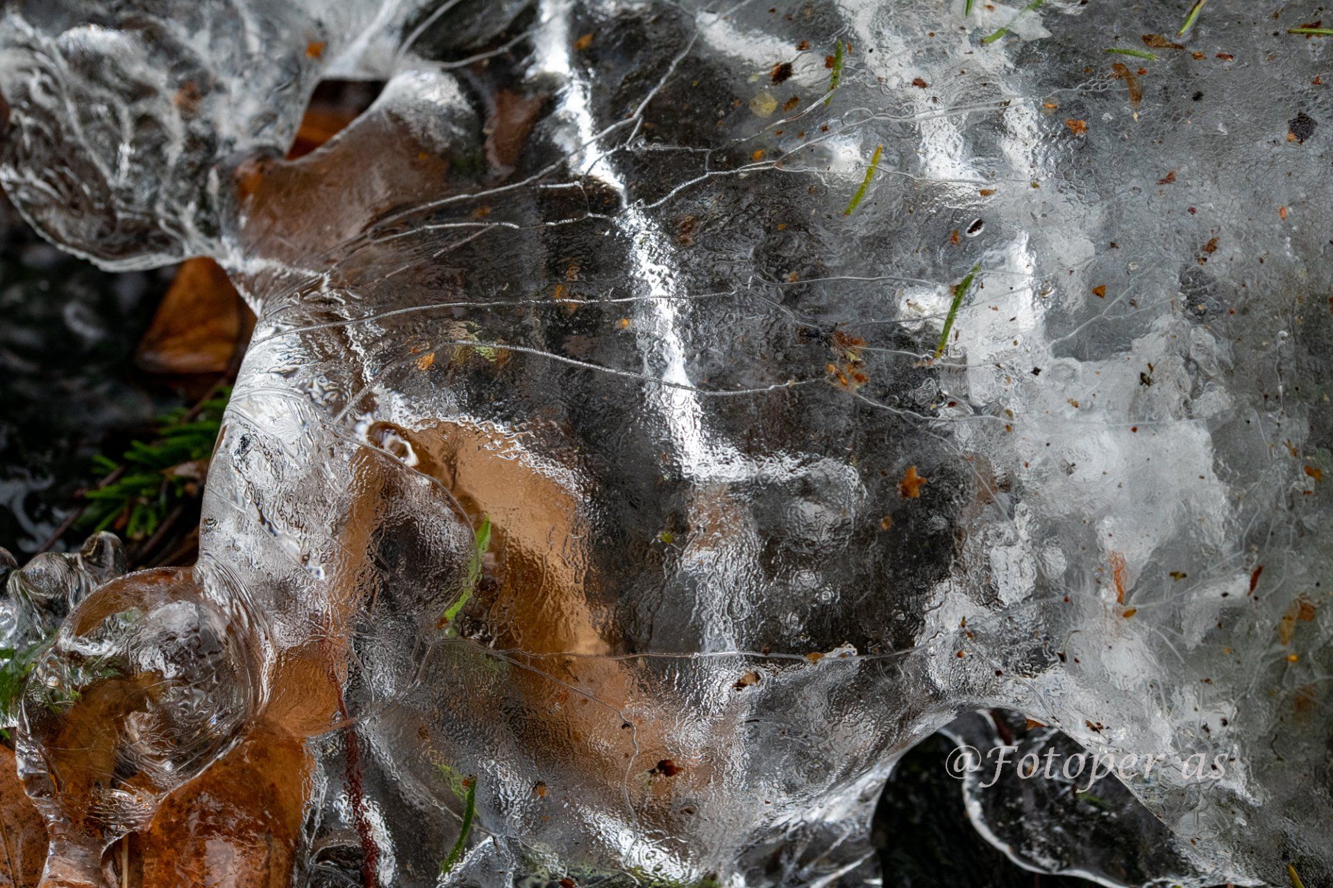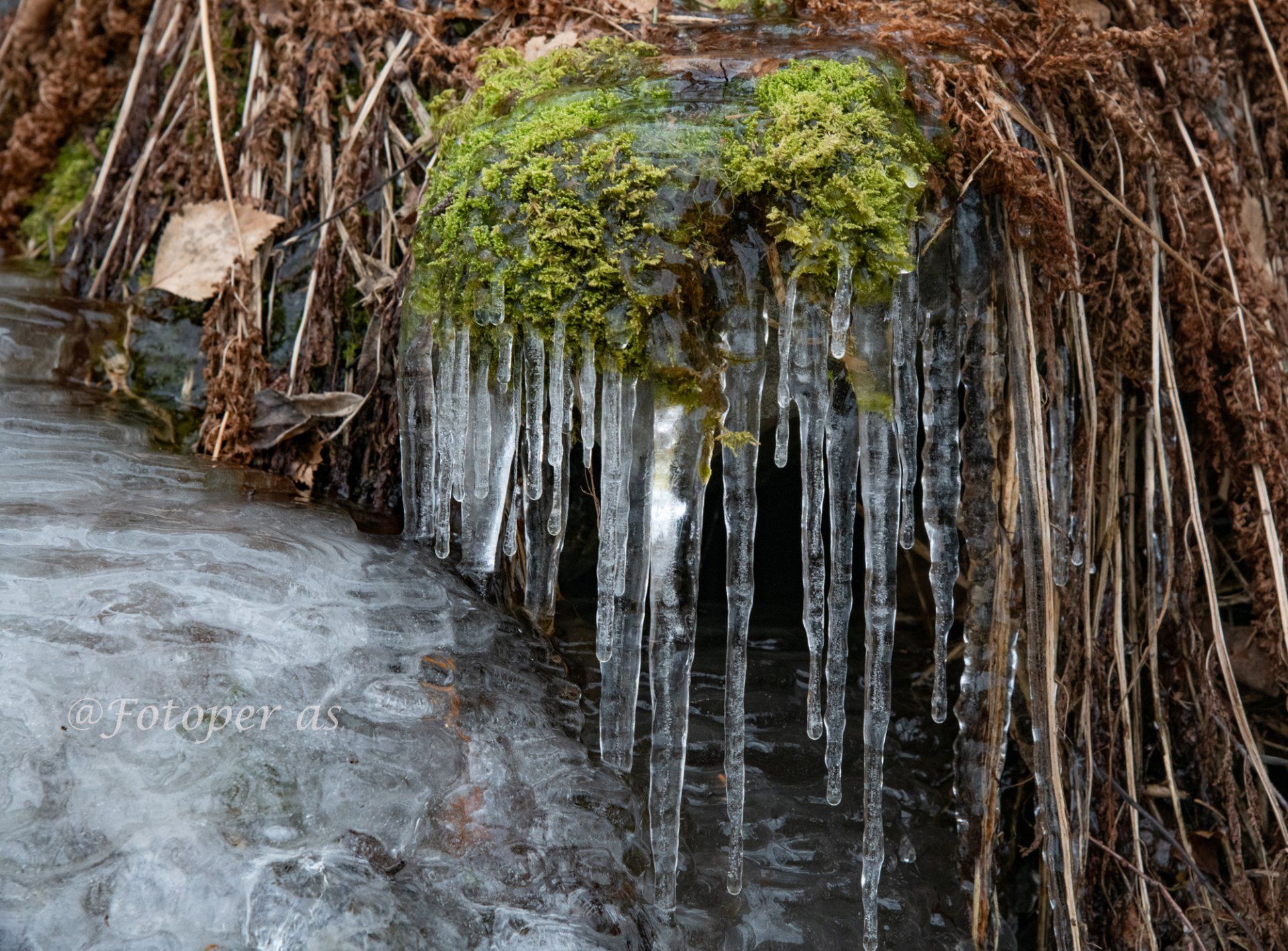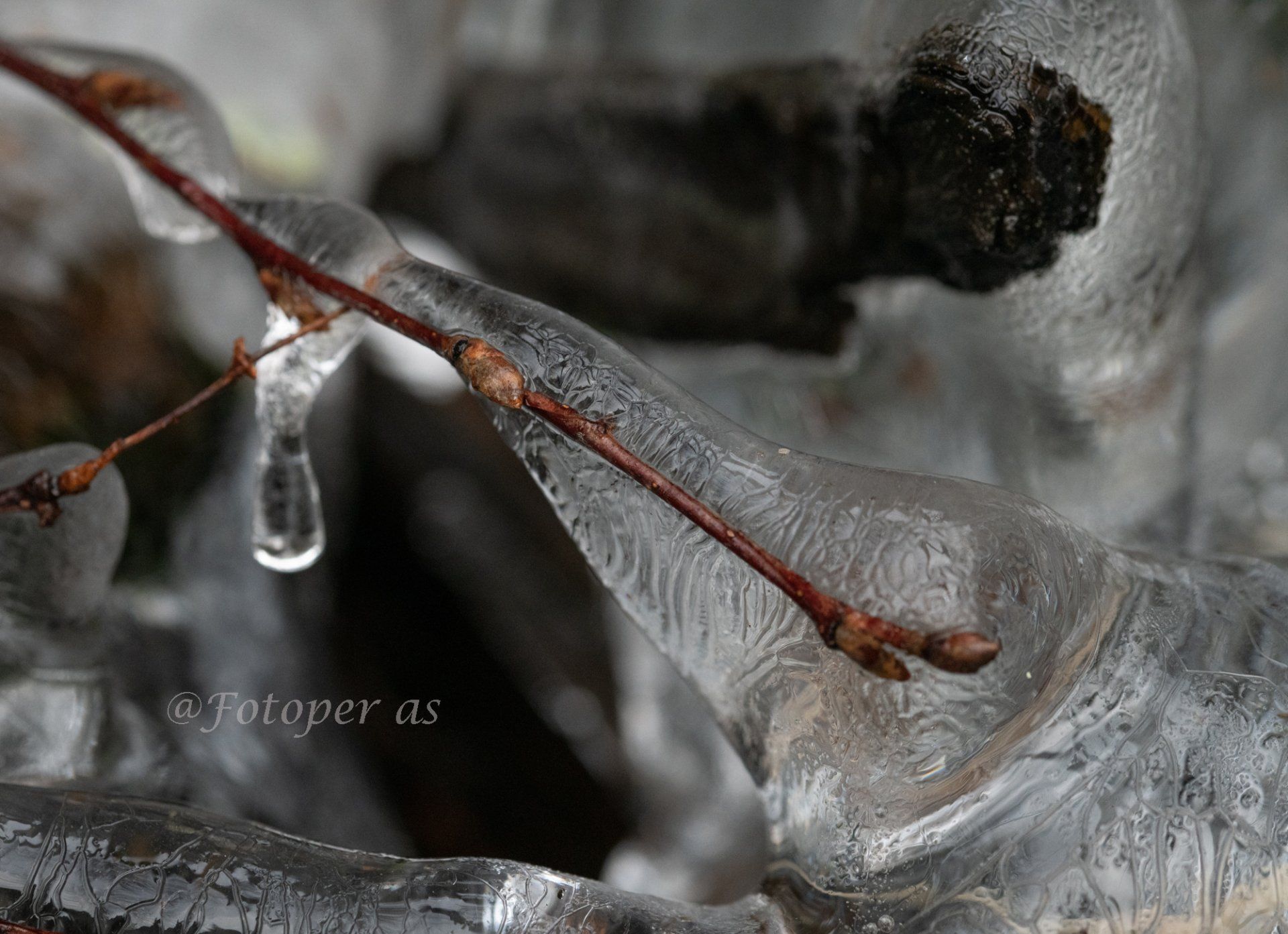 Nede i Dronningveien kommer jeg til bekken som renner der og stopper for noen bilder. ADVARSEL: Ikke gå på isen i bekken, den er veldig glatt. Mister du festet har du ikke sjangs og kommer til å rase utfor og kommer til å "slå deg i hjel". Jeg holdt meg på barbakke ved siden av bekken, det var tryggest. Mange spennende motiver i is, bare å slippe fantasien løs. Er det nøkken som ligger her og venter?