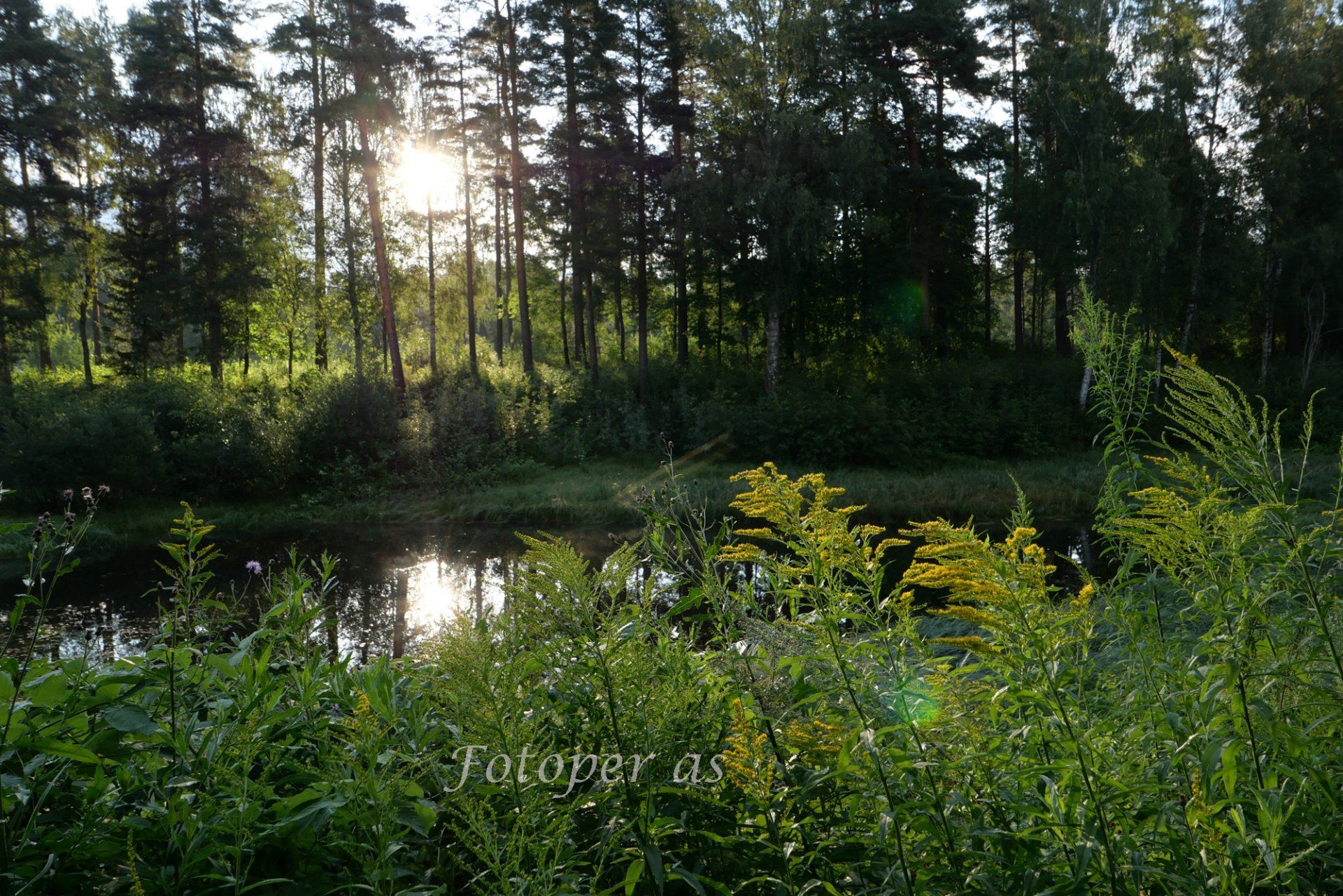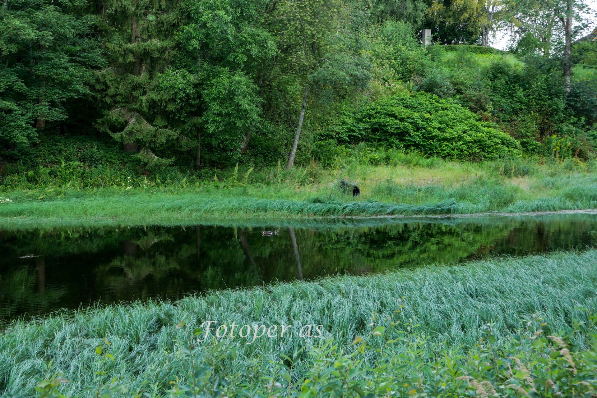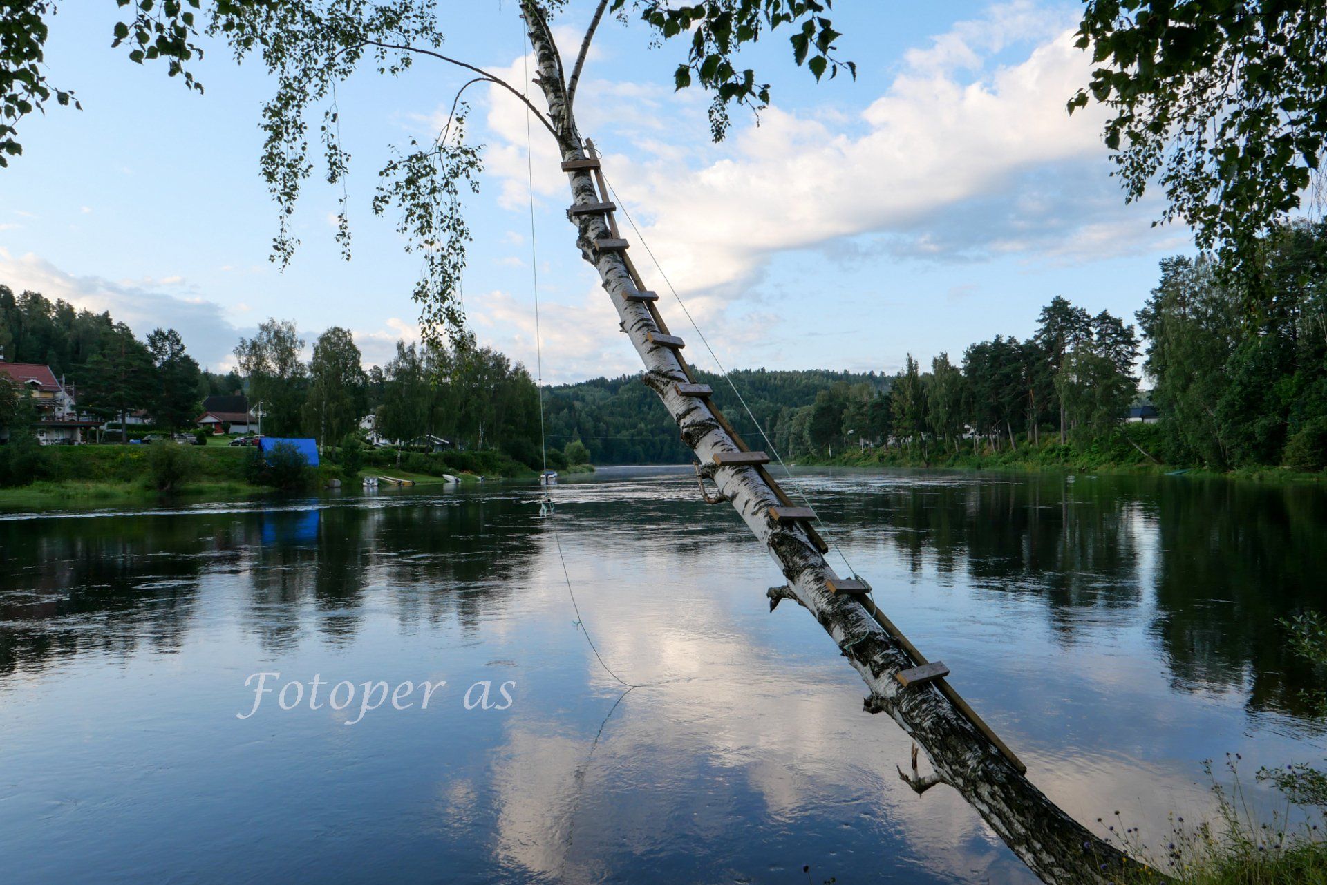 Ser det er mye vann i elva, det går ikke an å komme tørrskodd ut på øyene i elva nå. Det er tett med blomster av forskjellige slag langs stien på Petersøya. Ser også bringebær og en annen rød bær. Bringebær er trygg å spise, men den andre bæra vil jeg holde meg langt unna (tror den er giftig). Nærmer meg ytterste punktet på turen rundt Petersøya. Bjørkene langs elvekanten står så fint her. I løpet av sommeren har noen festet noen trinn i den ene bjørka som lener seg ut over elva. Helt øverst er det et tau, her er det bare å slenge seg ut i elva. Hvis du tør å klatre opp først da.