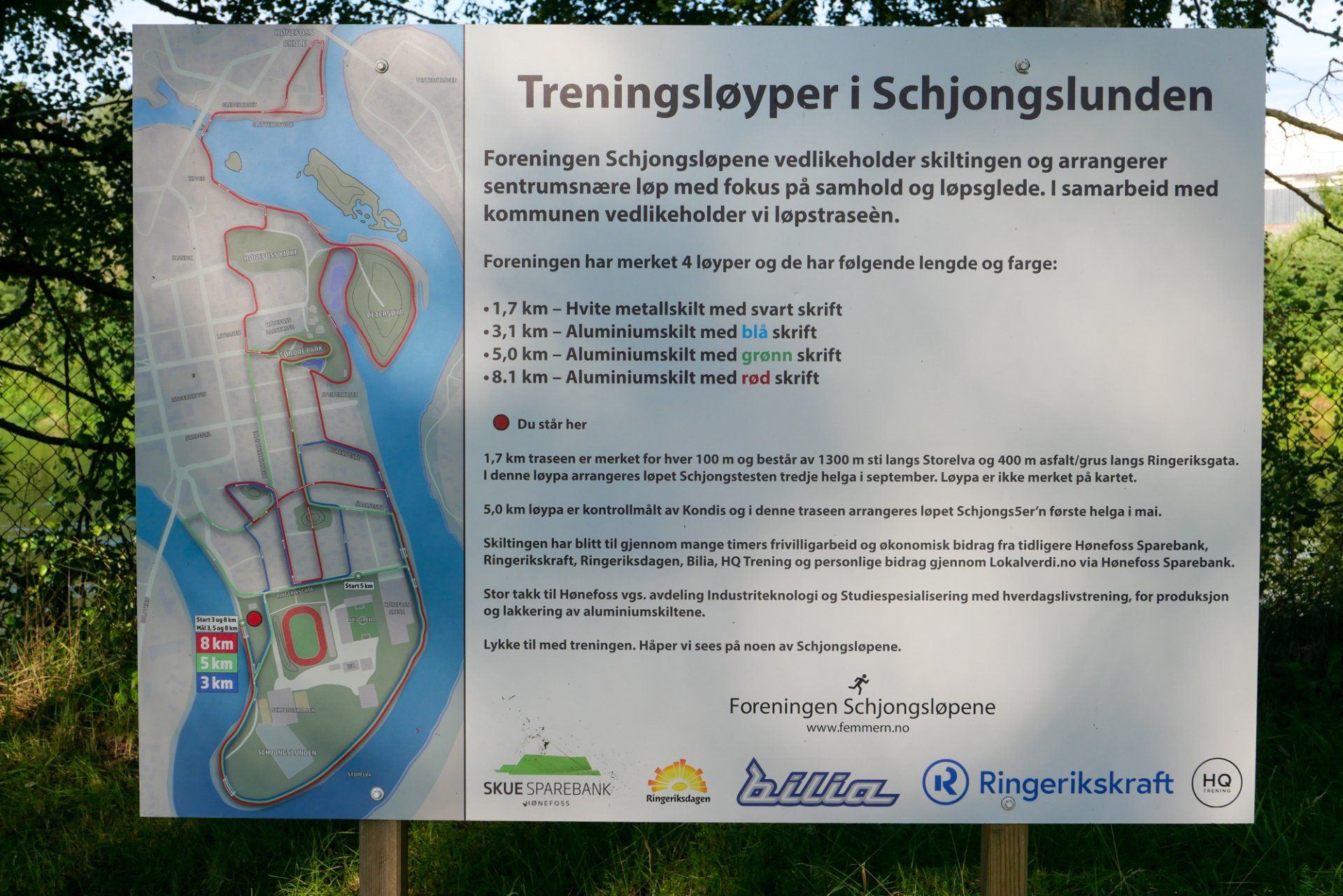 Schjongslunden er et populært sted å gå, løpe og bade. Ved inngangen fra Ringeriksgata står det et skilt som forklarer hvor de forskjellige løypene gå. På vei mot sentrum ser jeg "den stygge andungen", Ringerike rådhus, speile seg i blikkstille Storelva. Brua over elva er ikke så vakkert syn nedenfra, men nesten like stygg er haugen med kvist og kvast som ligger ved det ene brukaret. Det hadde pyntet opp litt hvis noen kunne fjerne dette. Et annet sted som trenger litt opprydding er i skråningen mellom gangveien og brua. Her er det vel sådd gress en gang, men ugress har overtatt hele området. Her bør rette etat trå til så det blir penere ved "inngangen" til Hønefoss.