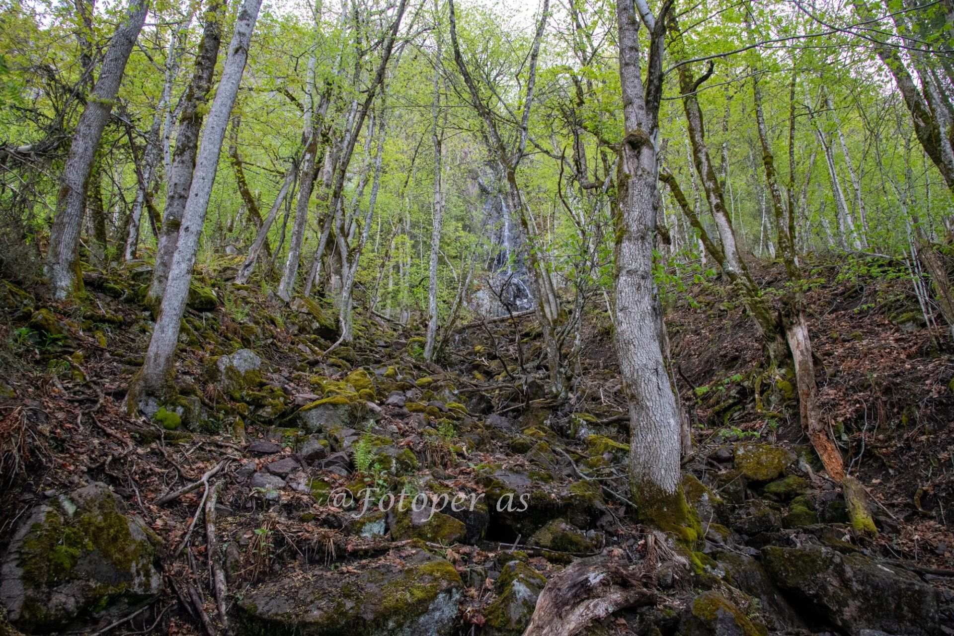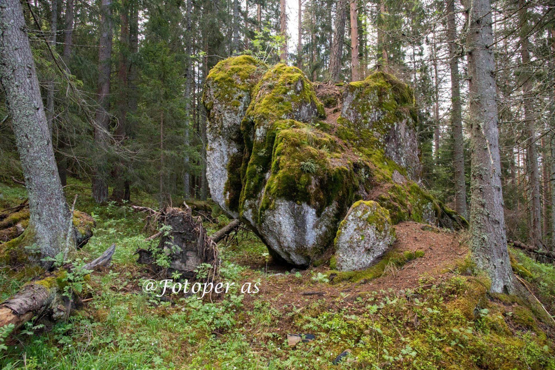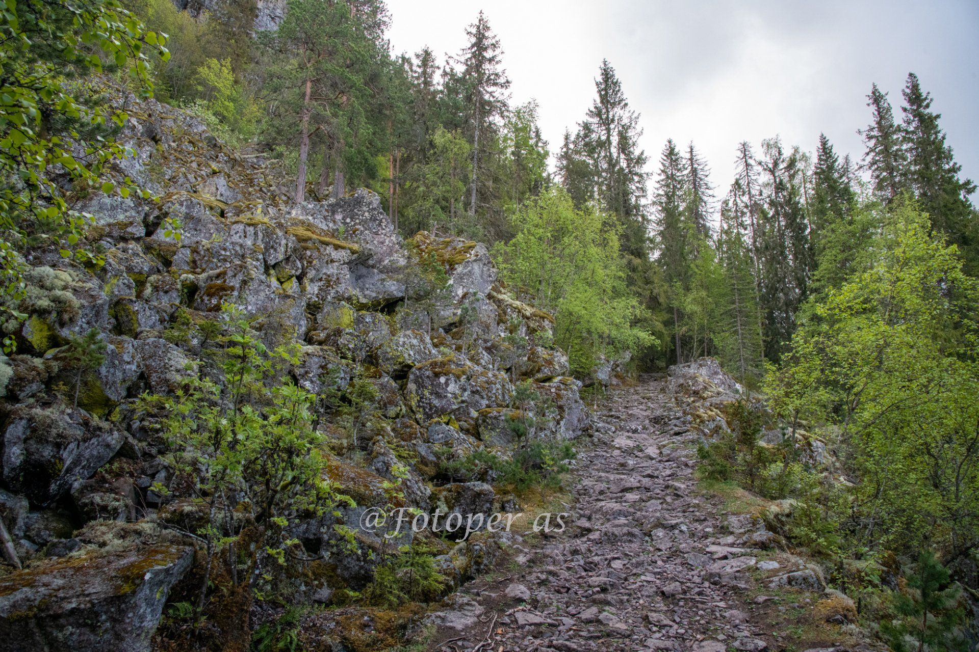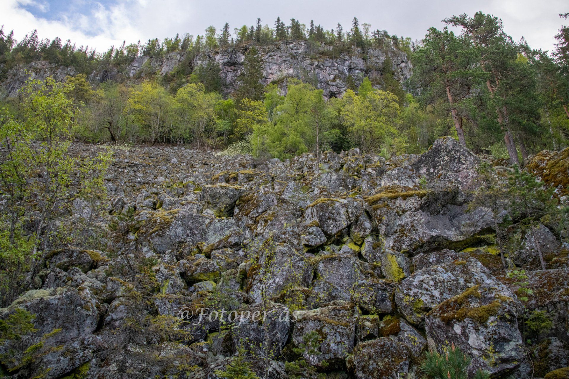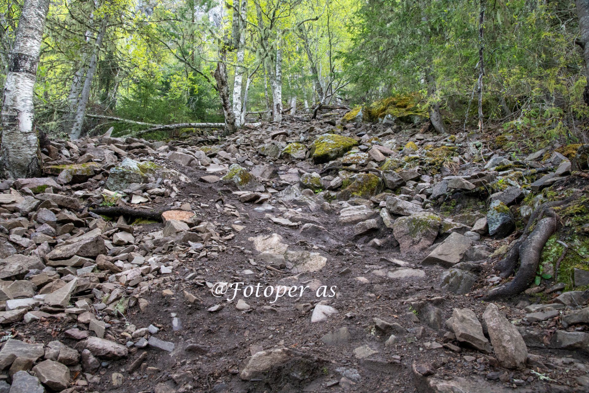 Pusten går litt tyngre nå og svetten renner fra panna. Har problemer med at det dugger på brilleglassene, det gjør at jeg ser sånn halvveis bare. Og det gjør at jeg passe ekstra godt på hvor jeg trår fordi jeg ser ikke så bra. Det begynner å bli så bratt at jeg må legge meg godt frampå, så jeg ikke tipper bakover. Flere trær ligger på tvers her, og jeg må krype under eller gå over. Heldigvis har jeg ingen foran så det raser ikke noen steiner mot meg. Jeg begynner å nærme meg fjellveggen, kan se den foran meg nå og hører noen som er inne i skardet. Det er noen år siden jeg var her sist, men jeg ser at det er mange som har gått her siden den gang. Det er slitasje på bl.a. røttene.
