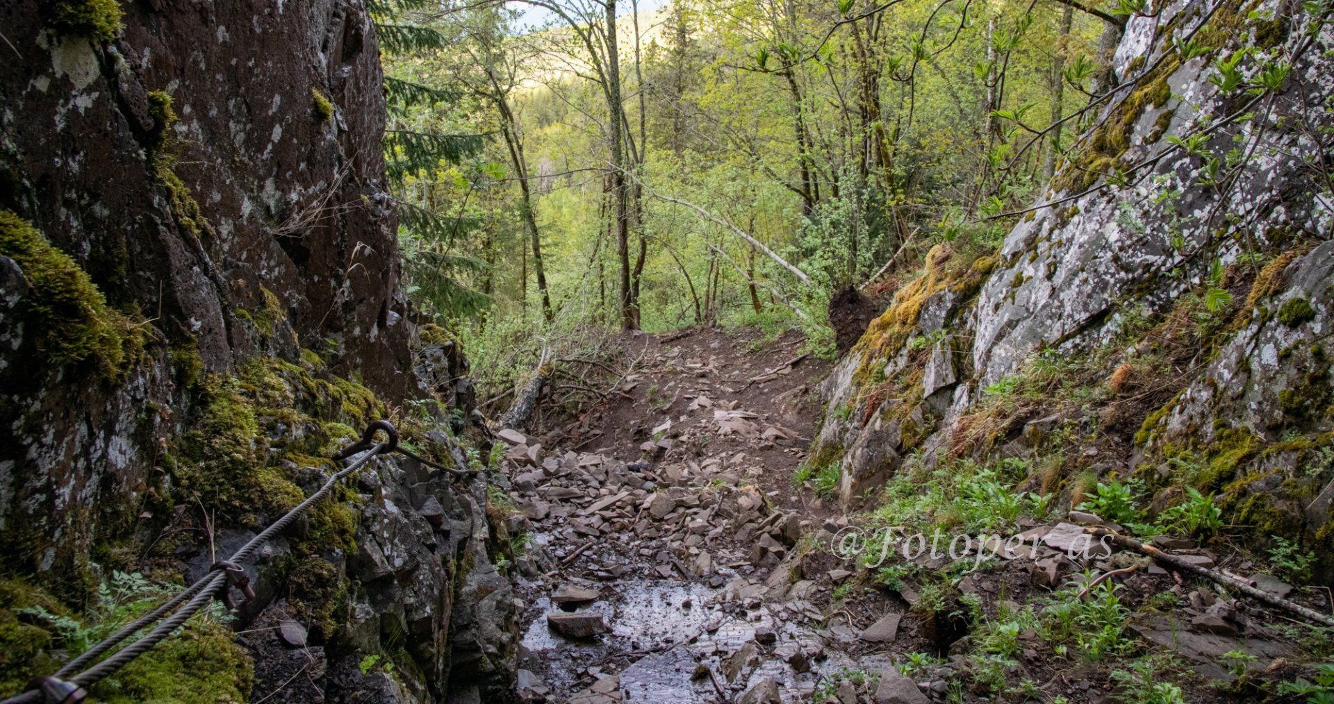 Det har regnet en del de siste dagene, det merkes her i skardet. Det renner litt vann og steinene er glatte. Det er bra det er en wire her for å holde seg fast i og dra seg opp med. Må stoppe av og til for å ta bilder, men nå gjelder det å ikke miste balansen. Det kan bli dramatisk.