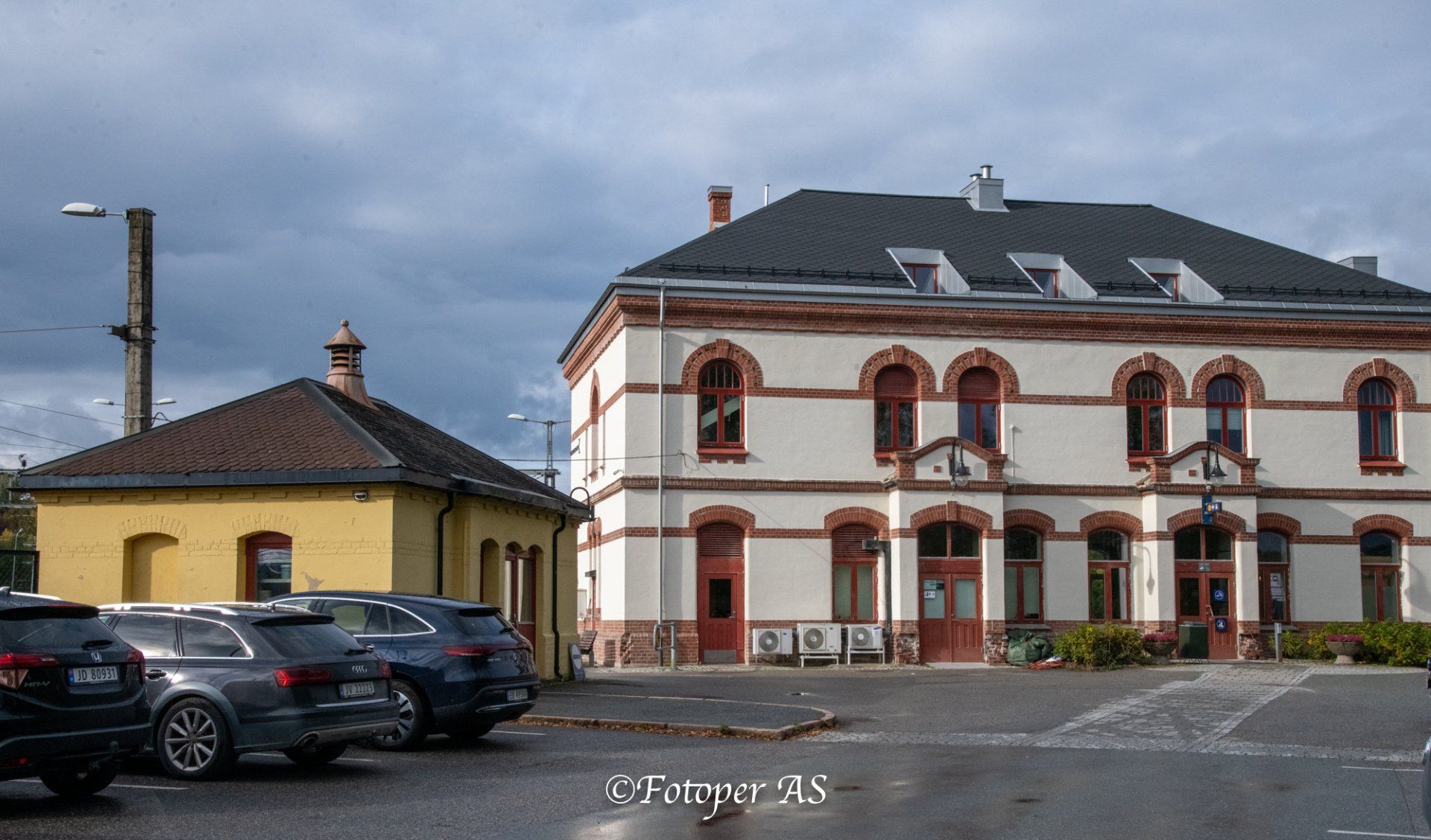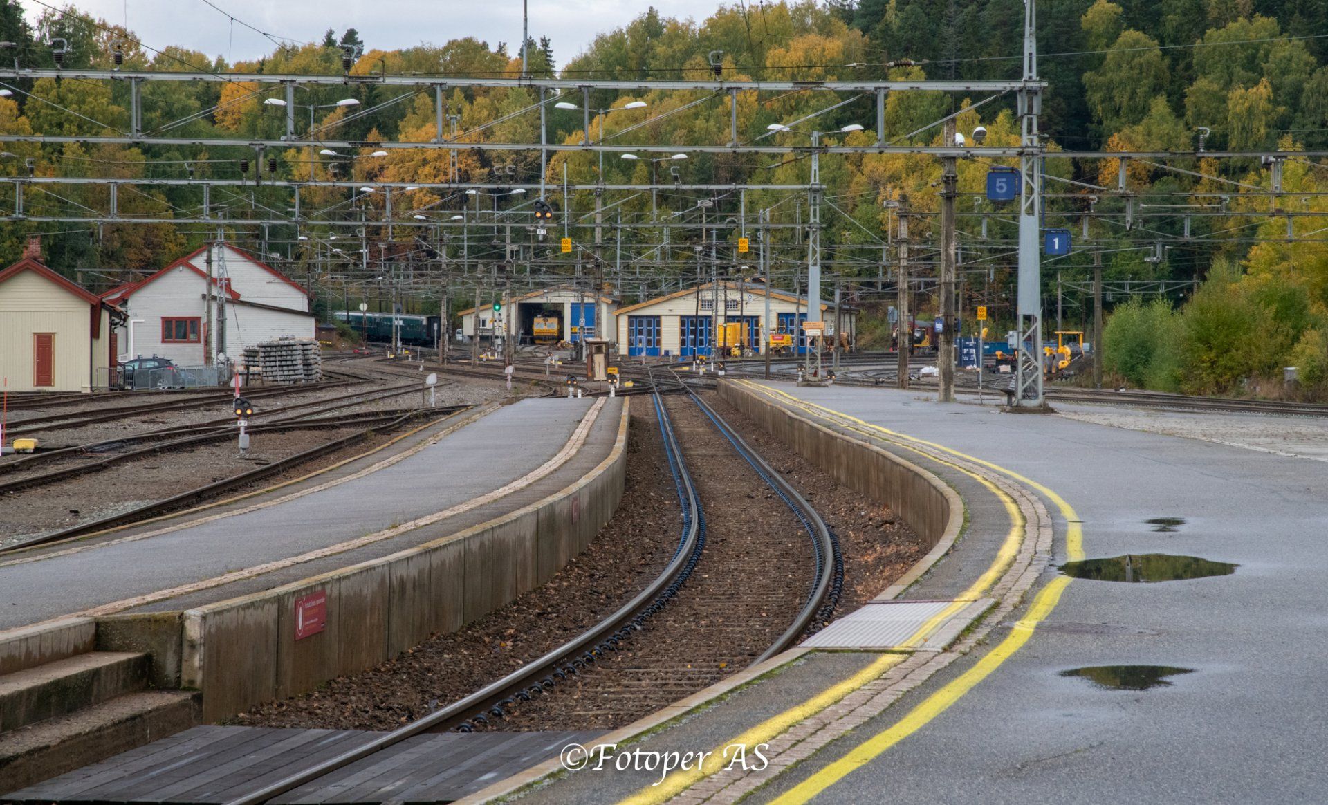 Hører fra høytaleranlegget på jernbanestasjon at toget til Bergen snart kommer. Jeg skynder meg opp dit, alltid litt å se på når toget kommer. Folk som stresser med å finne riktig vogn, noen som tar lykkelige avskjeder og noen som tar tårevåte. Eller noen som er ute og tar ei røykepause når toget står parkert, som i dag. Går bort på jernbanebrua, fin utsikt mot sentrum herfra. Nå ser jeg godt den nye fargen på hovedhuset på jernbanestasjonen, sammenlignet med den gamle fargen som er på sidebygningen. Hvilken synes du er finest?