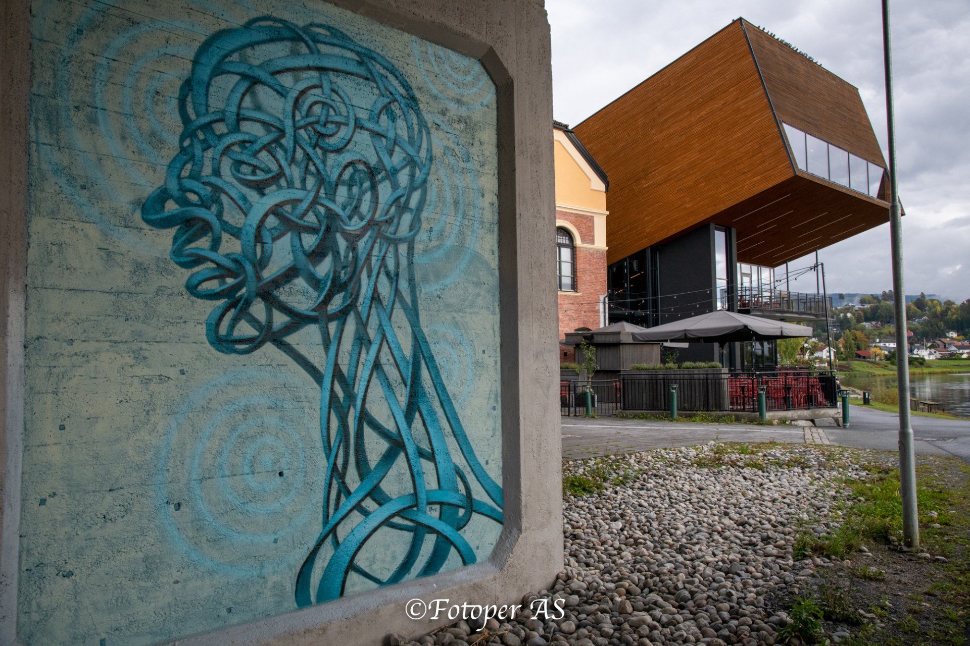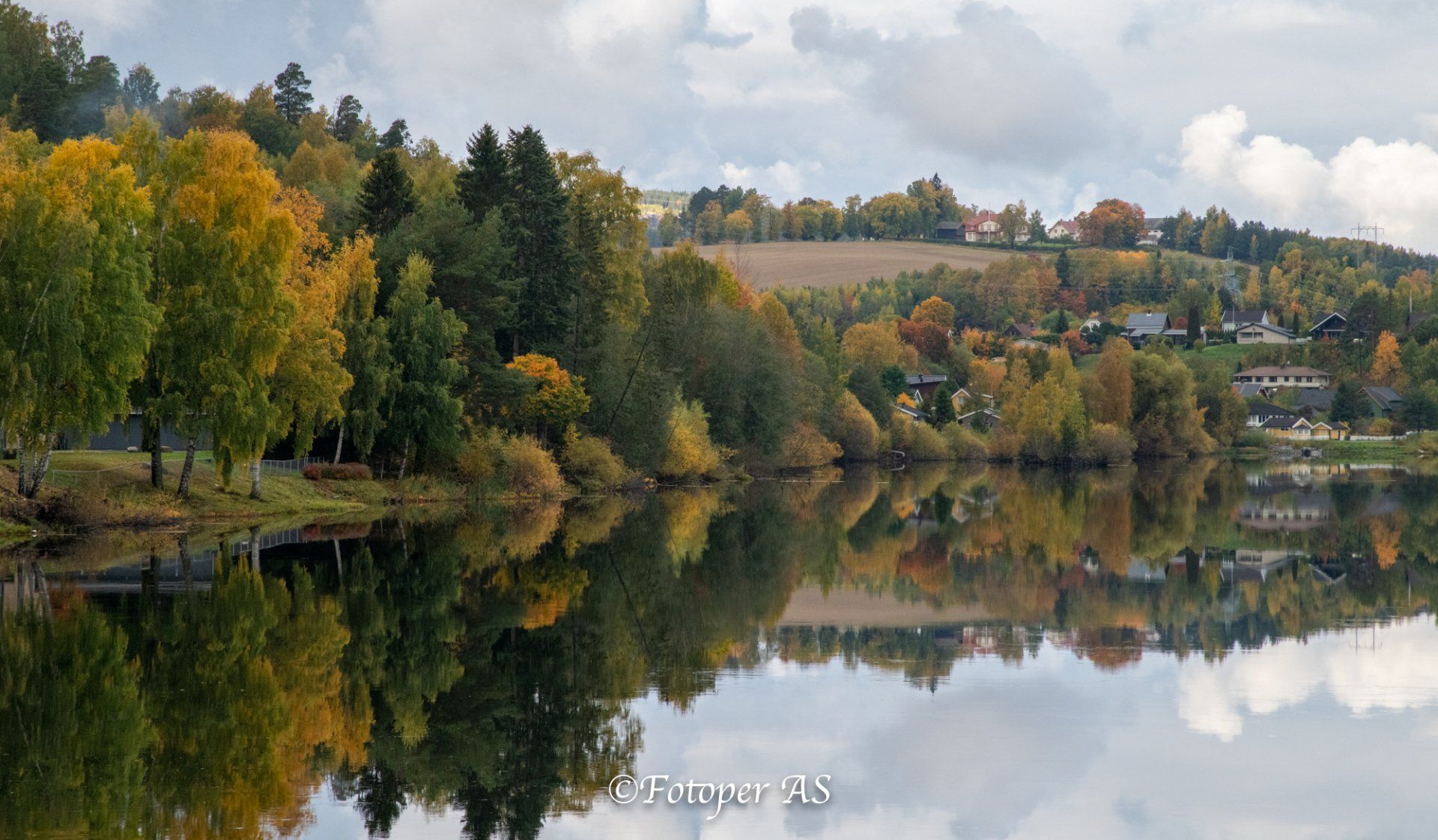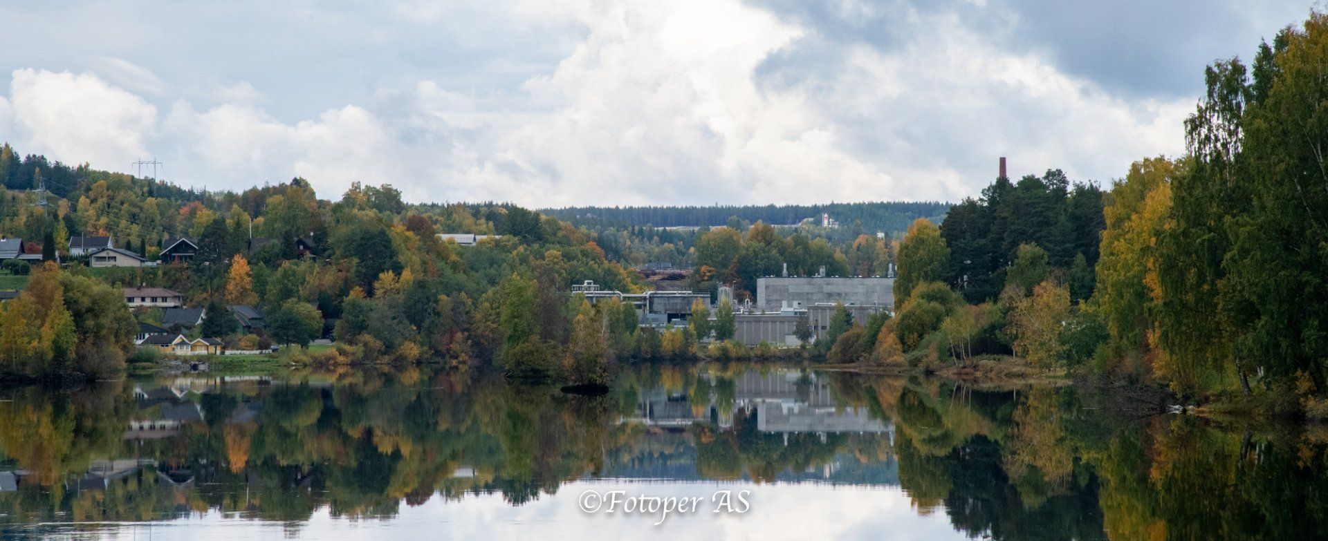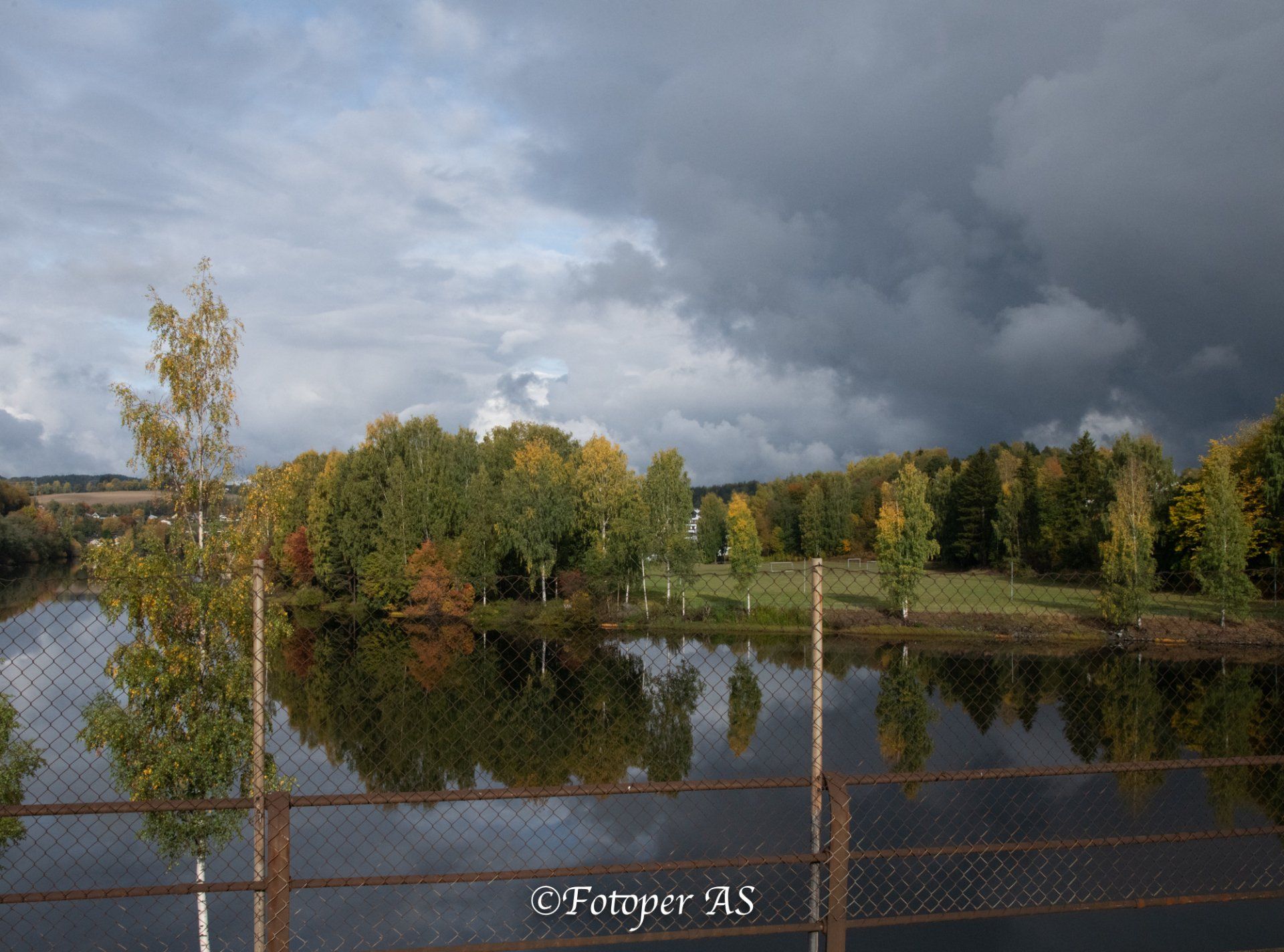 Det har regnet godt i natt, men på formiddagen gir regnet seg. Jeg tenker at i dag skal jeg bare gå en tur i Hønefoss, så får jeg se hva som byr seg av høstmotiver. Allerede "rett utenfor døra", ved elva finner jeg de første motivene. Follum fabrikker som jeg fortsatte kaller det, speiler seg i den rolige elva, omkranset av bjørketrær.