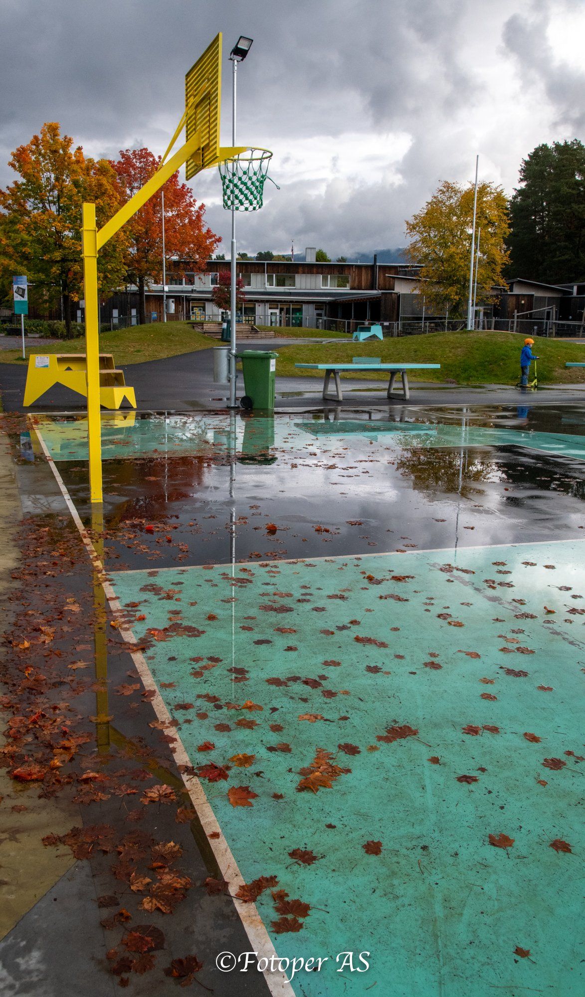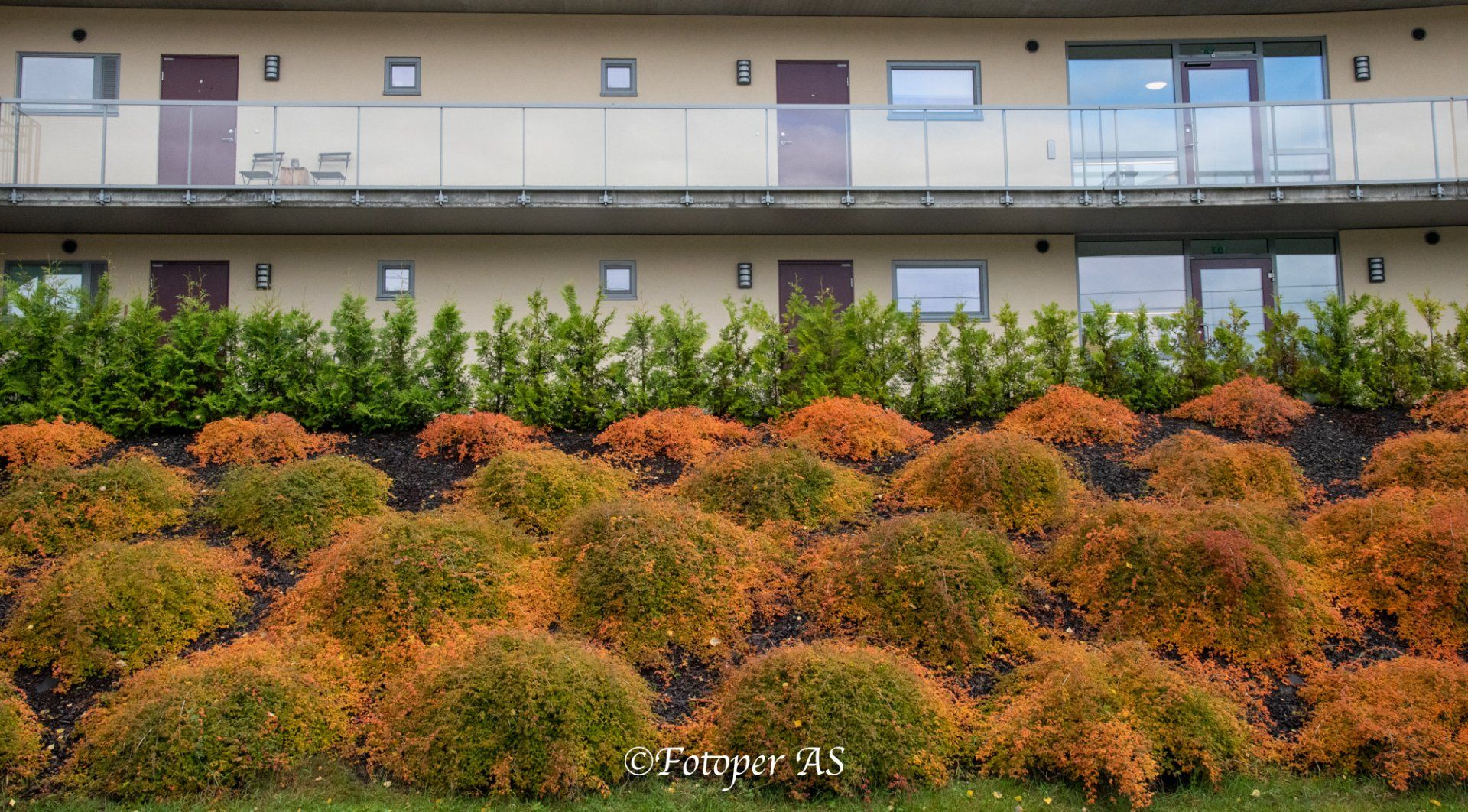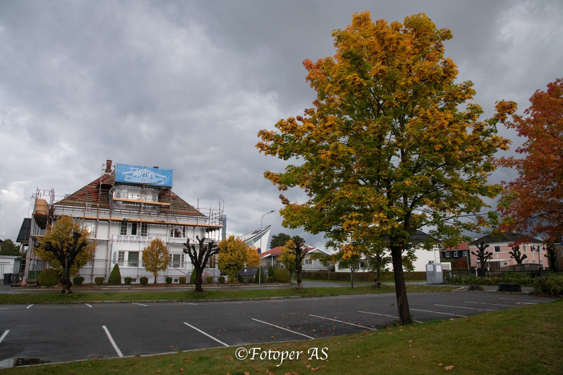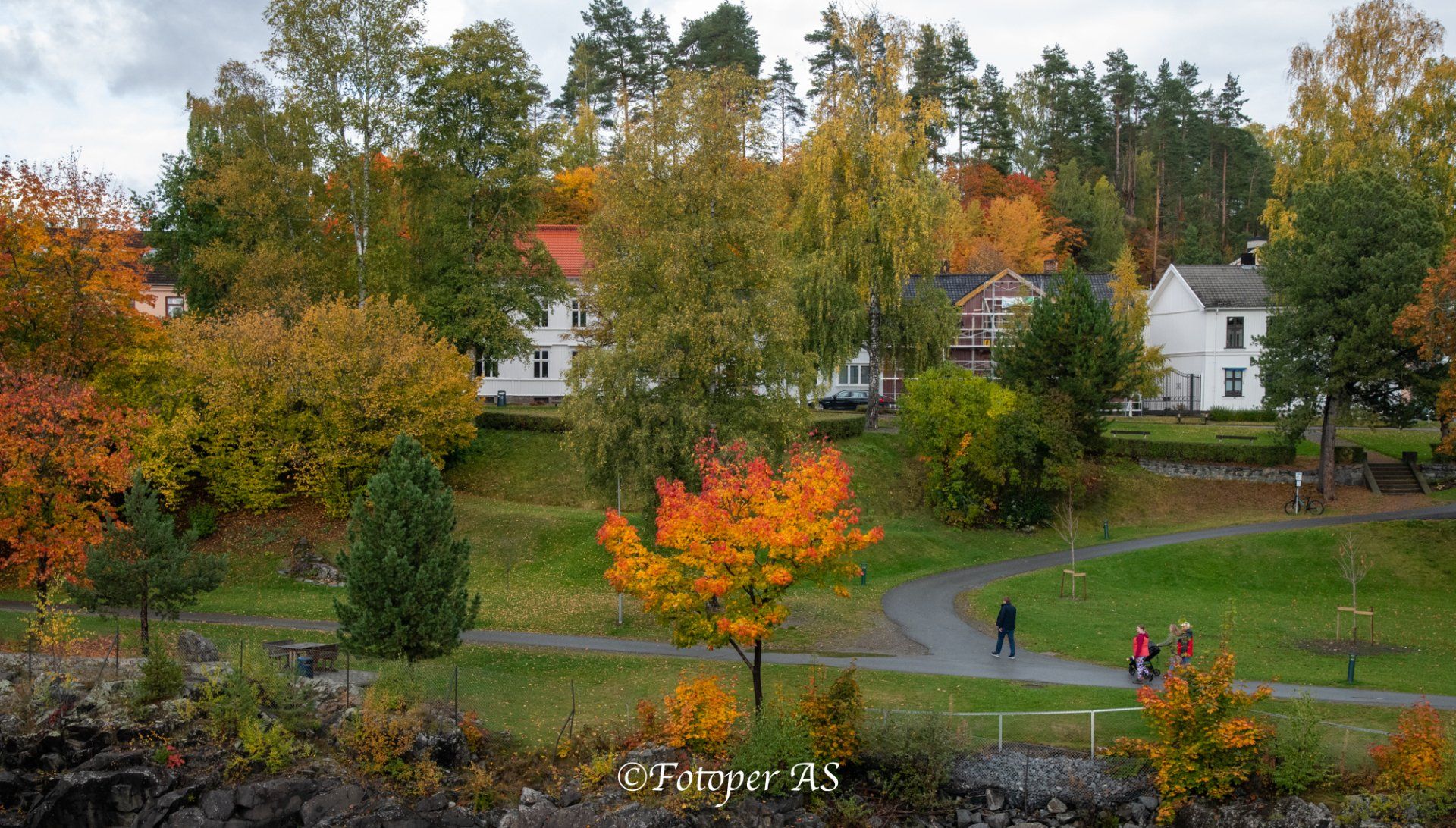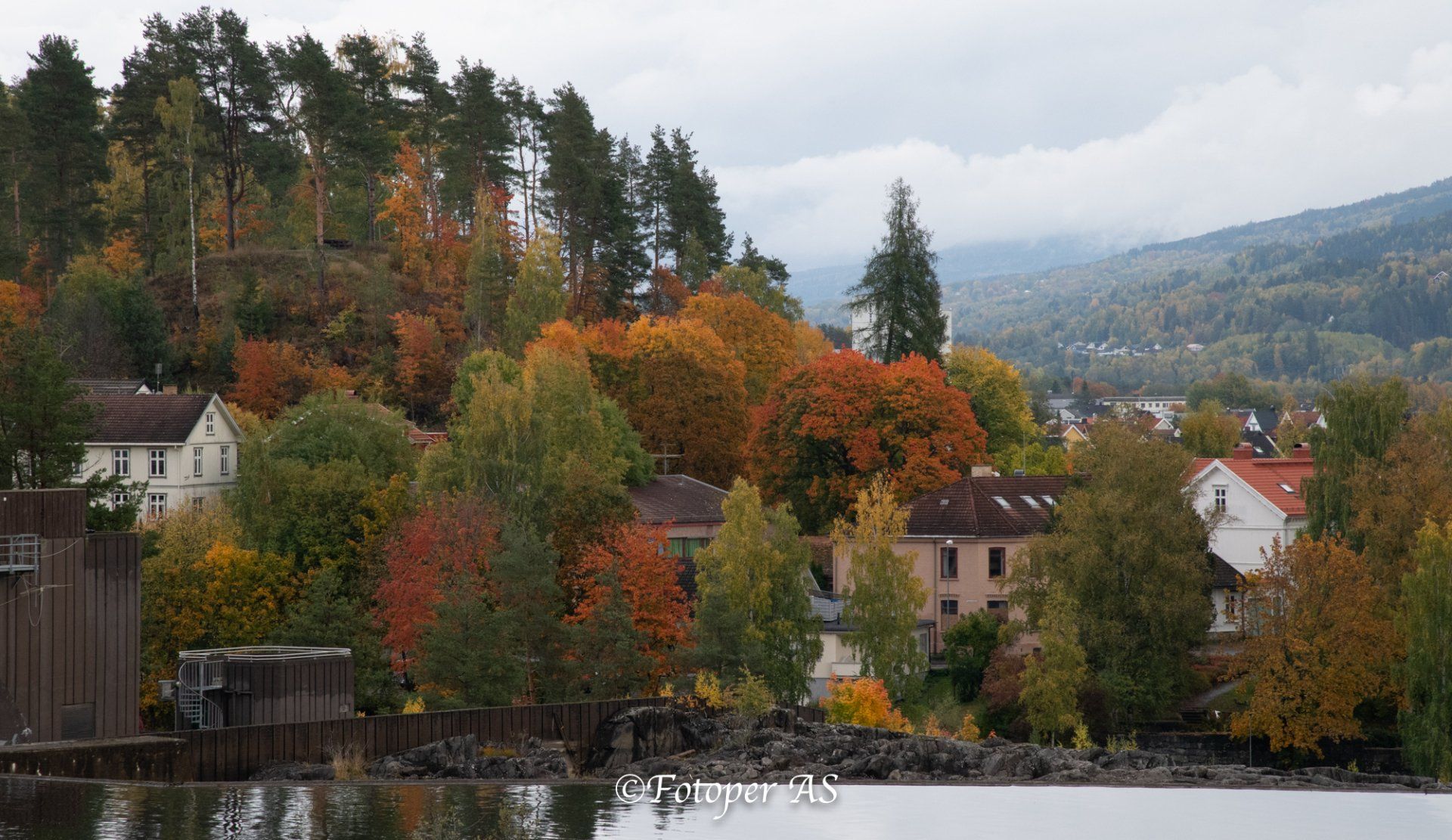 Jeg fortsetter hjemover. Det blir spennende å komme ut på den nye demningen når den blir ferdig. Ser over til de flotte trærne rundt den gamle Handelsskolen. Når blir det bygging dere tro? Det er fortsatt flott ved Molvald og opp mot Follum. Skråningen foran hos naboen er fargerik ut mot veien.