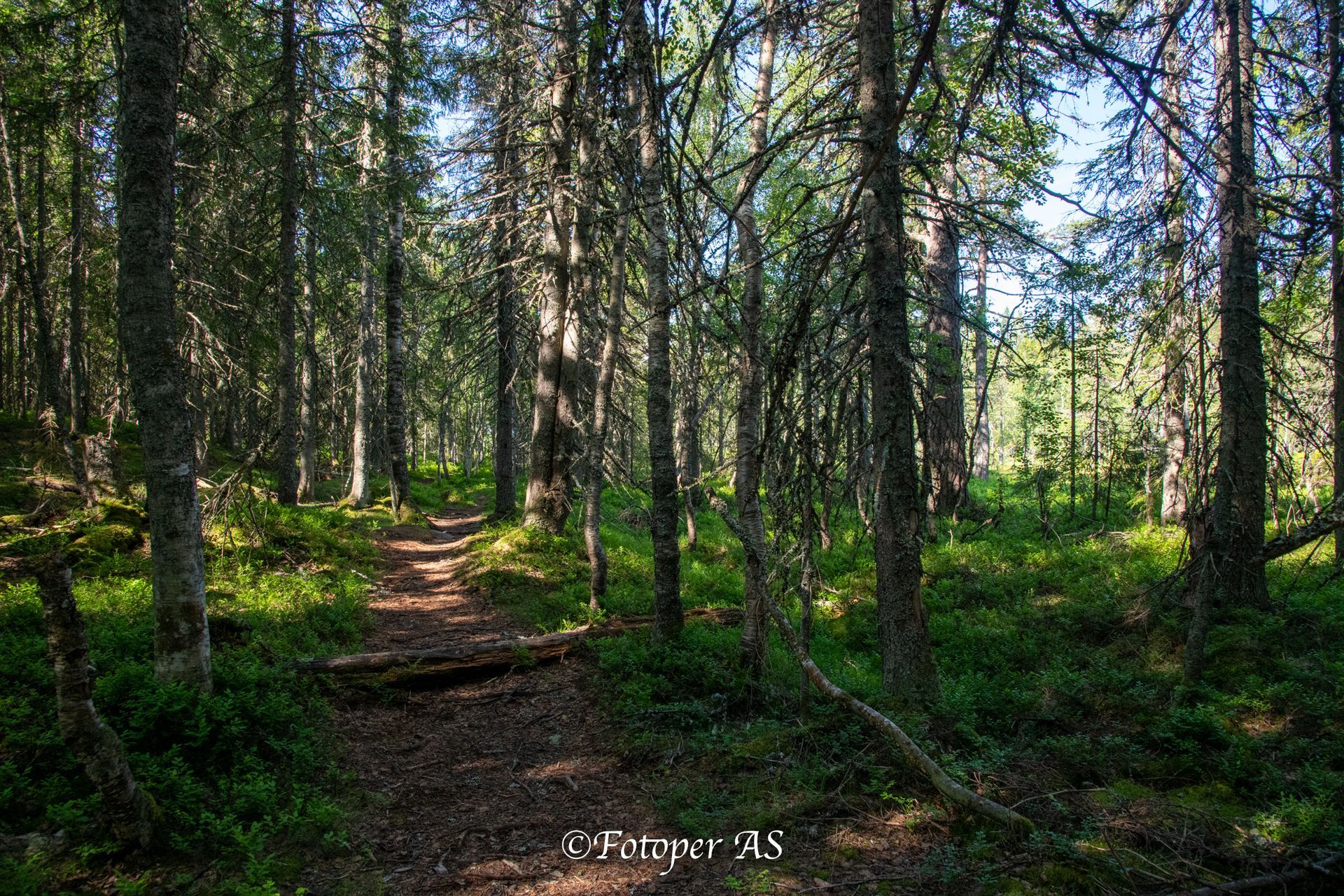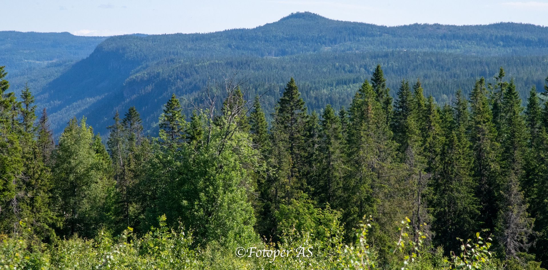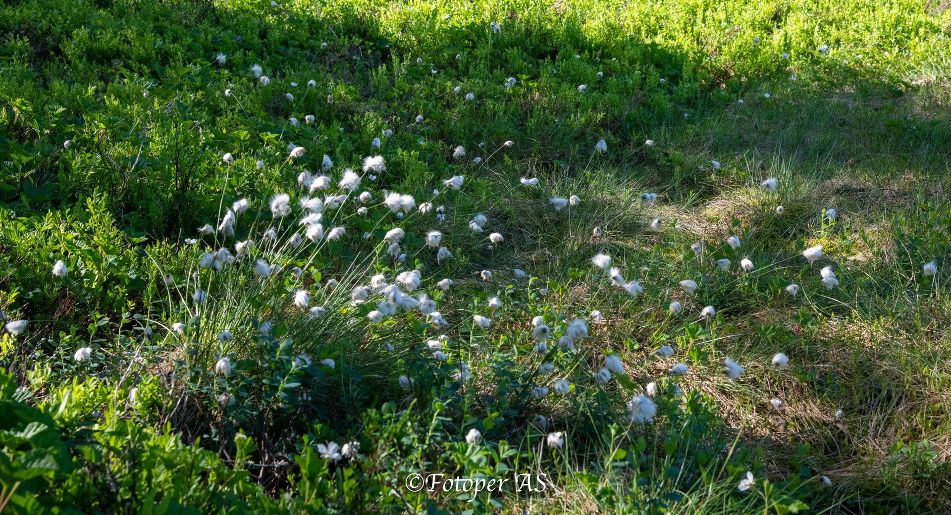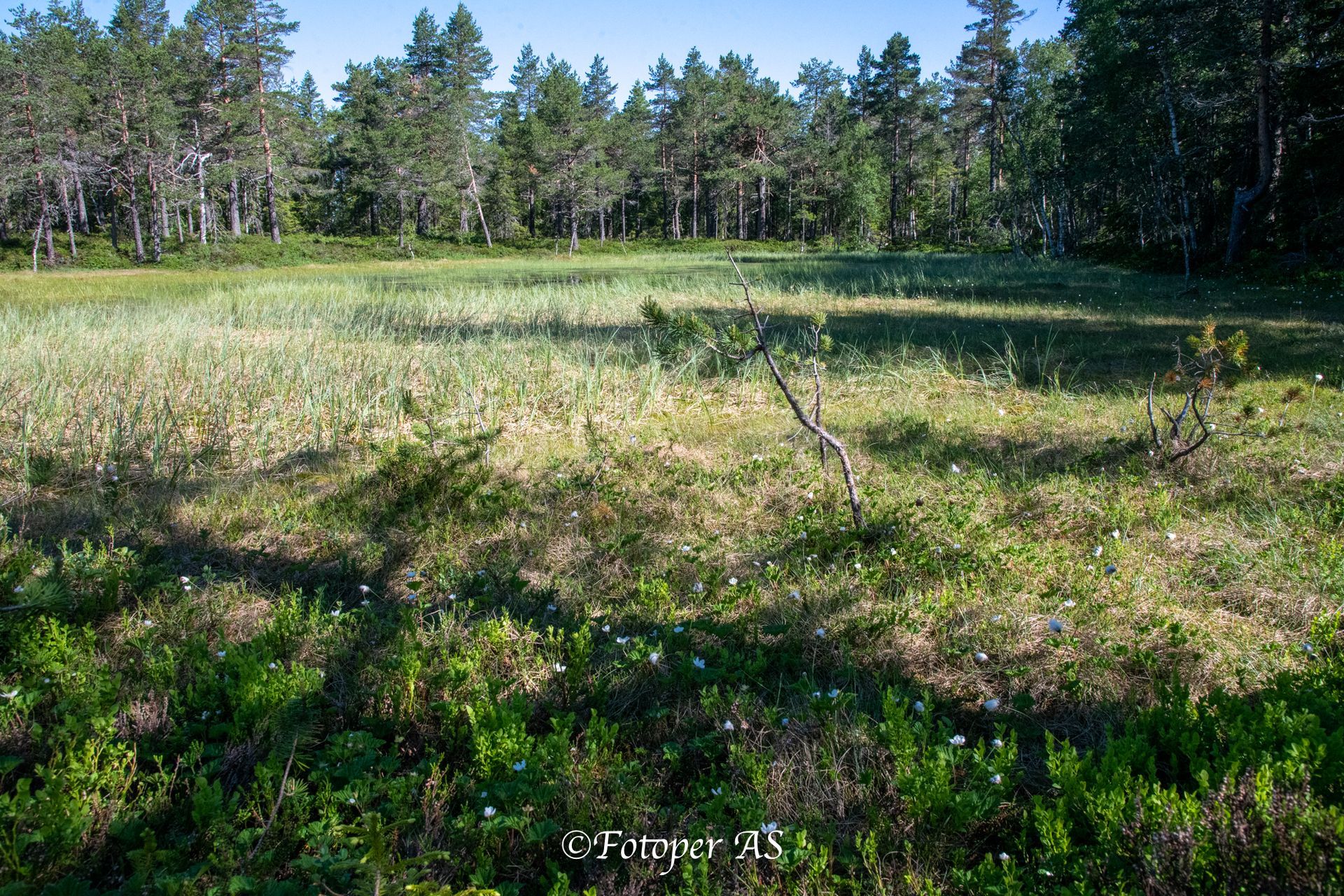 Jeg fortsetter på stien mot Finneflaksetra. Skimter ei myr på høyre side og svinger bortom den. Her blomster myrull, tyttebær og multer om hverandre. For et par år siden tok jeg den motsatte veien, en smal sti førte meg ned til vakre Abbortjern. Men nå rusler jeg videre på dagens tur. Kommer litt høyt i terrenget og nyter utsikten, eller i hvertfall litt av den mellom trærne.
