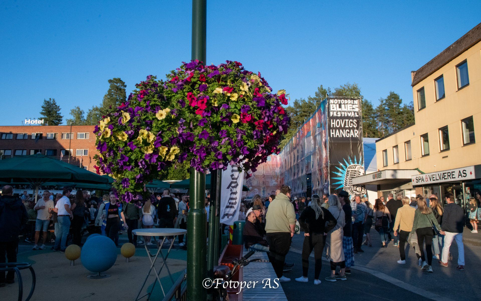 Fine blomsterdekorasjoner. Hovigs Hangar er hovedscenen hvor de største artistene opptrer. Med plass til 6500 under tak, de fleste ståplasser, blir det høy stemning i hangaren. En smugtitt inn på konserten på Missisippi. Mange spesielle bygninger i Notodden.