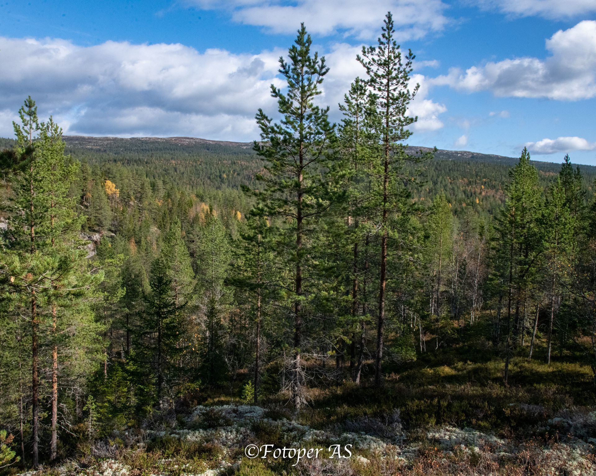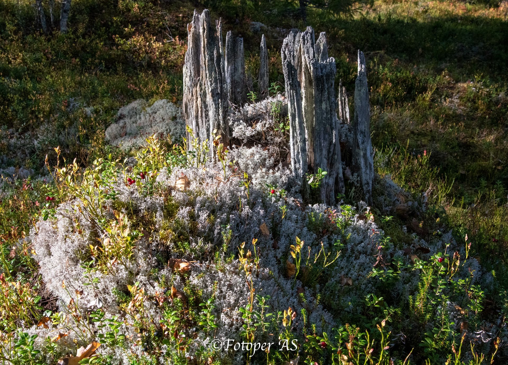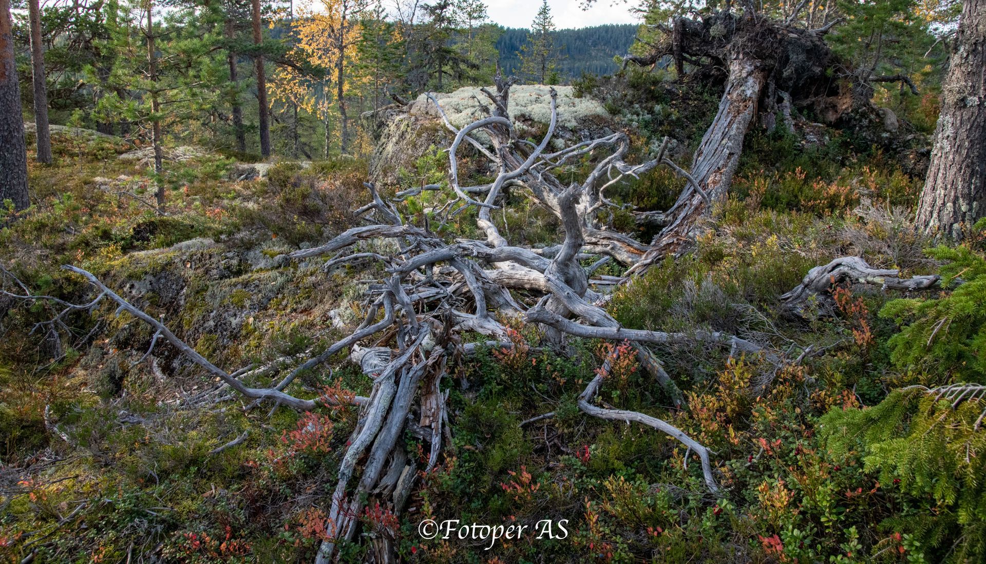 Terrenget vi skal i er høyere opp enn på formiddagsøkta. Elling og jeg skal kjøre innover og gå ved Kollsjøhaugen. Luna har fått hvilt, men halter litt på det ene forbeinet fortsatt. Vi må gjennom et område med tett skog før vi kommer opp i høyden, og får fin utsikt. Jeg begynner å kjenne meg igjen, husker jeg gikk her sammen med Tormod for noen år siden. Her oppe ser vi mot Hestebrenna, Høgfjell, Urdevassfjell, Bukollen, Nautskardfjellet og utover Øvre Kollsjø. Det er fine farger på lyngen og lauvtrærne rundt oss. Masse mørke rød tyttebær, blåbæra begynner å bli litt blaut. Og en haug elgmøkk tyder på at elgen nylig har vært her. Mange gamle trær og røtter som har sin sjarme etter vær og vind i mange tiår.