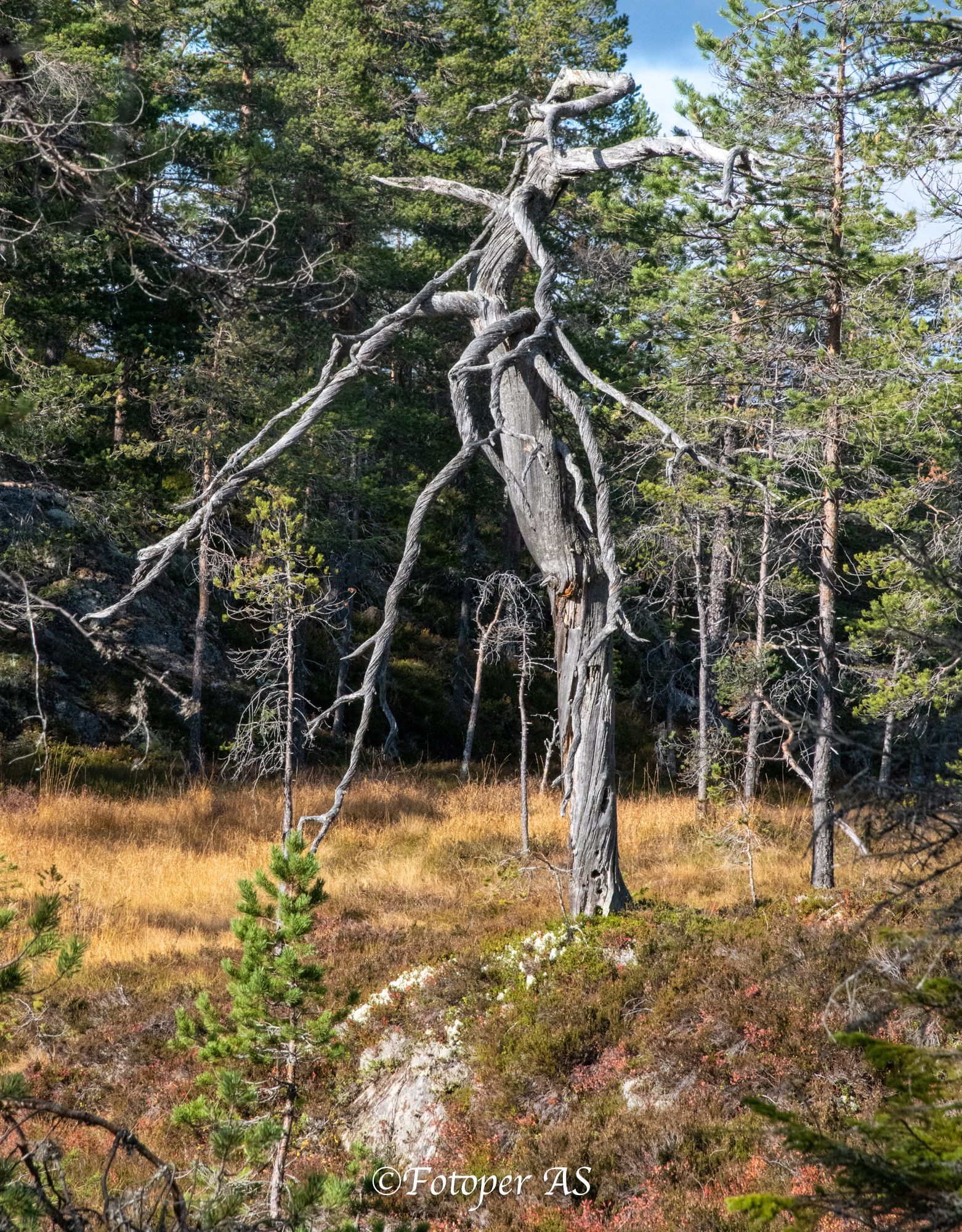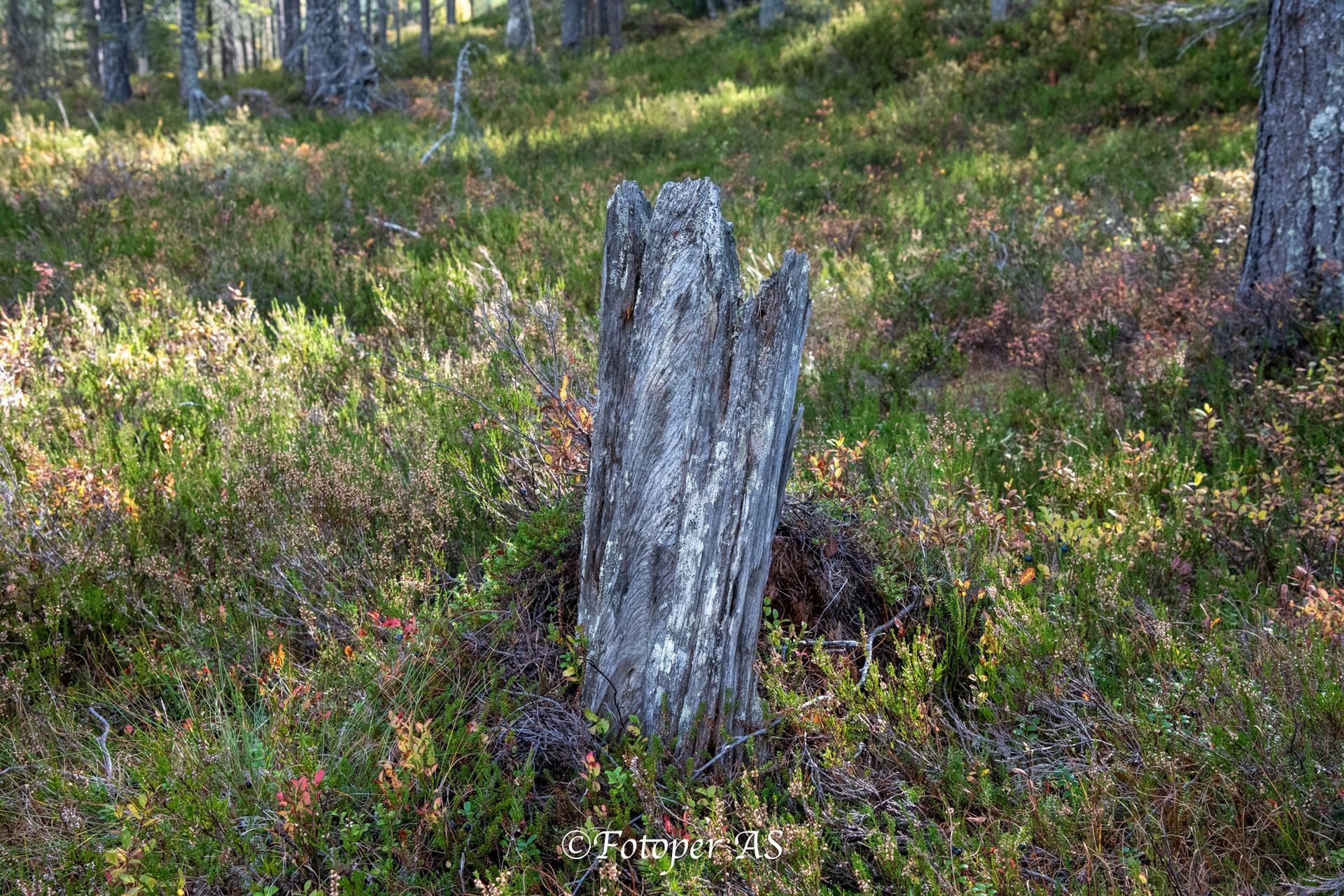 Nå drar Luna av sted i en annen retning, mot der Jonas og Steinar går med bikkje. Vi må ned til bilen, og kjøre lenger innover. Heldigvis har vi fin vei å gå på ned til bilen. Mot oss kan vi se Norefjell mellom trærne. Elling stopper stadig og sjekker hvor Luna og de andre bikkjene er. Jeg finner et gammelt tre som har vært bolig for mang en fugl.