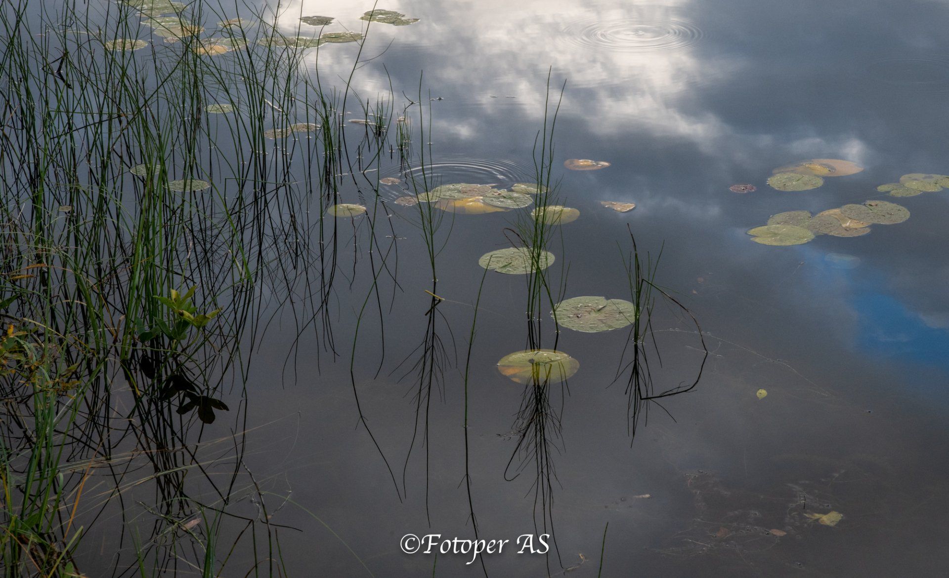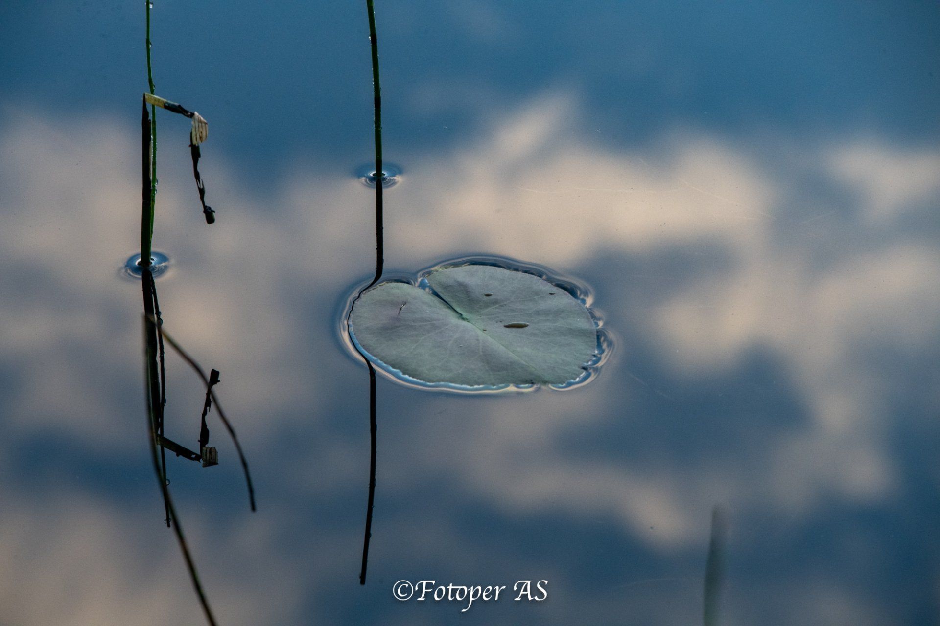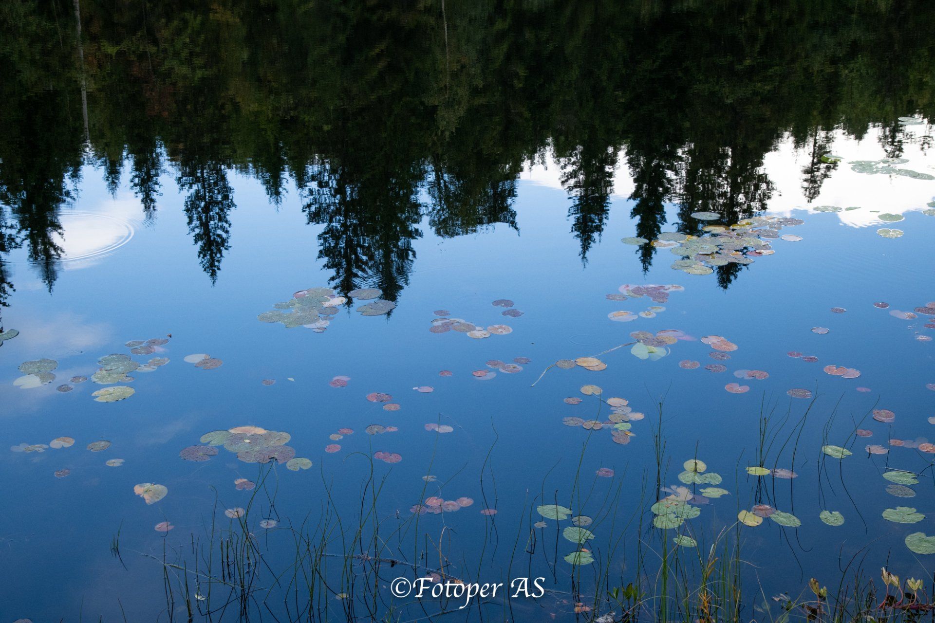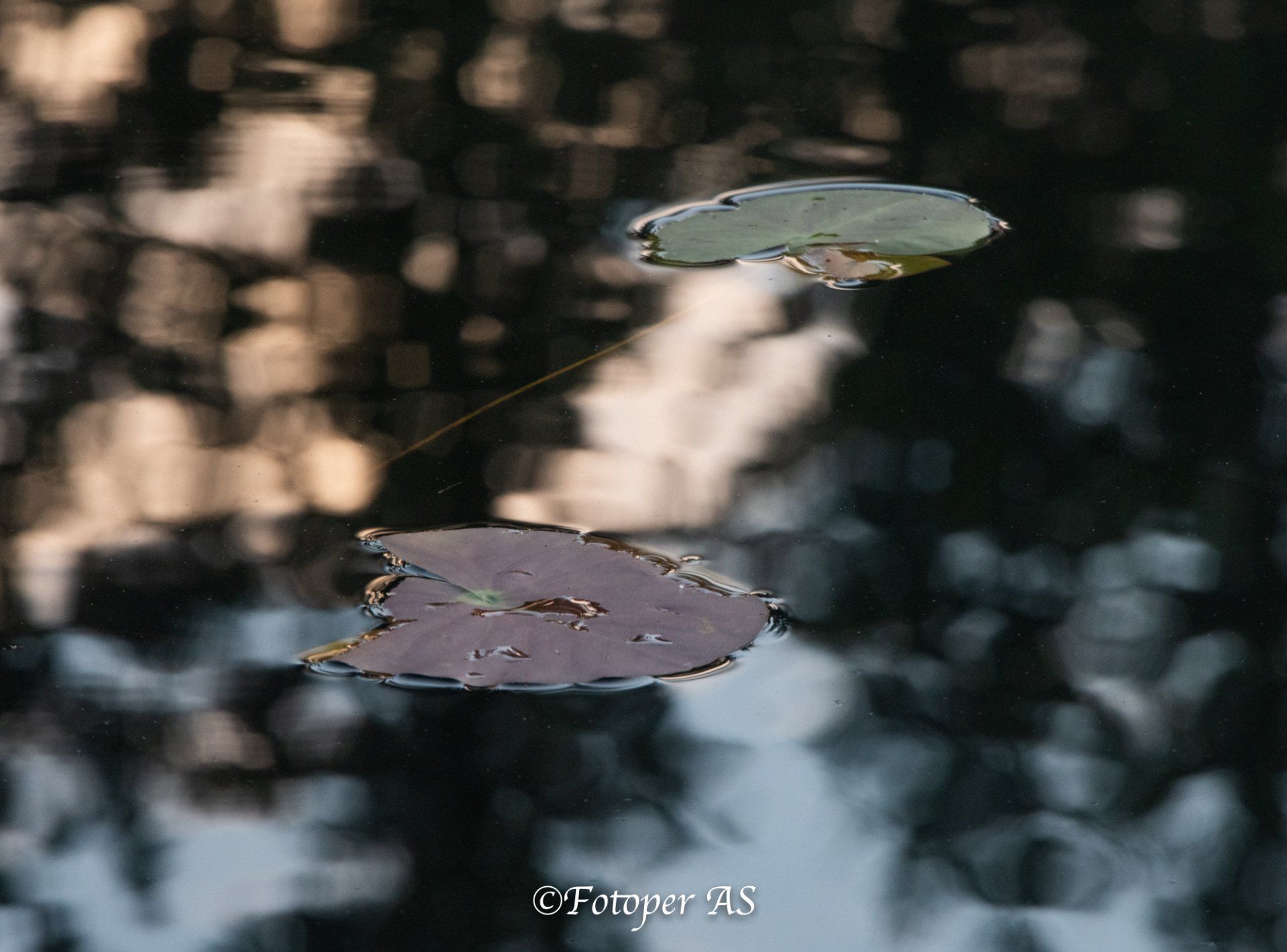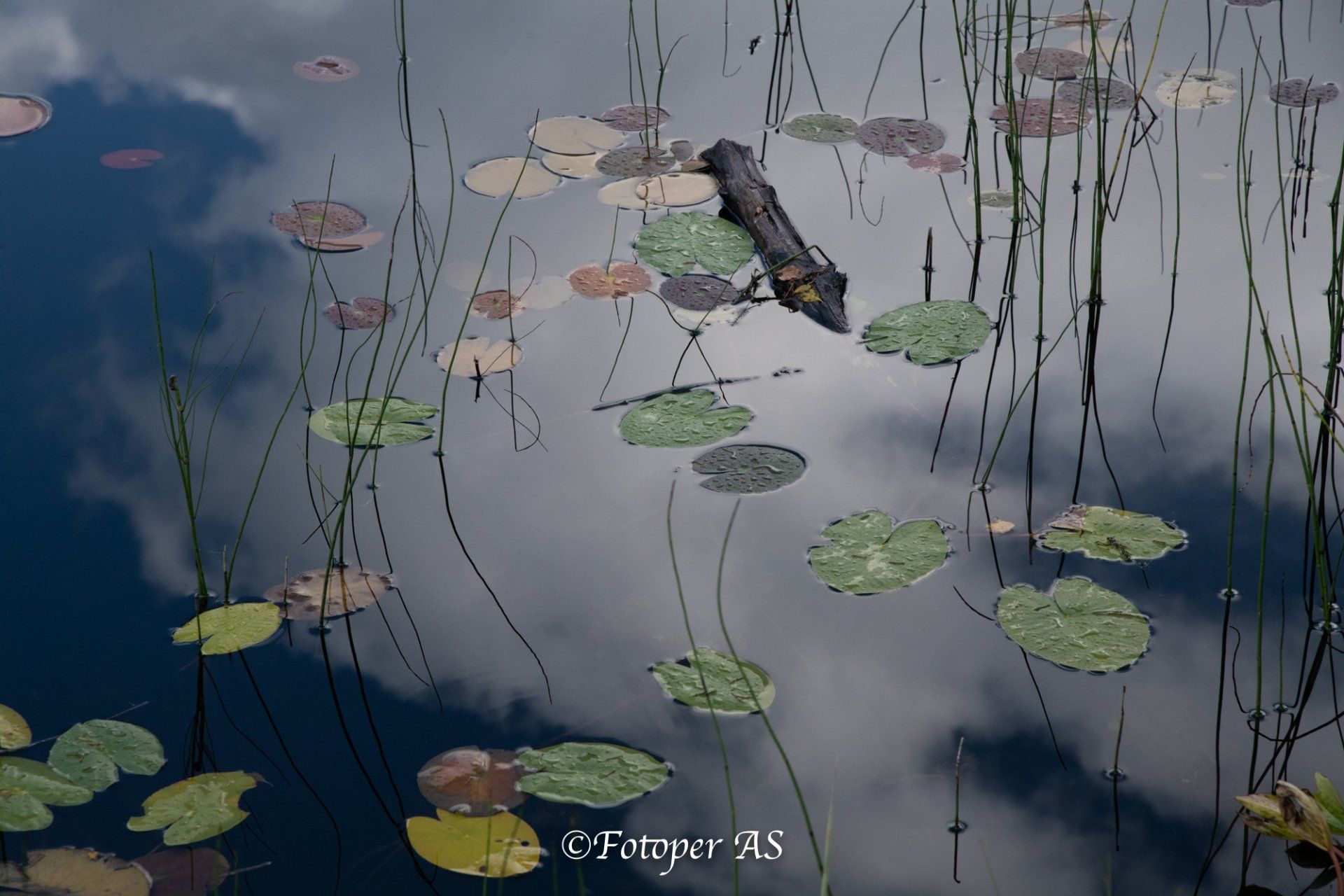 Jeg har noe søppel jeg skal bære ned til bilen, og tar selvsagt med kamera også. Det er fortsatt vindstille, og da kan det være flott ved Nordsetertjernet. Det er fargerike vanliljeblader langs kantene, blomstene er borte. Men motivene er der.