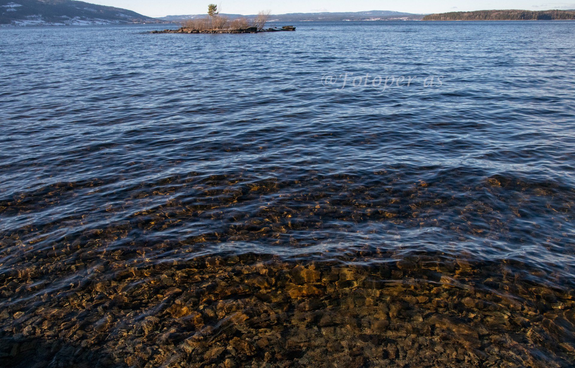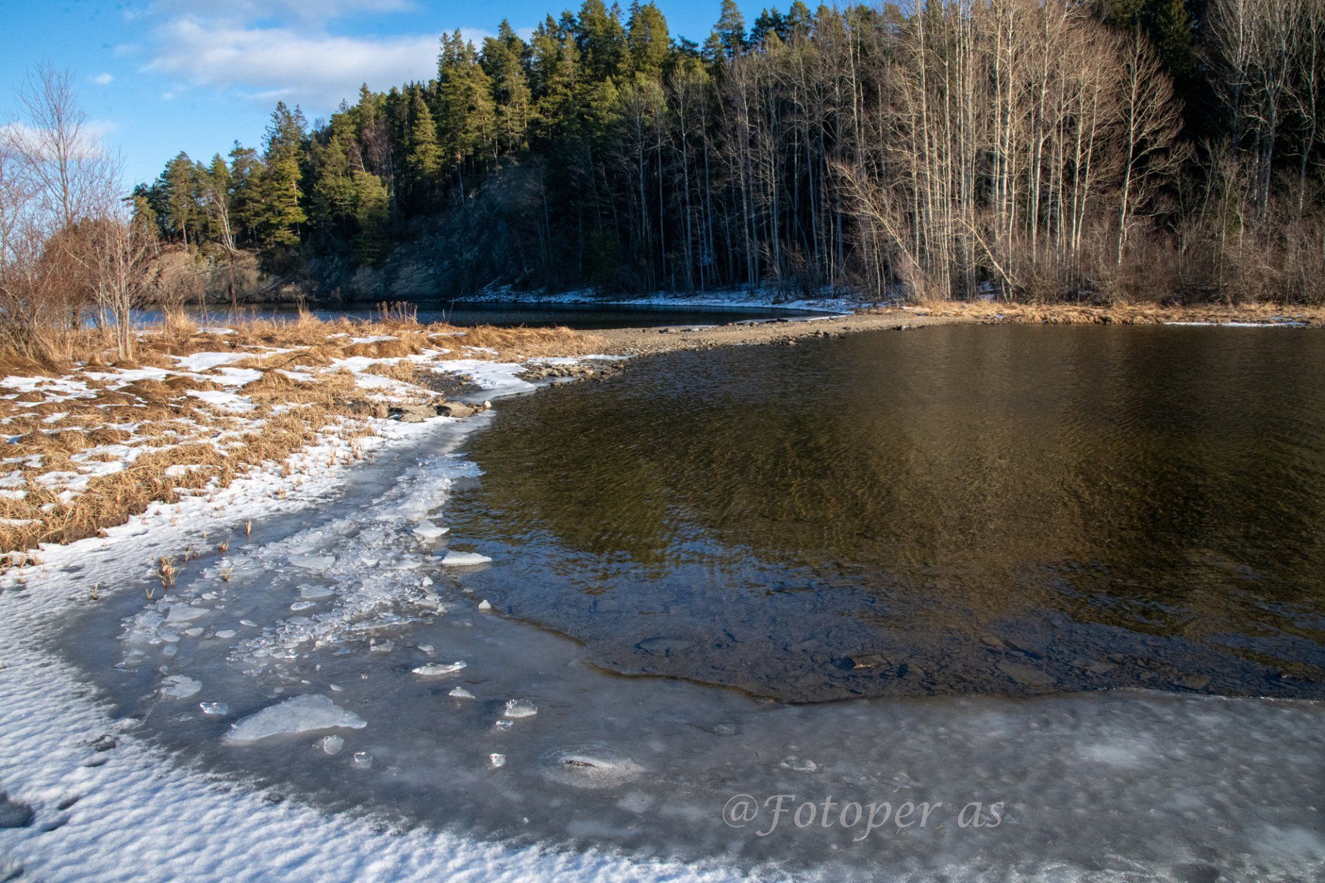 Her er det kjørt opp skiløype og det er veldig glatt i den. Jeg fortsetter videre langs stranda, har tenkt å gå rundt Storøya. Når jeg kommer til sundet ved Purkøya og Storøya ser jeg at det er så lite vann at det går å komme seg tørrskodd over nå. Da jeg var her for et år siden lå det tjukk is rundt hele øya og i sundet her.