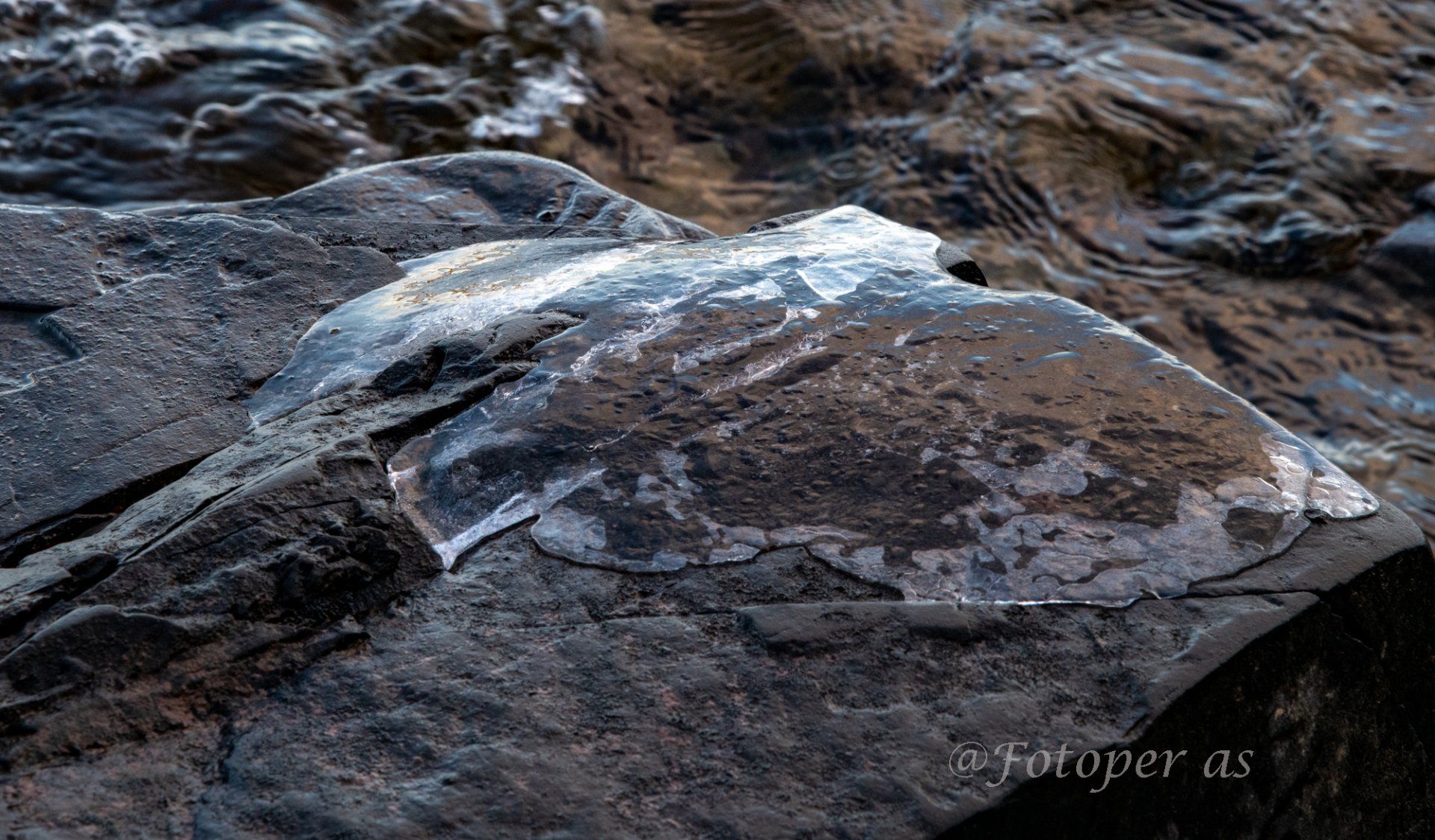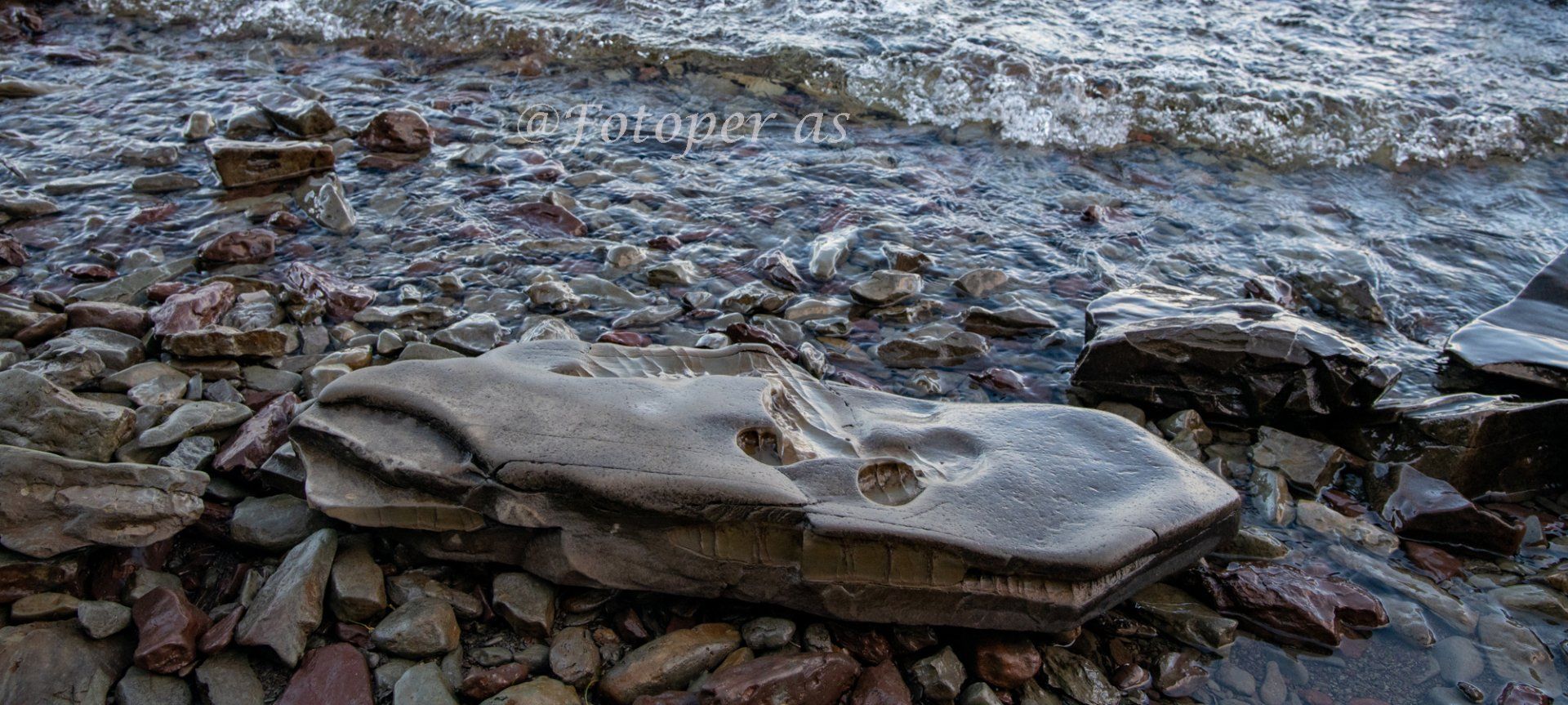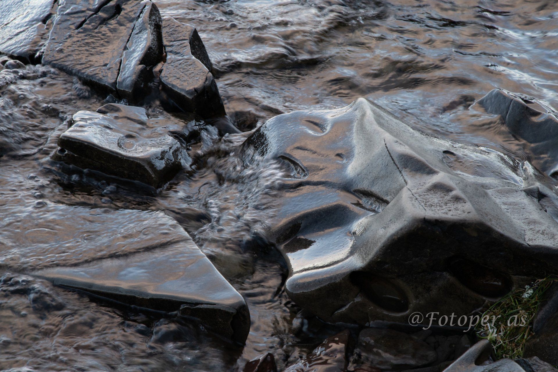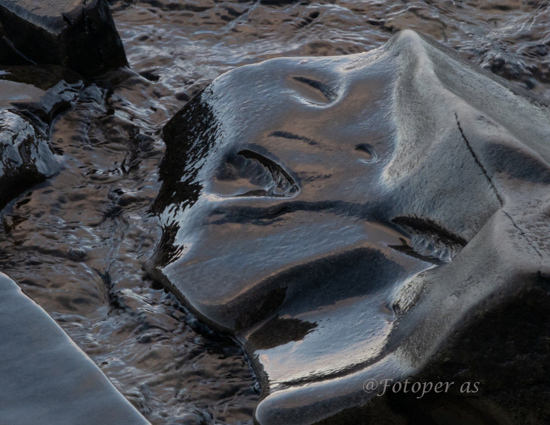 Videre finner jeg mange fine steiner, noen små og runde, noe glatte, noe store og ruglete. Det er is på noen av steinene og alle med vann på er glatte. I en av steinene jeg finner ser jeg et "ansikt", det har sikkert formet seg i løpet av mange, mange år.