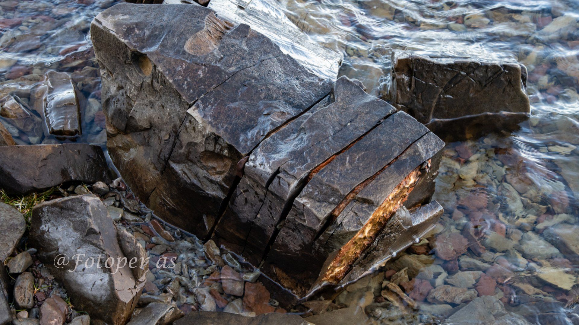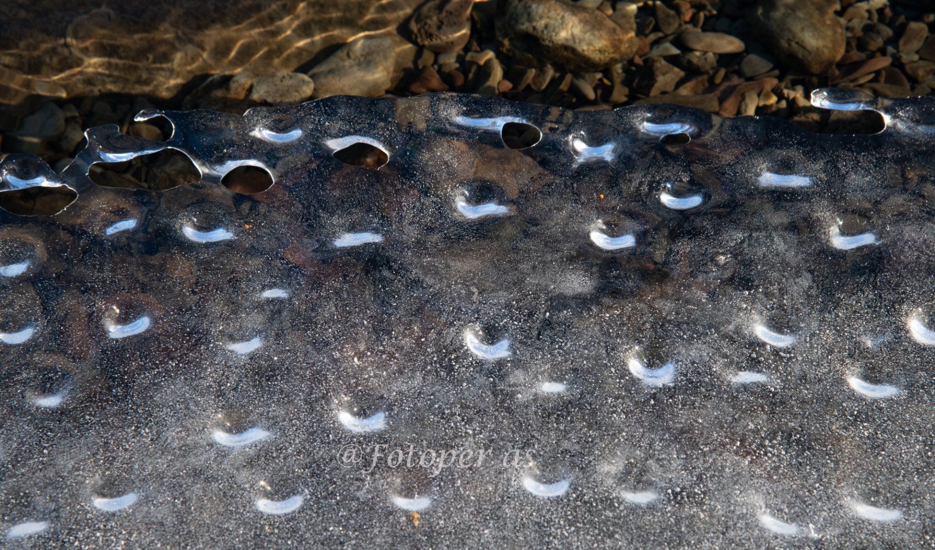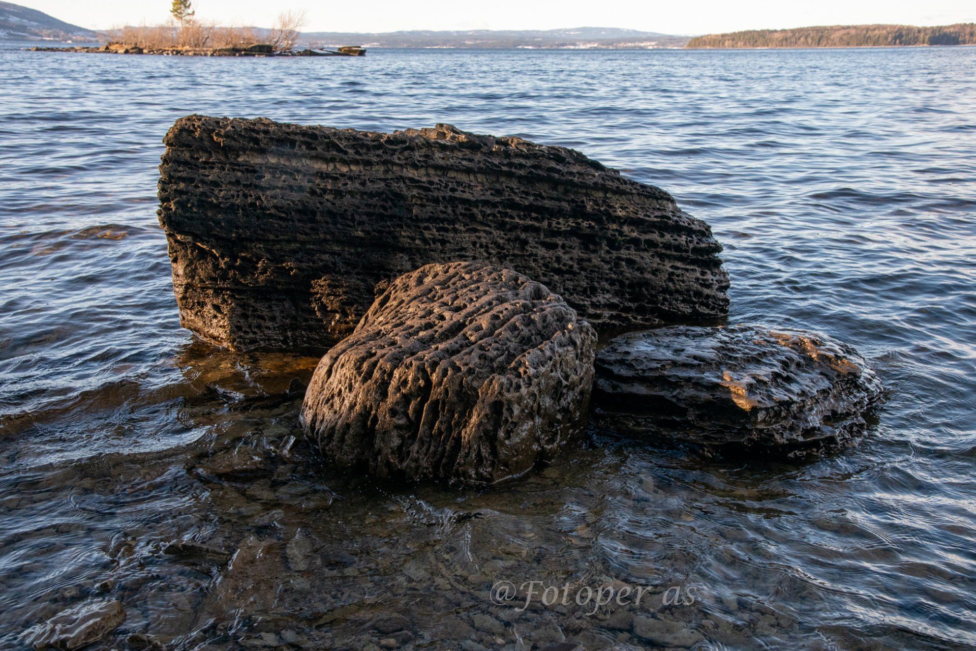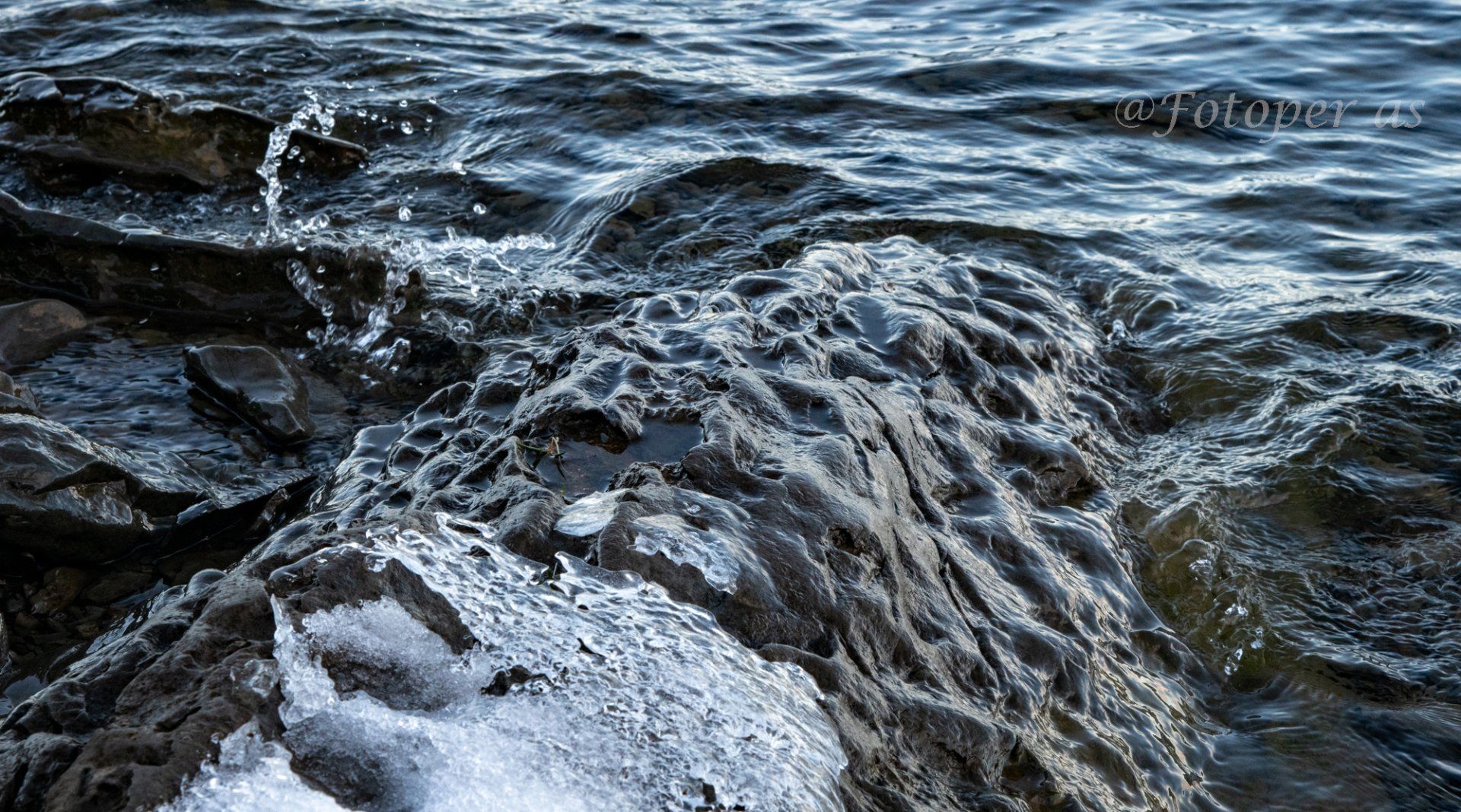 Videre finner jeg mange fine steiner, noen små og runde, noe glatte, noe store og ruglete. Det er is på noen av steinene og alle med vann på er glatte. I en av steinene jeg finner ser jeg et "ansikt", det har sikkert formet seg i løpet av mange, mange år.